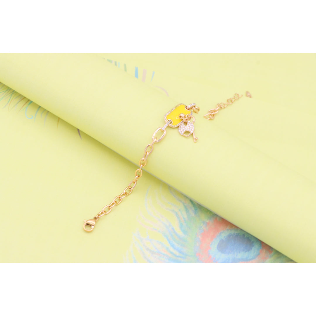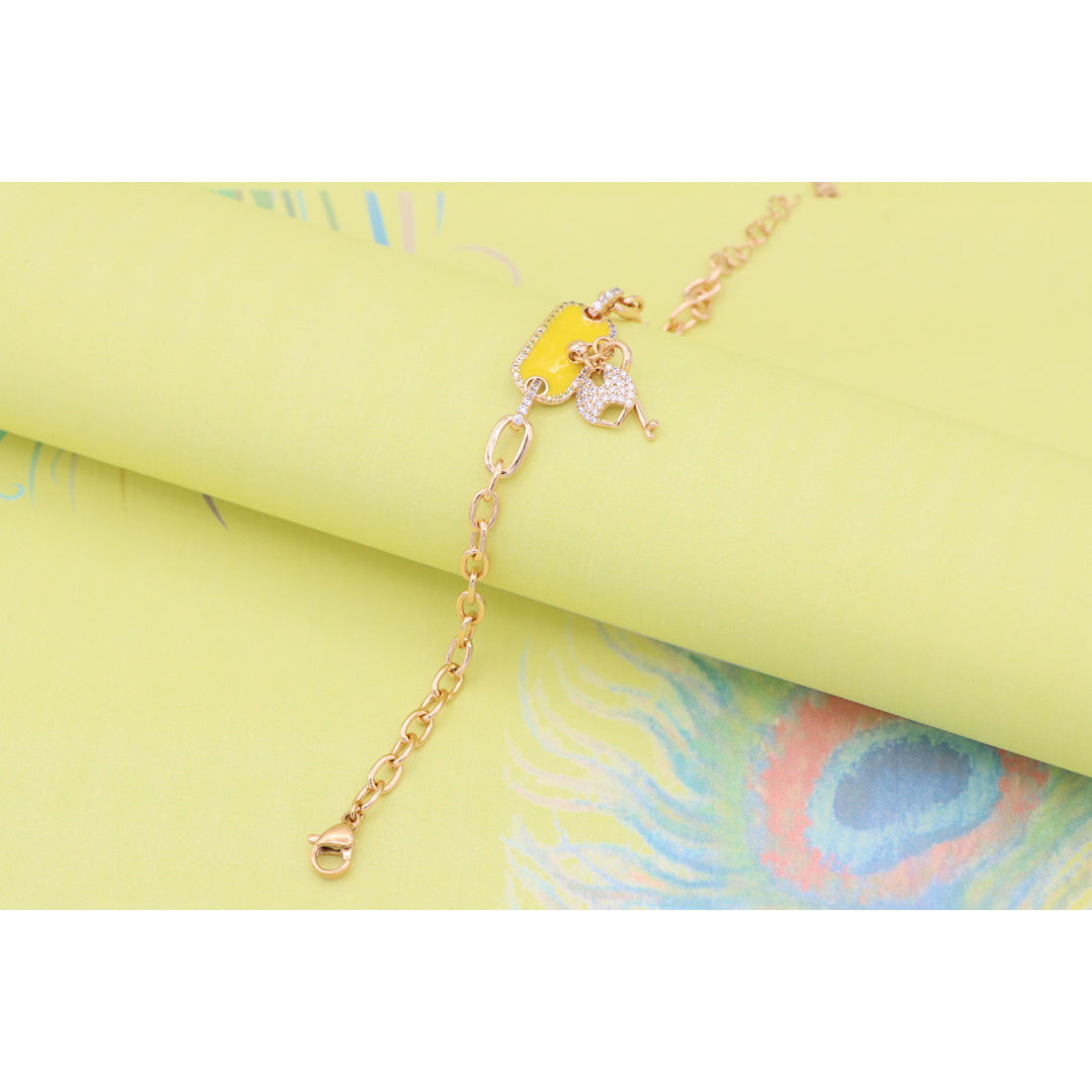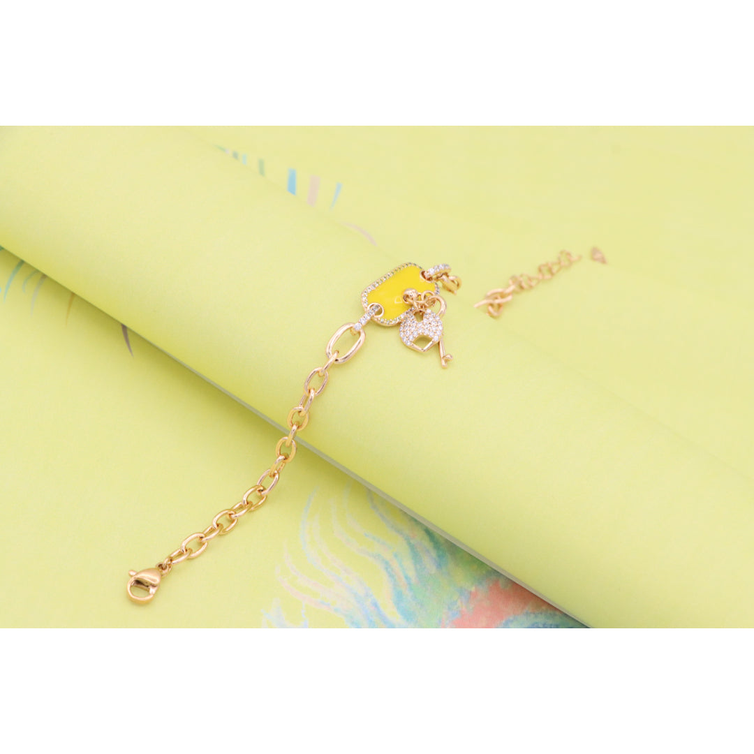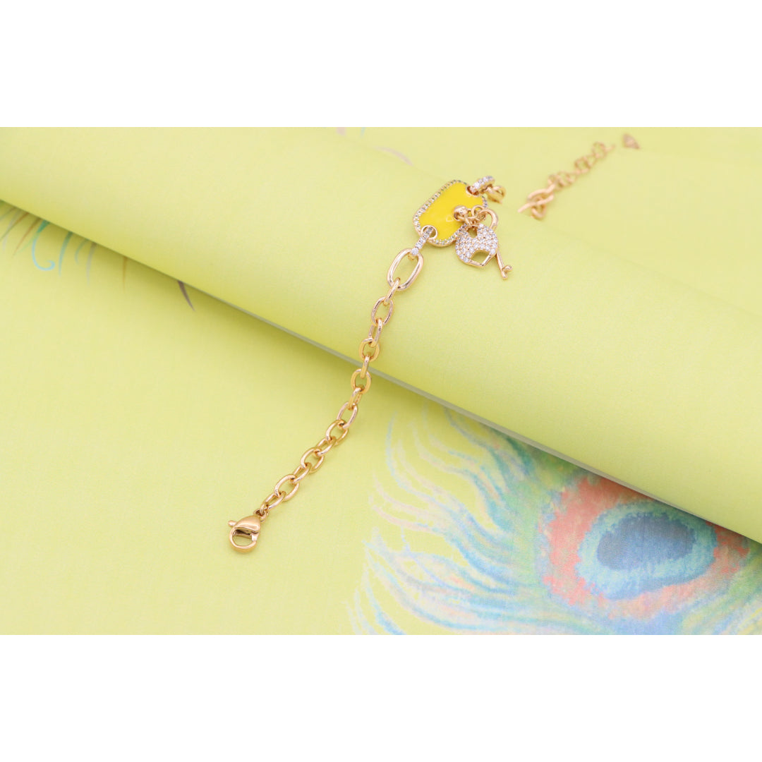 Elevate your look with this charming rose gold bracelet featuring a vibrant yellow charm and dazzling lock-and-key accents.