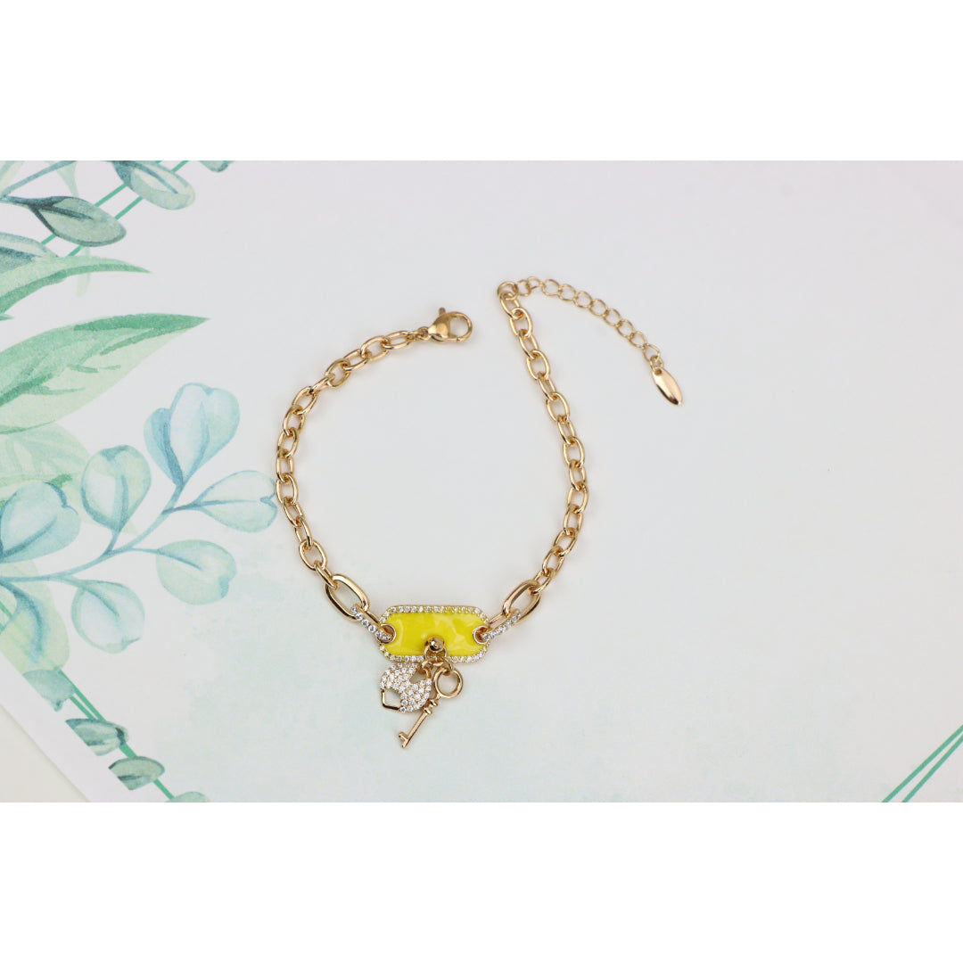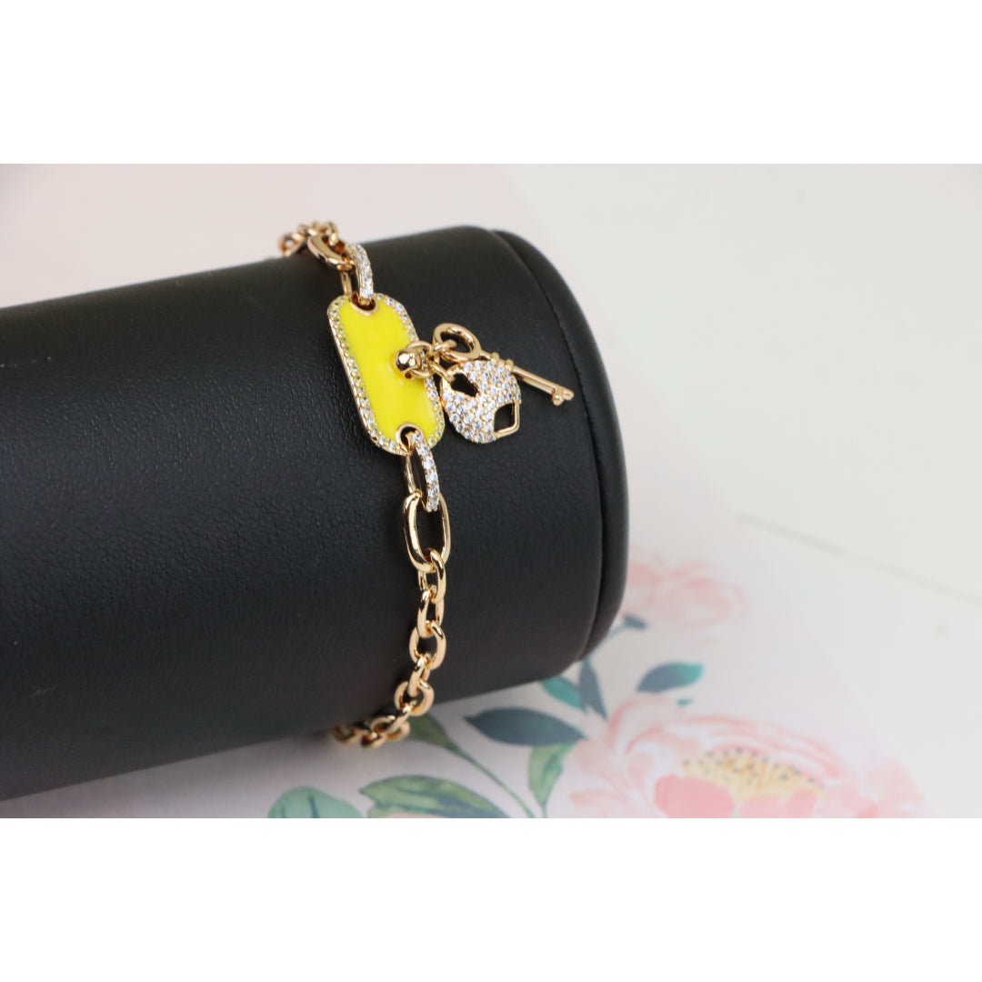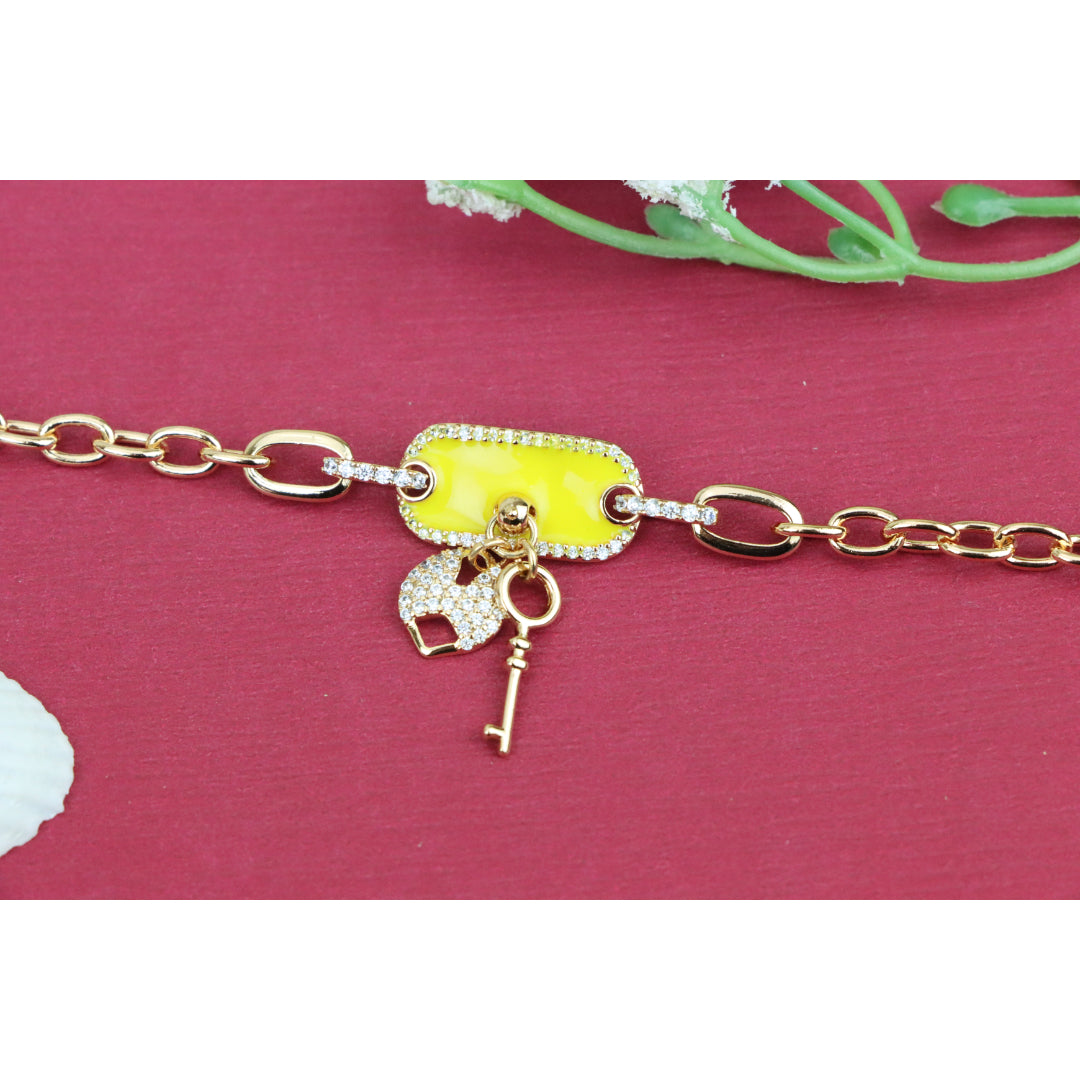 Elevate your look with this charming rose gold bracelet featuring a vibrant yellow charm and dazzling lock-and-key accents.