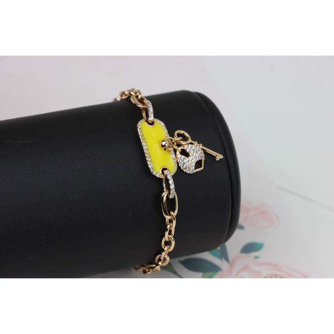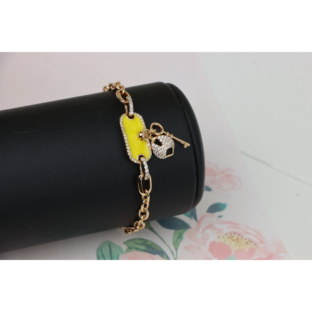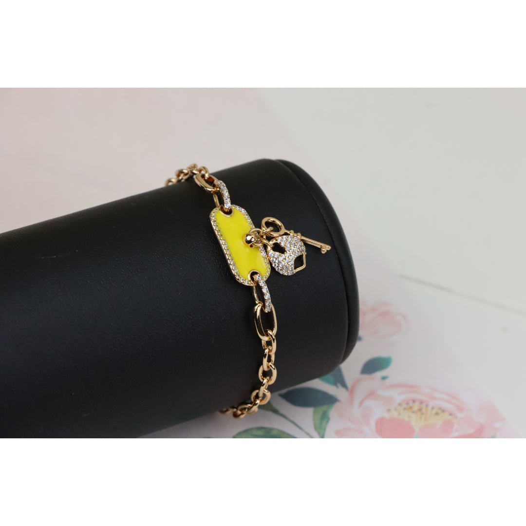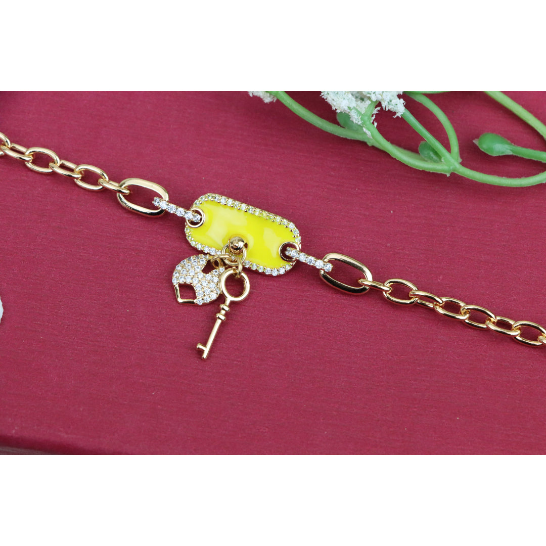Elevate your look with this charming rose gold bracelet featuring a vibrant yellow charm and dazzling lock-and-key accents.