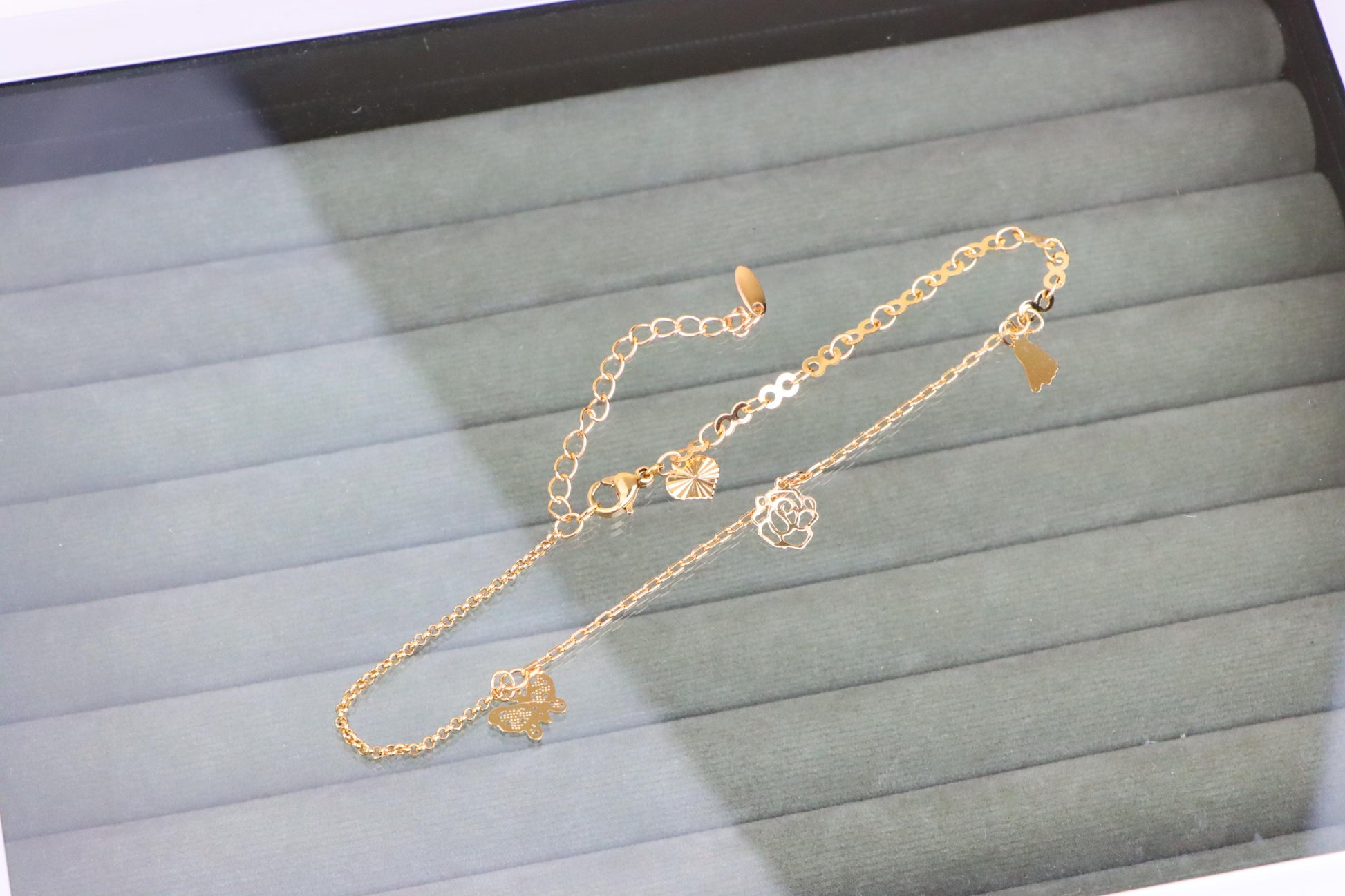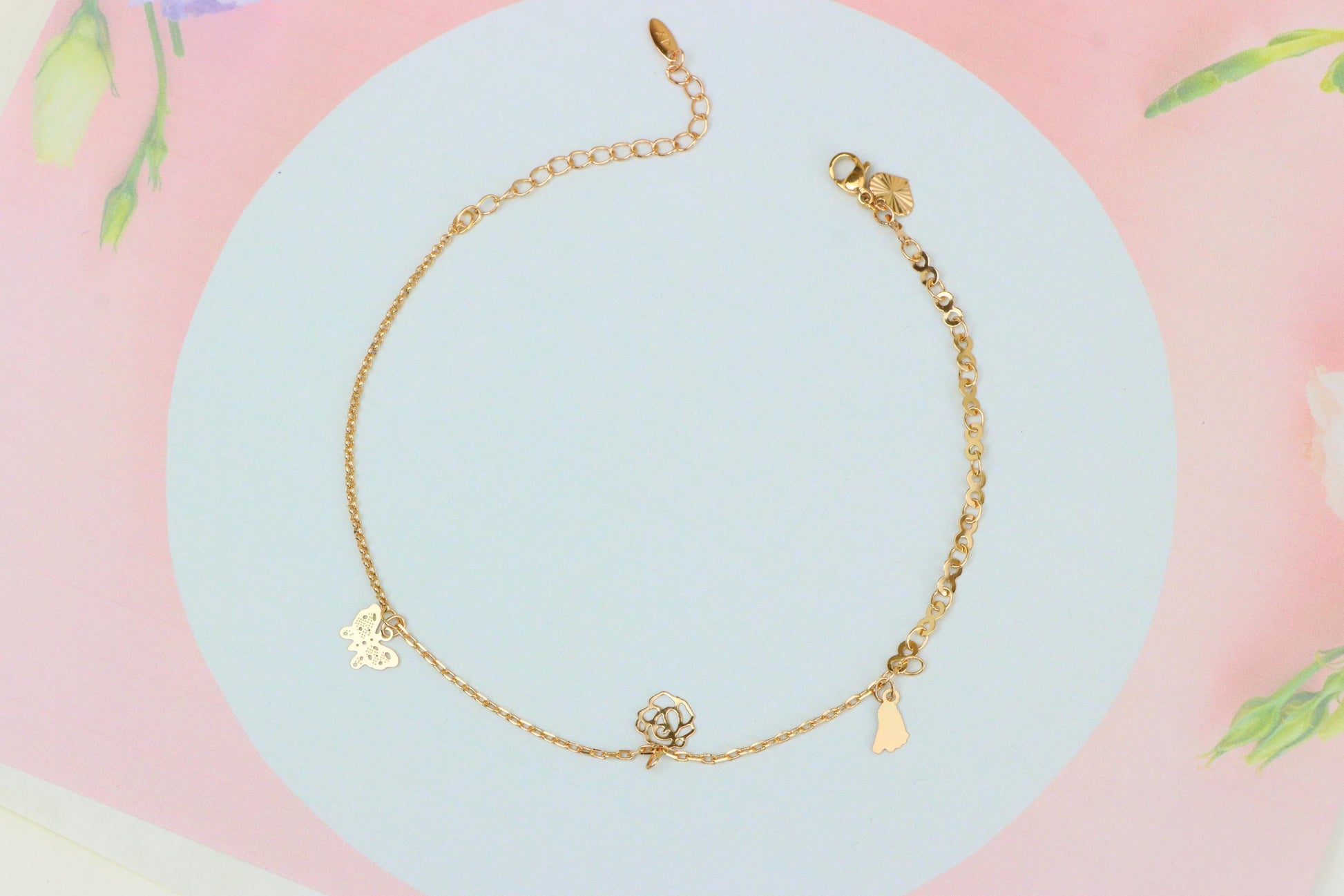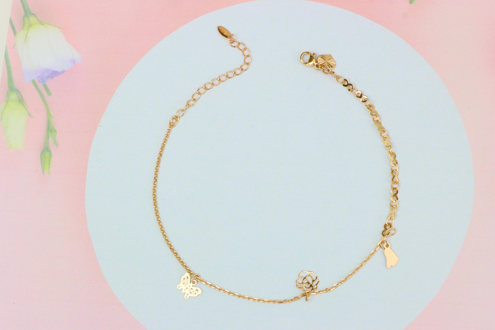 Chic rose gold anklet crafted with gold-plated high-quality brass, featuring butterfly, rose, and bell-shaped charms. Length is 24cm + 5cm extender (9.45 + 1.97 inches), perfect for a personalized fit.