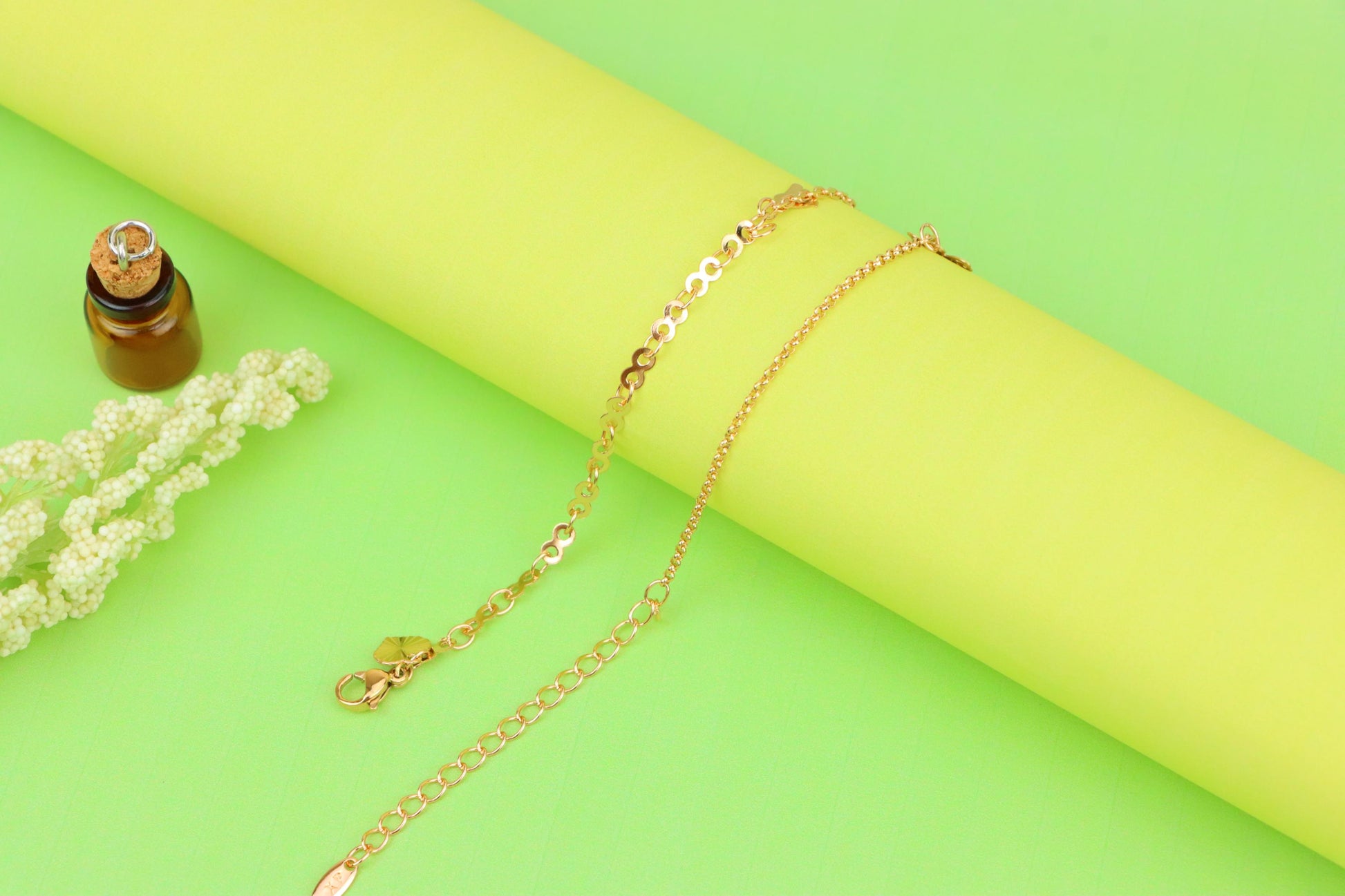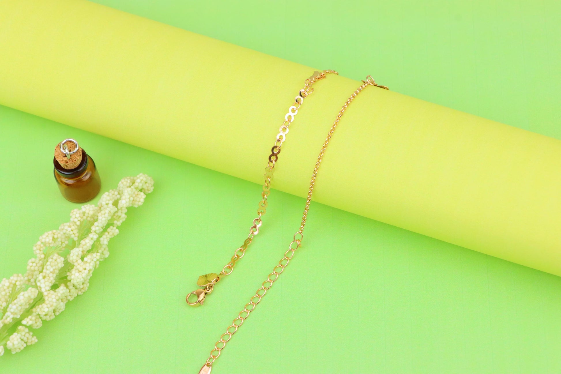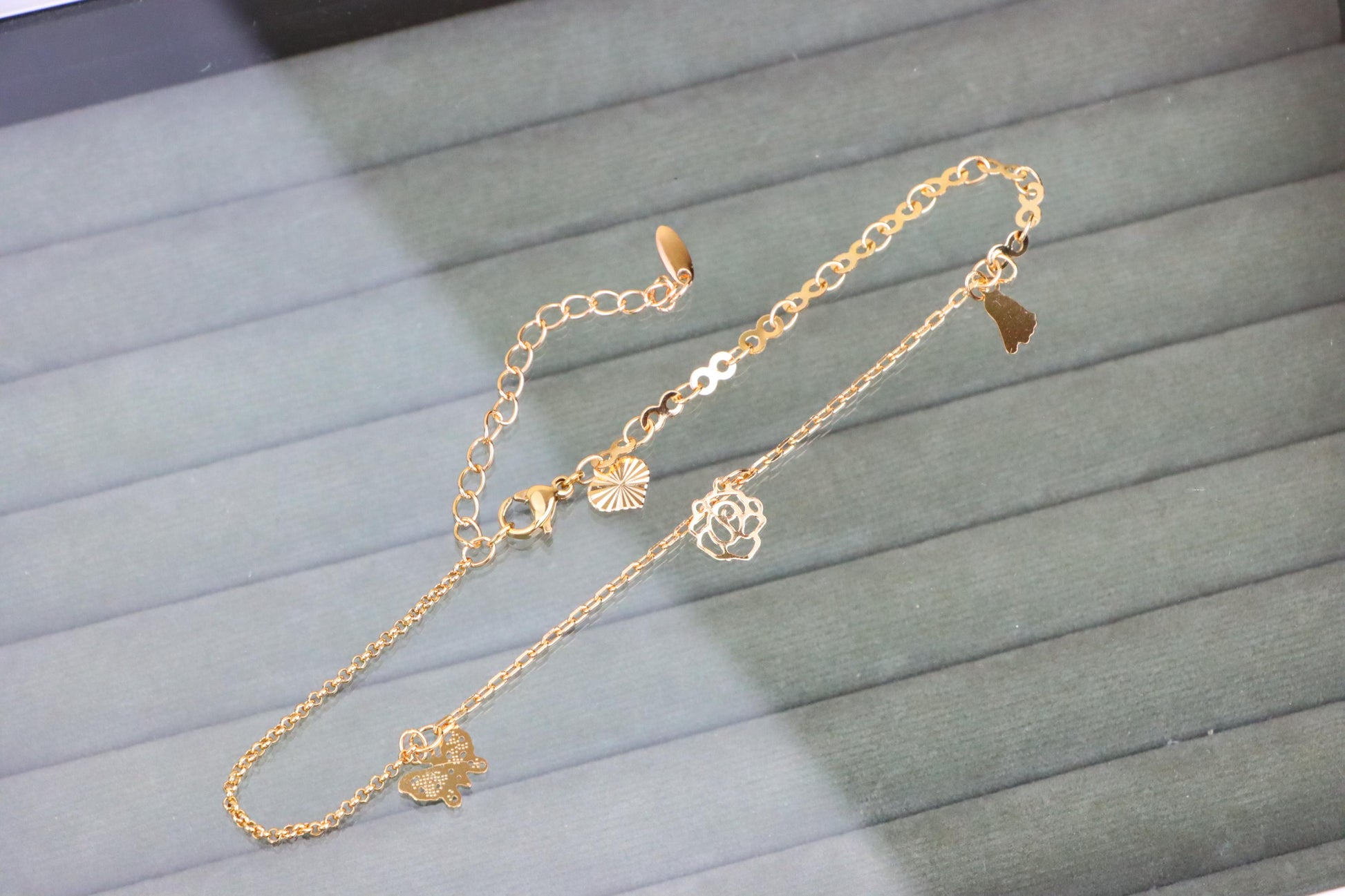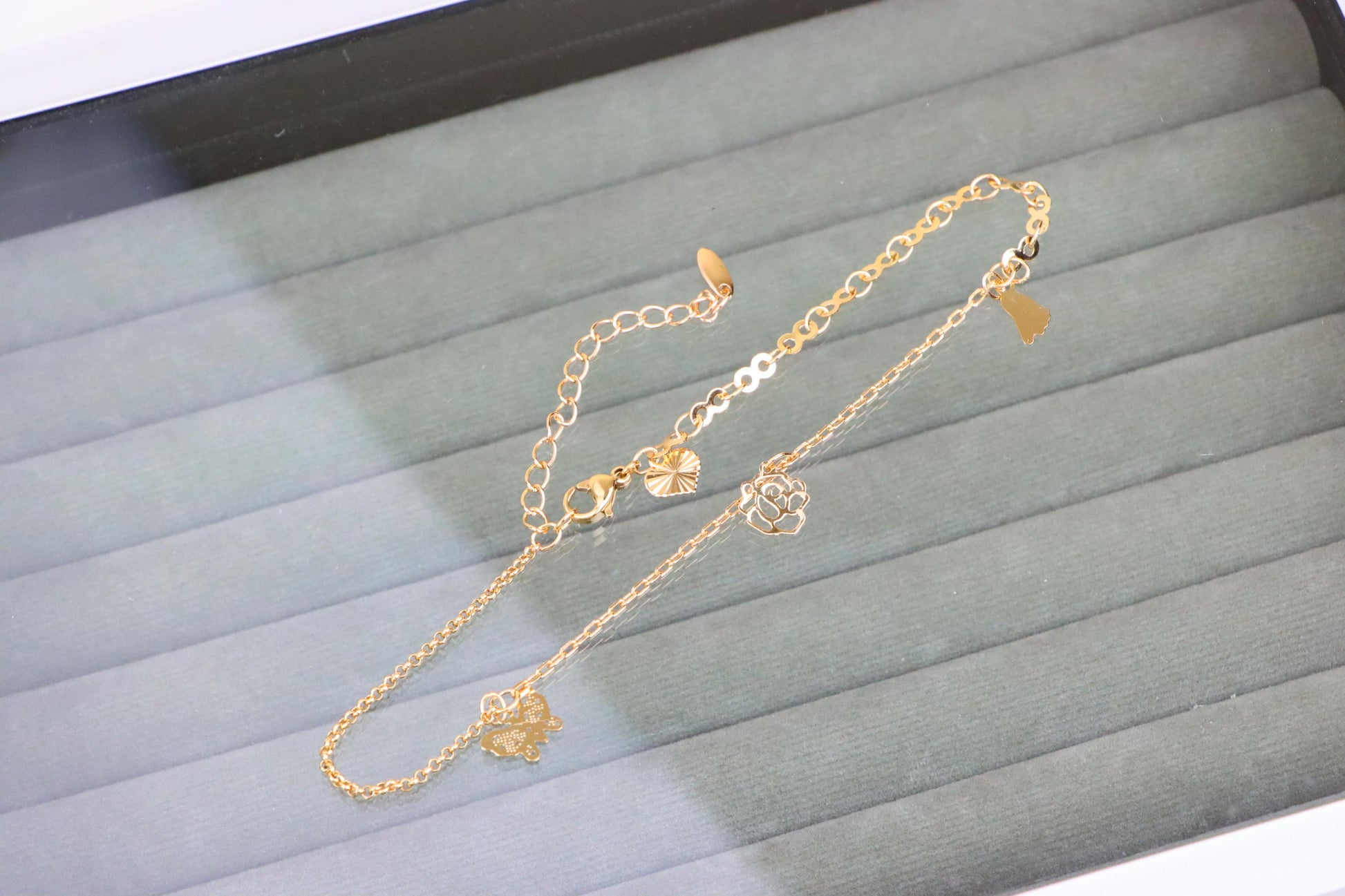 Chic rose gold anklet crafted with gold-plated high-quality brass, featuring butterfly, rose, and bell-shaped charms. Length is 24cm + 5cm extender (9.45 + 1.97 inches), perfect for a personalized fit.