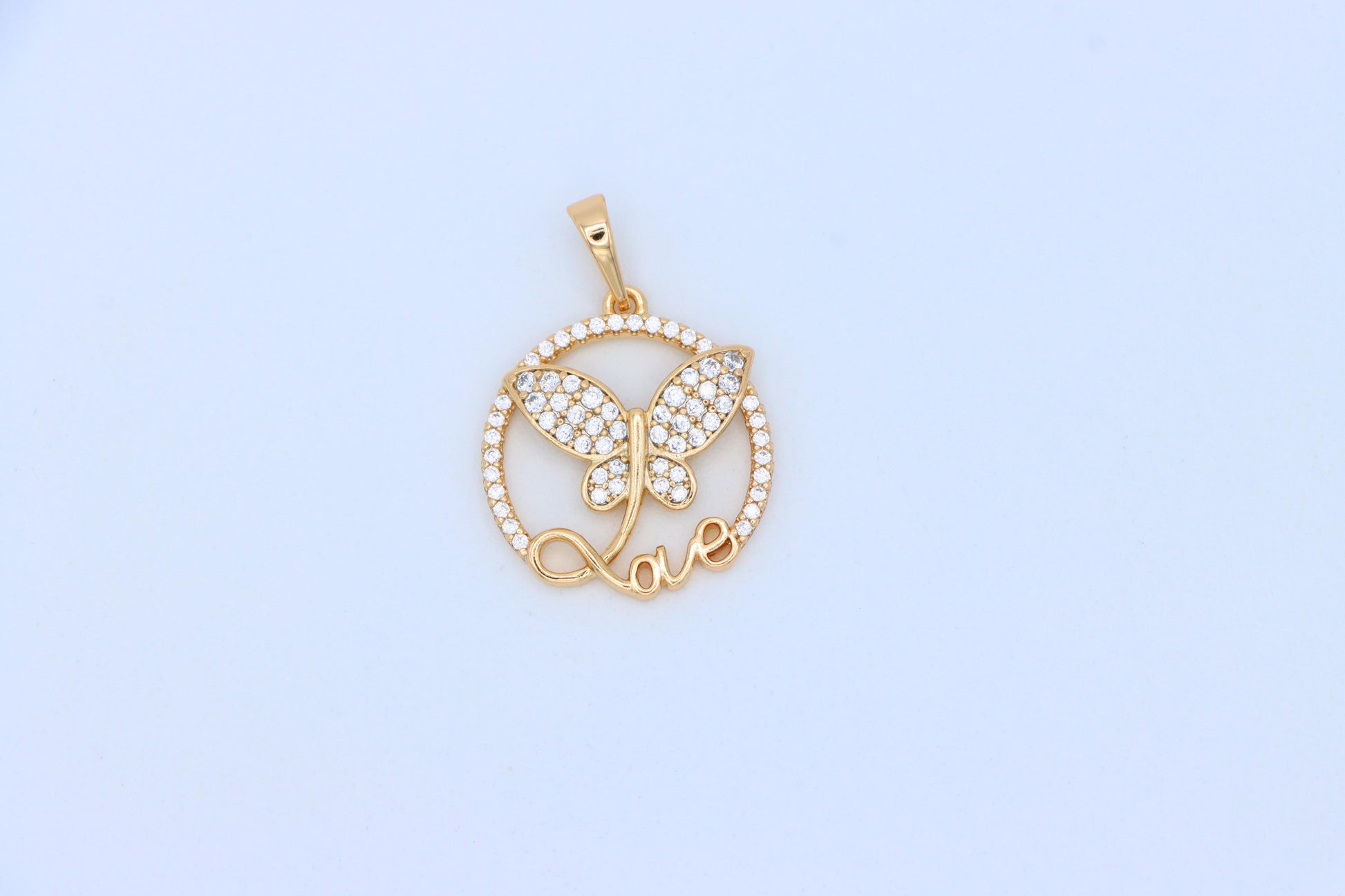 Elegant rose gold pendant featuring a butterfly and "love" design, crafted with sparkling crystals and perfect for everyday wear or gifting.