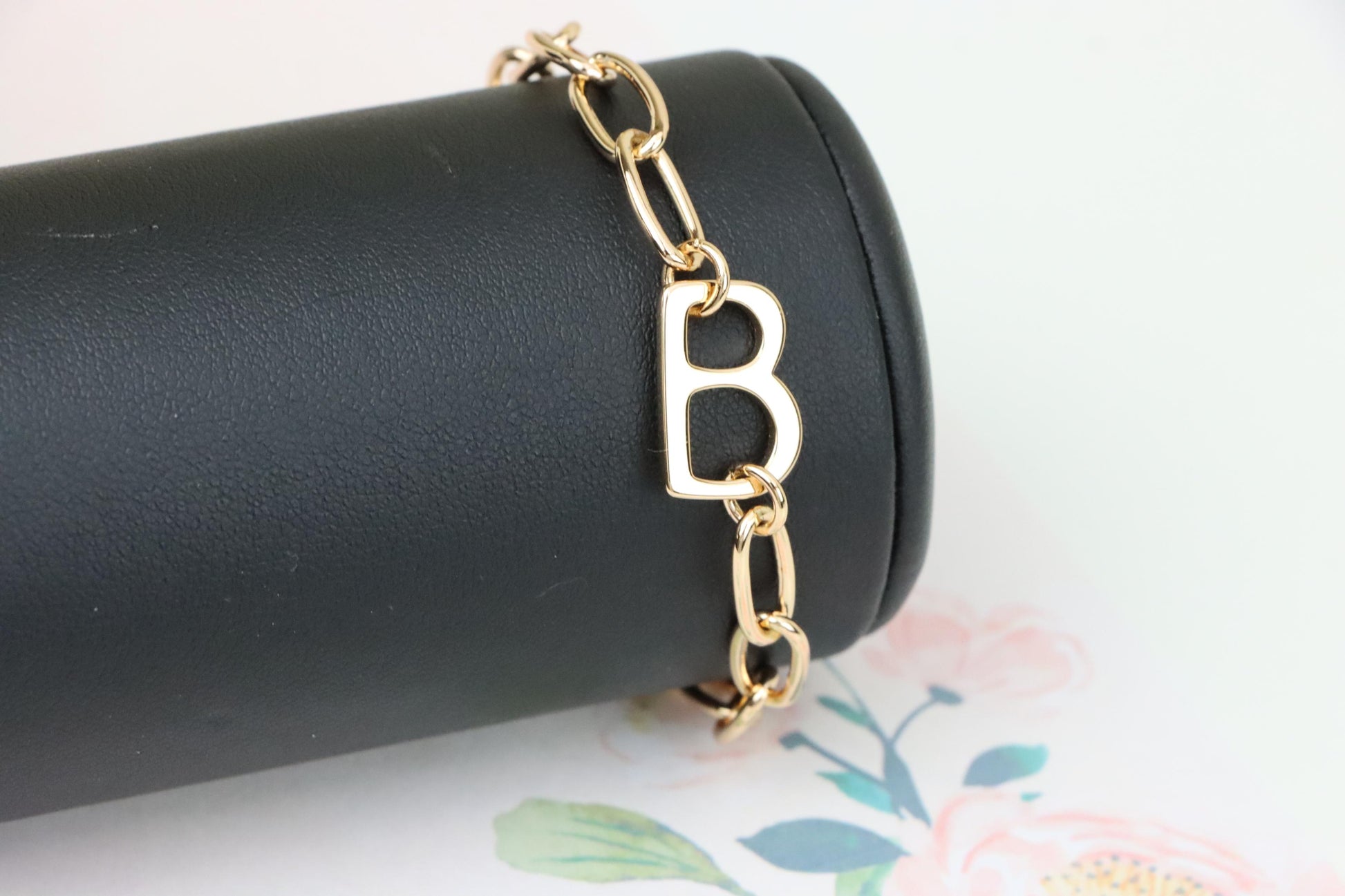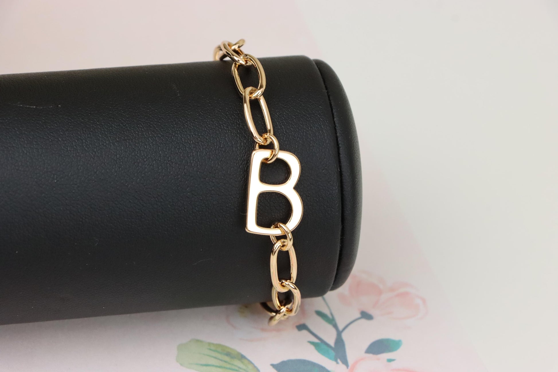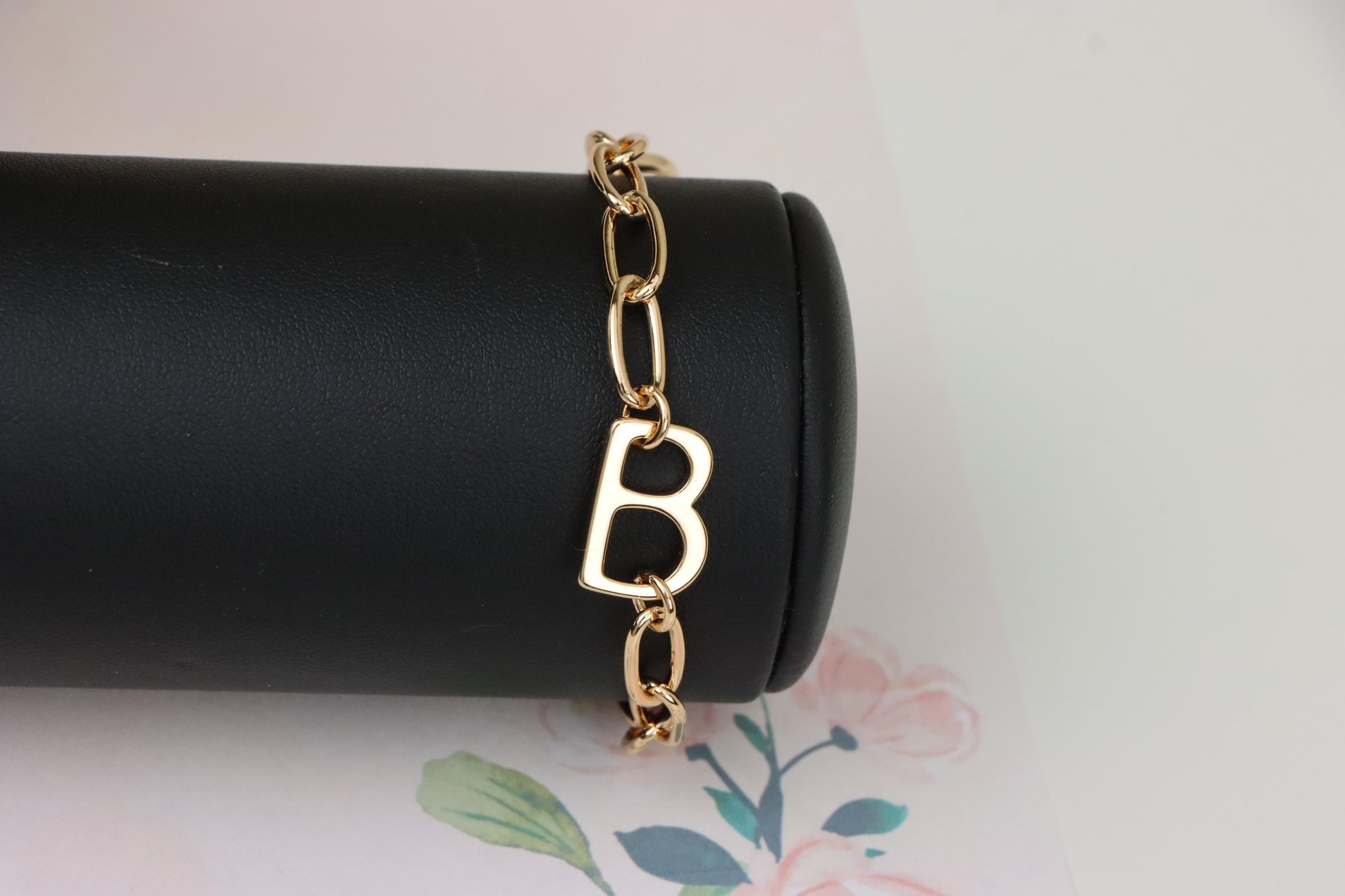 Elegant rose gold bracelet with a personalized 'B' initial charm, crafted from high-quality brass and finished with a gold plating. Adjustable fit with extender for comfort and versatility.