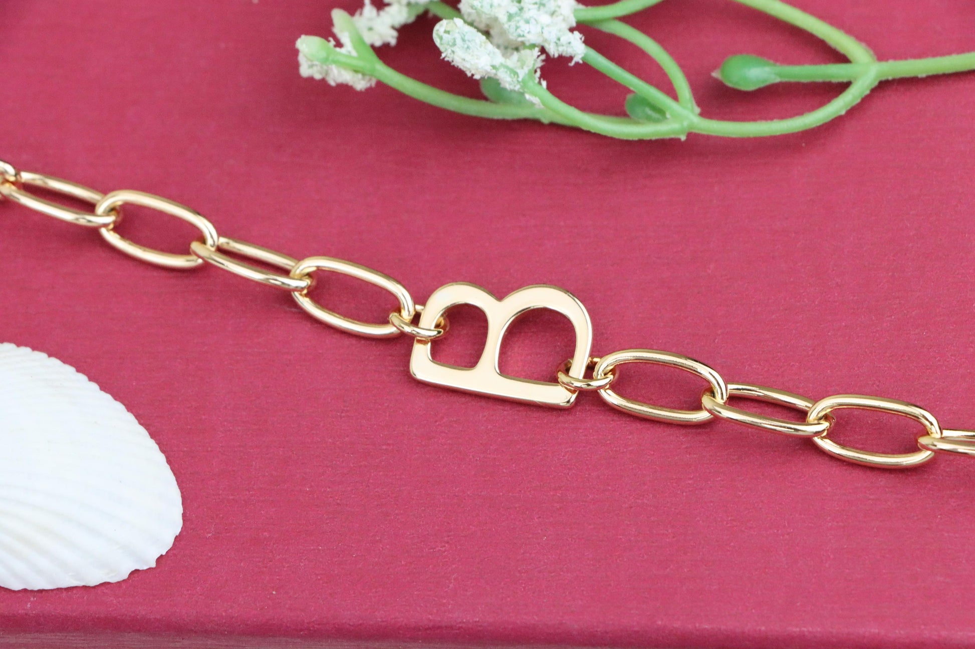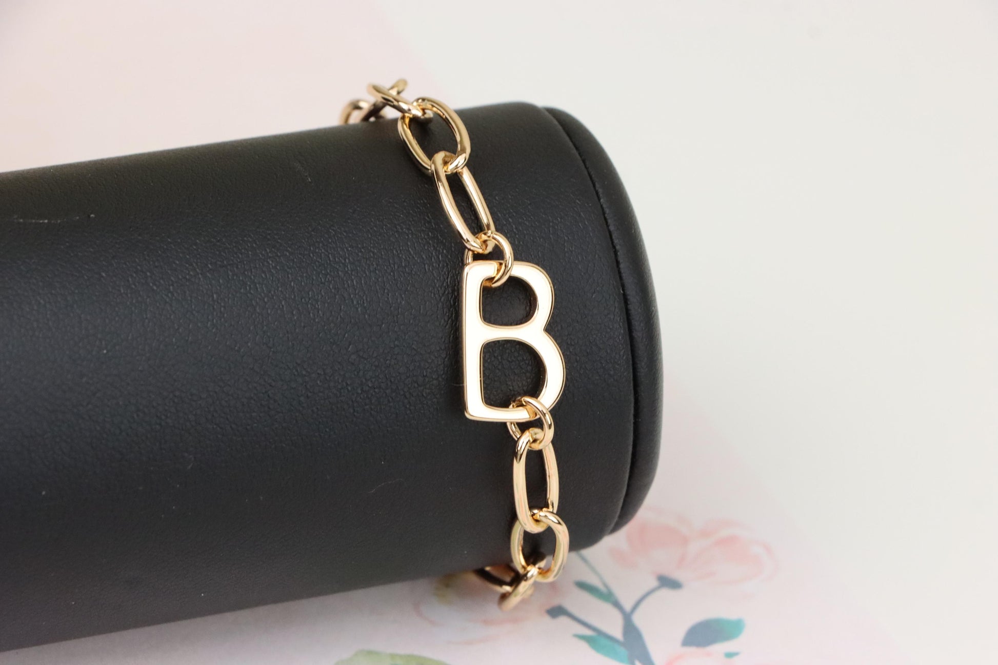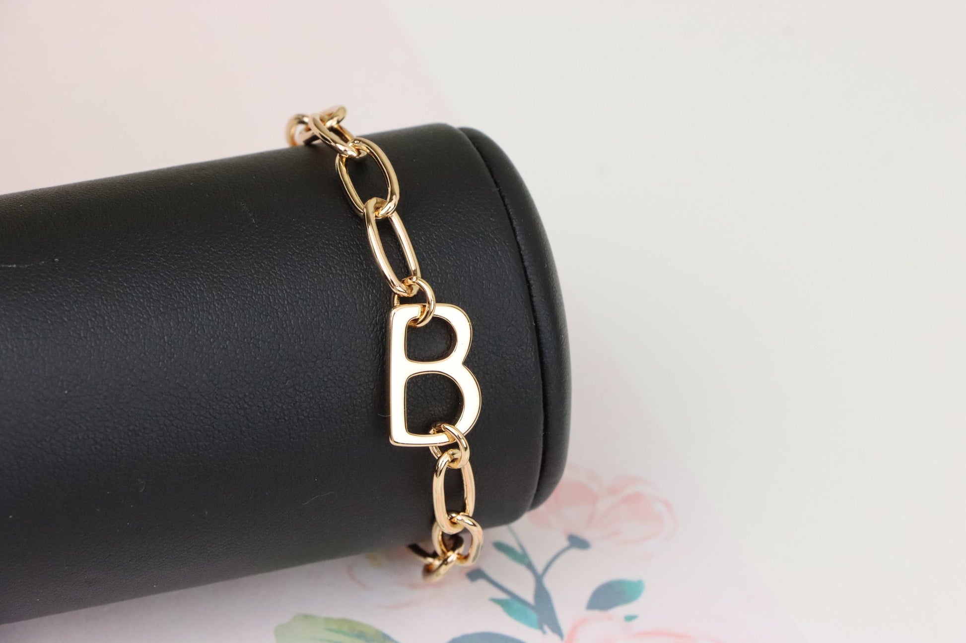 Elegant rose gold bracelet with a personalized 'B' initial charm, crafted from high-quality brass and finished with a gold plating. Adjustable fit with extender for comfort and versatility.