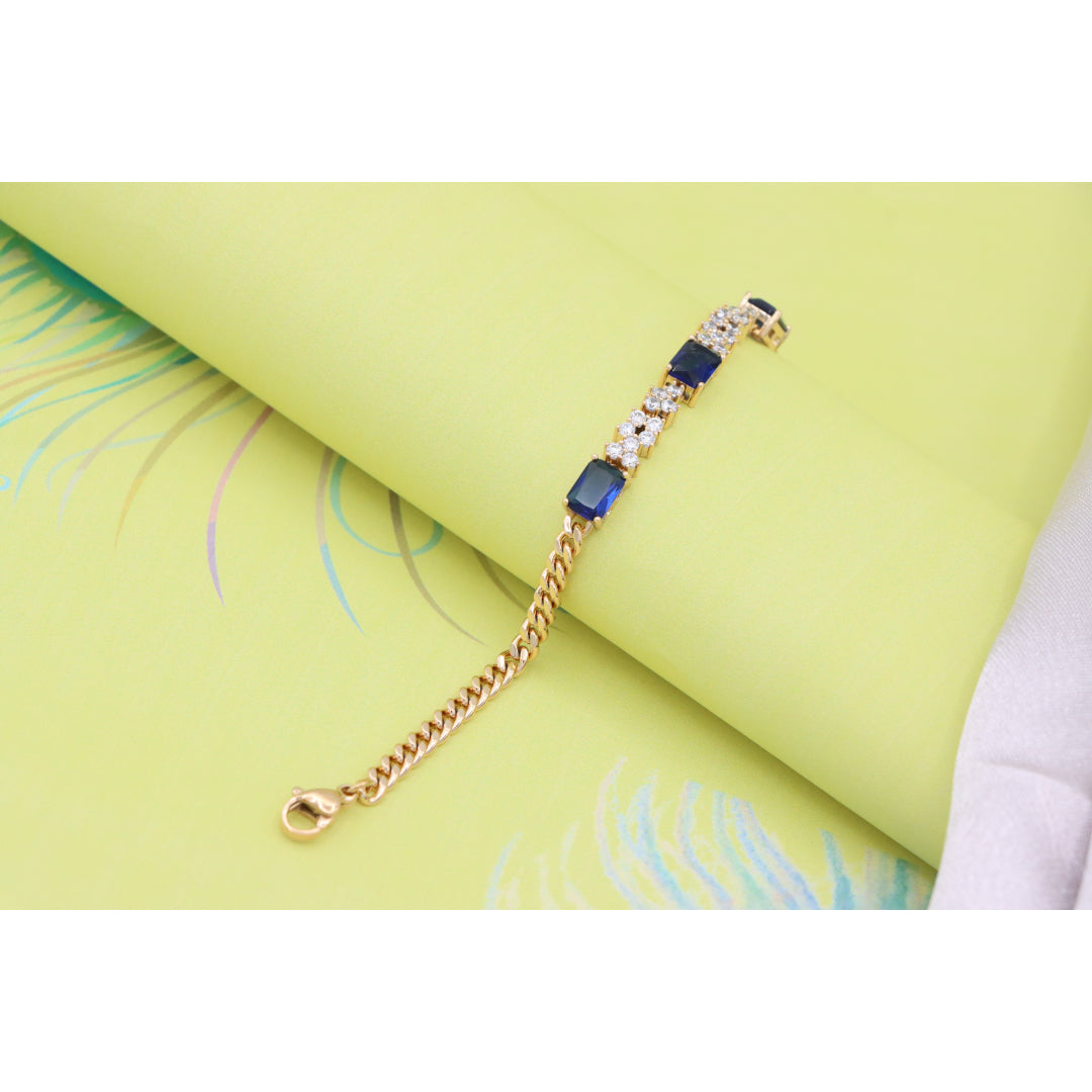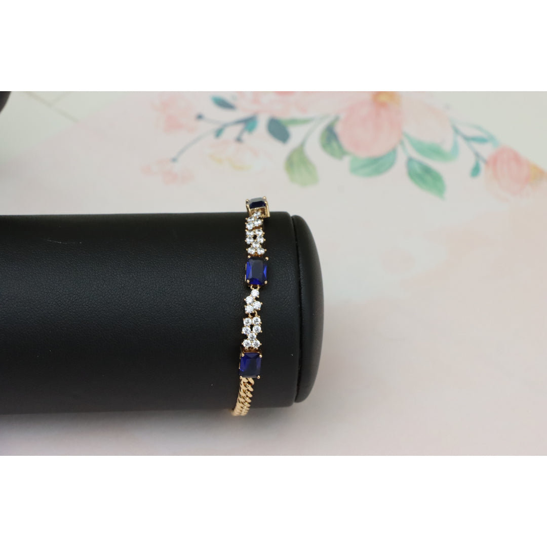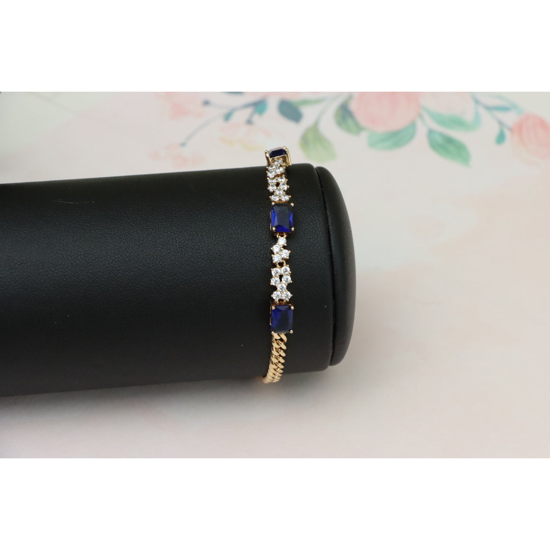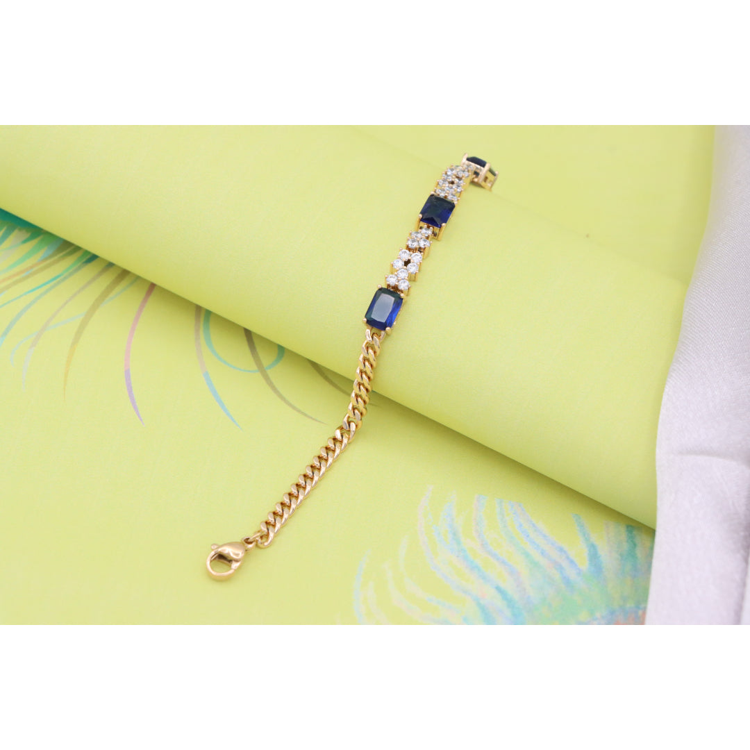 A chic bracelet featuring bold blue emerald-cut stones paired with shimmering CZ clusters, finished with a rose gold chain. Crafted from high-quality brass and gold plating for elegance and durability.