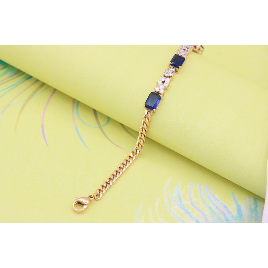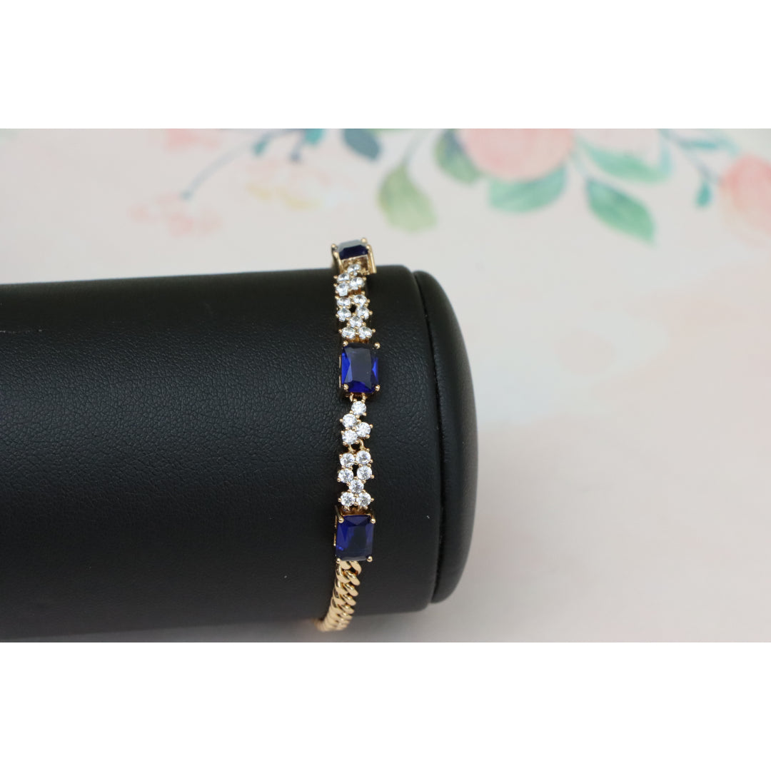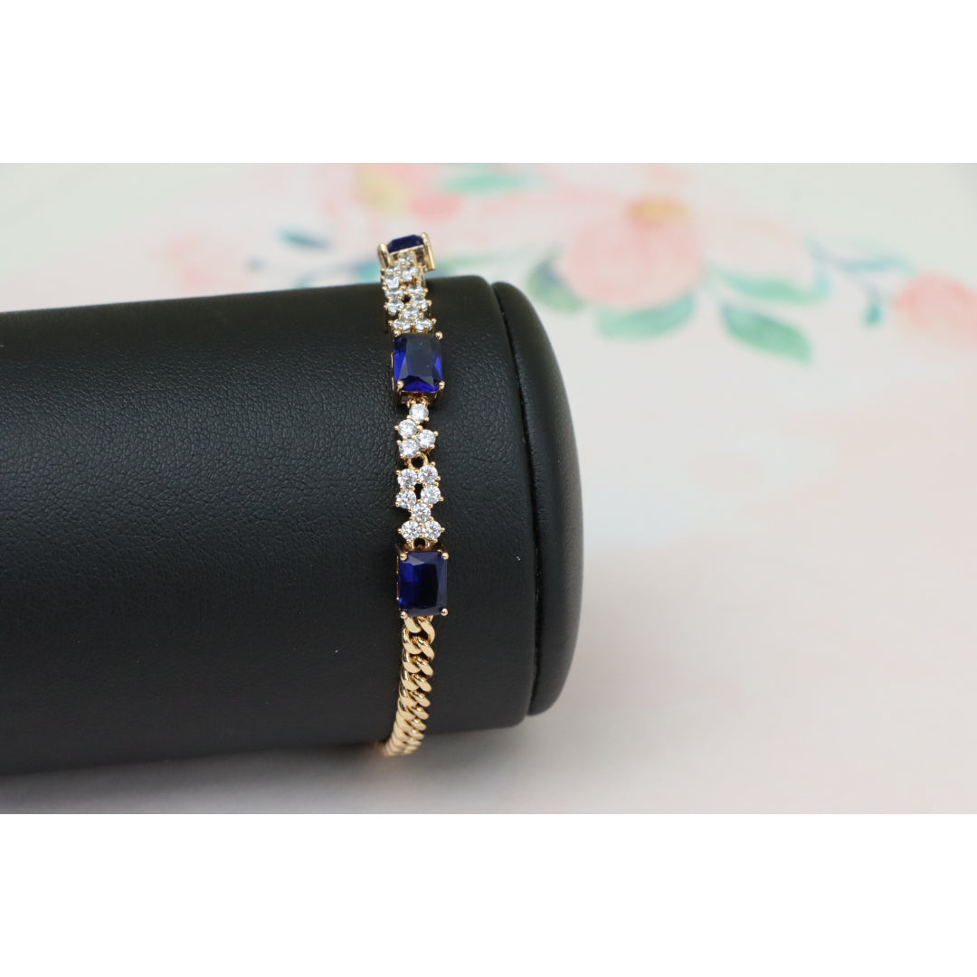 A chic bracelet featuring bold blue emerald-cut stones paired with shimmering CZ clusters, finished with a rose gold chain. Crafted from high-quality brass and gold plating for elegance and durability.