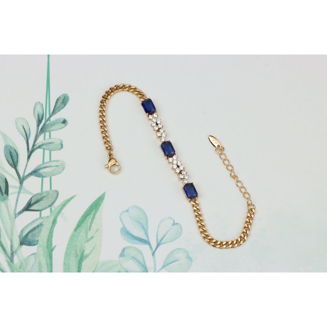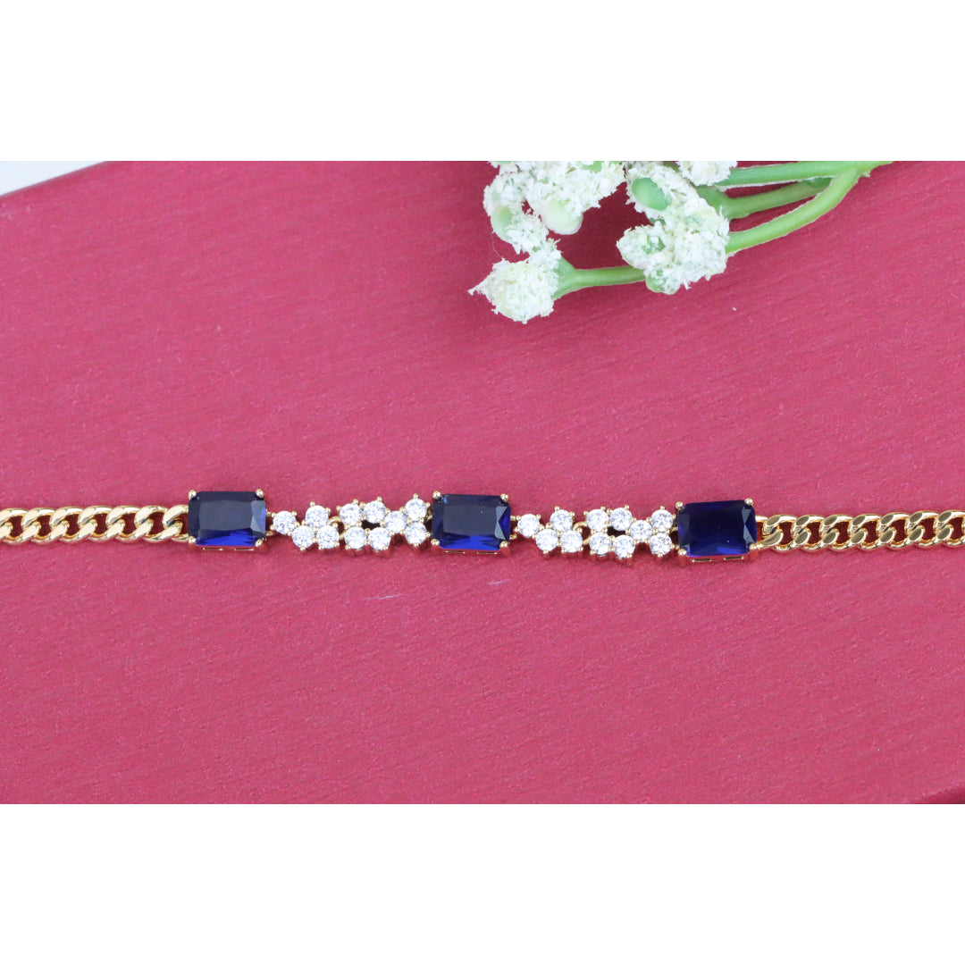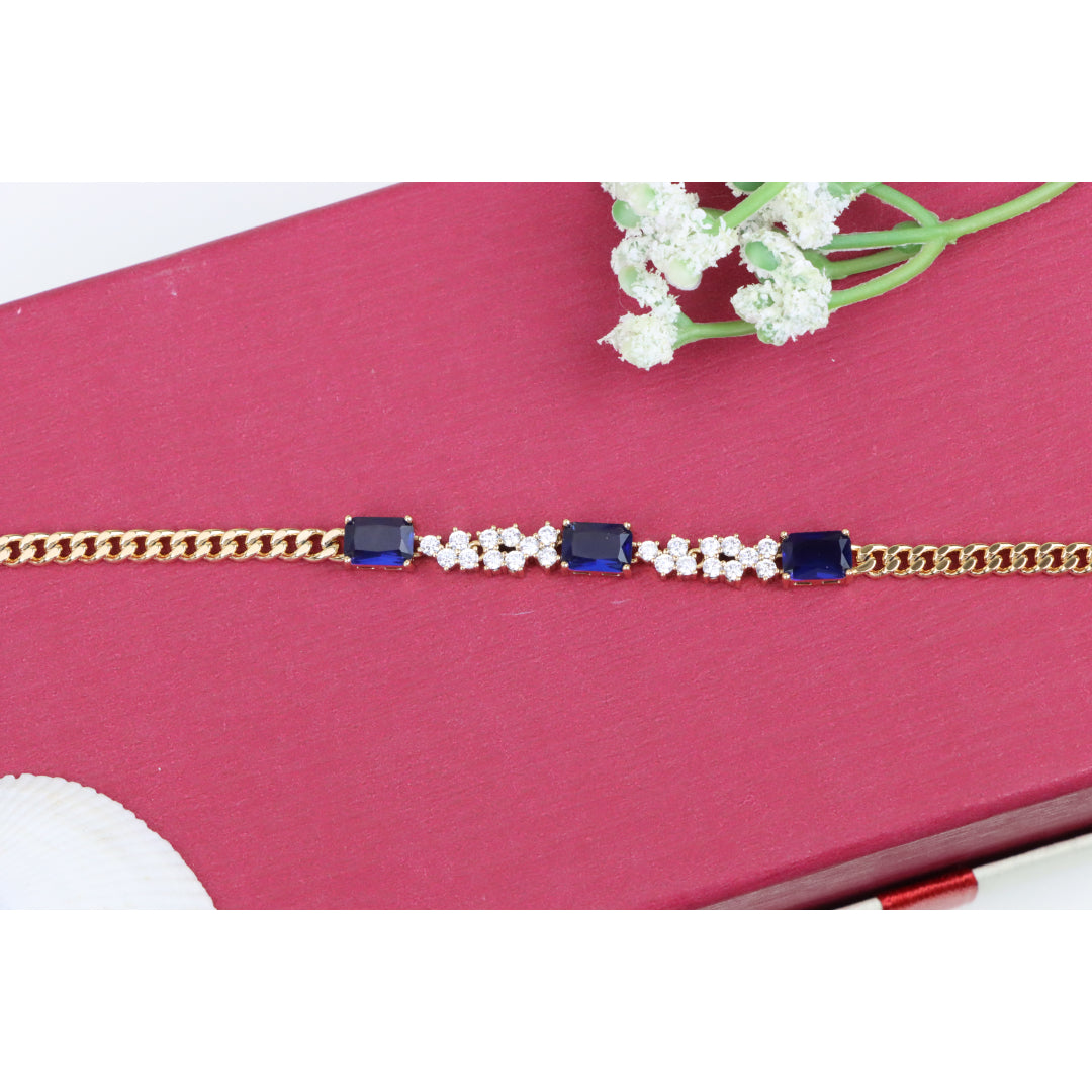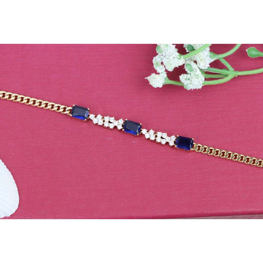A chic bracelet featuring bold blue emerald-cut stones paired with shimmering CZ clusters, finished with a rose gold chain. Crafted from high-quality brass and gold plating for elegance and durability.
