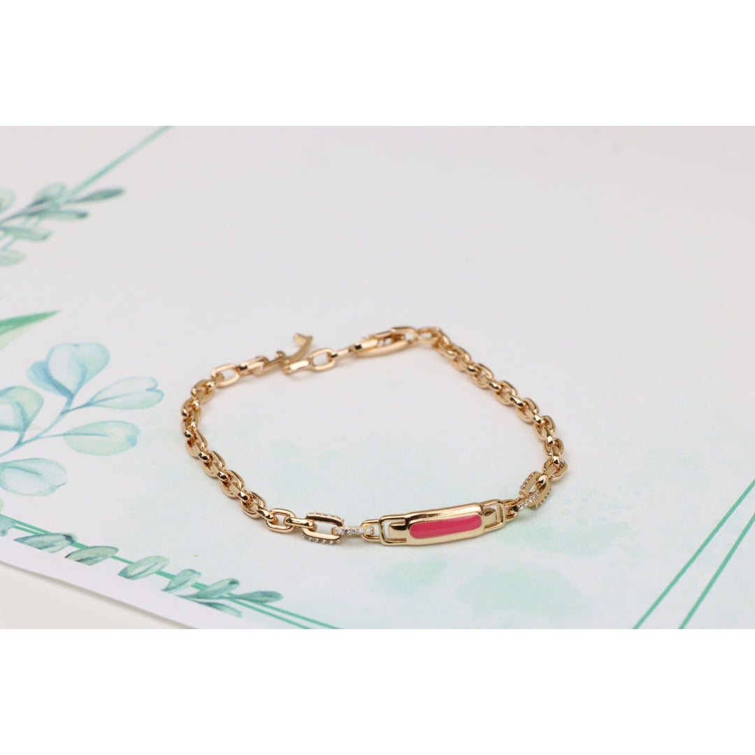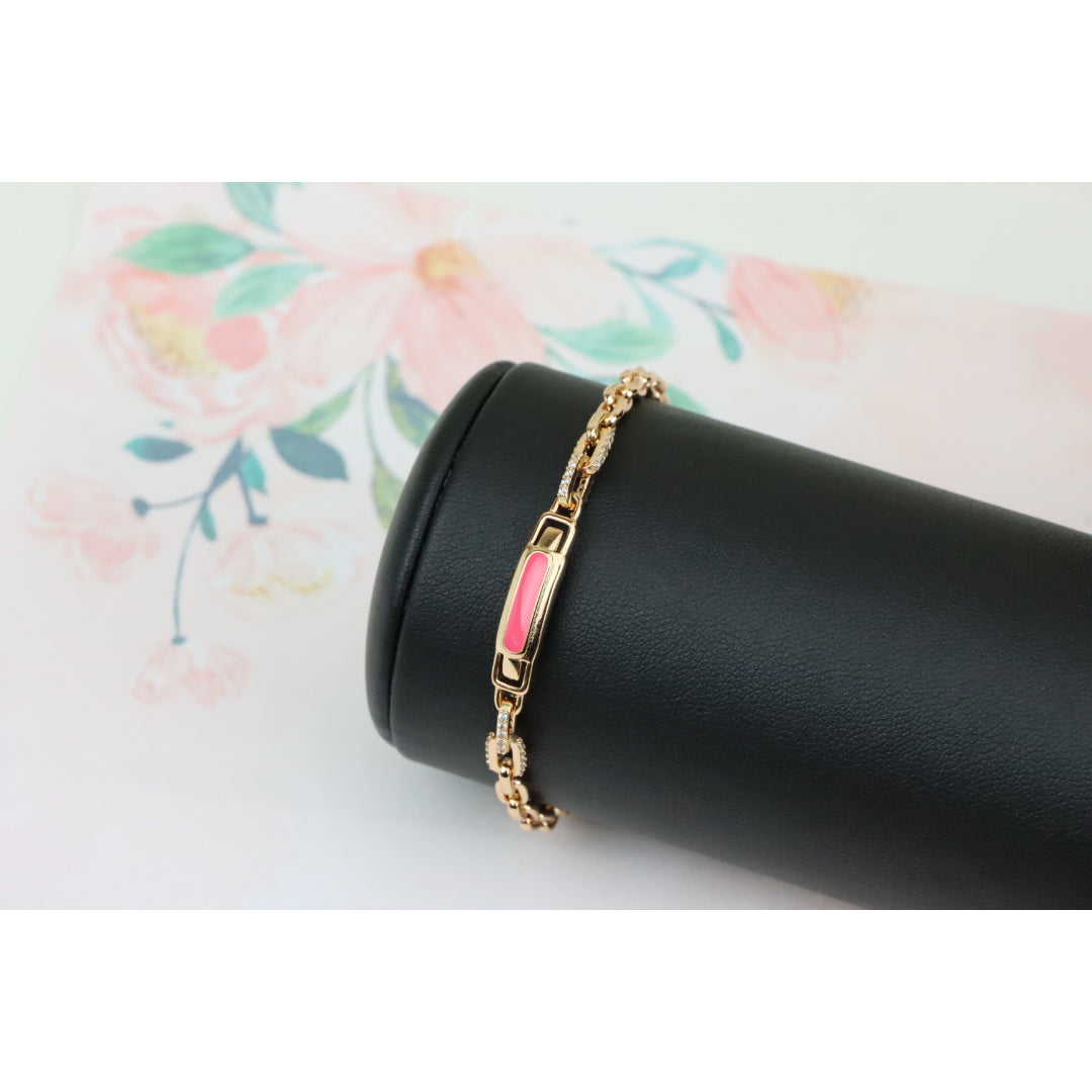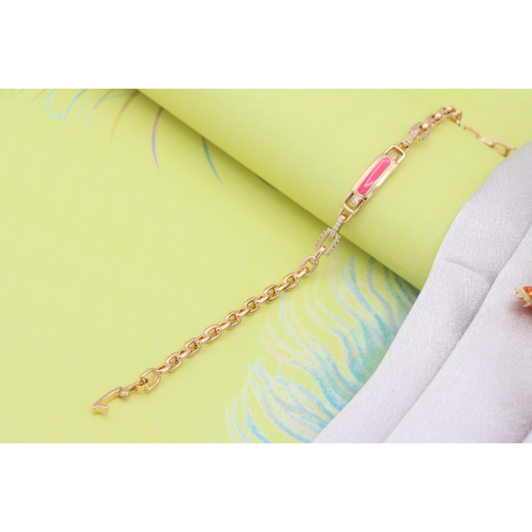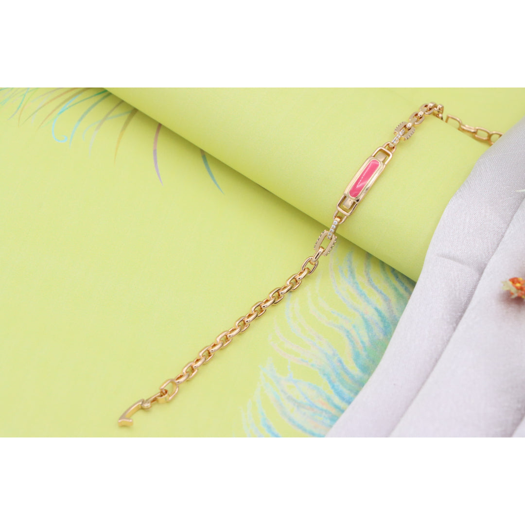 Elegant and eye-catching, this Rose Gold bracelet features a polished pink enamel centerpiece with refined chain links, ideal for adding a modern, feminine touch to your look.