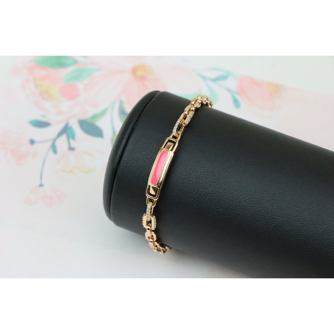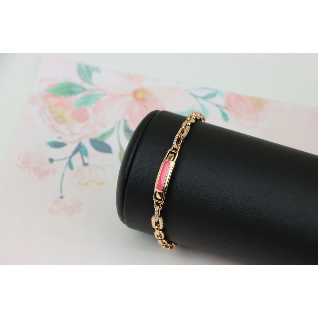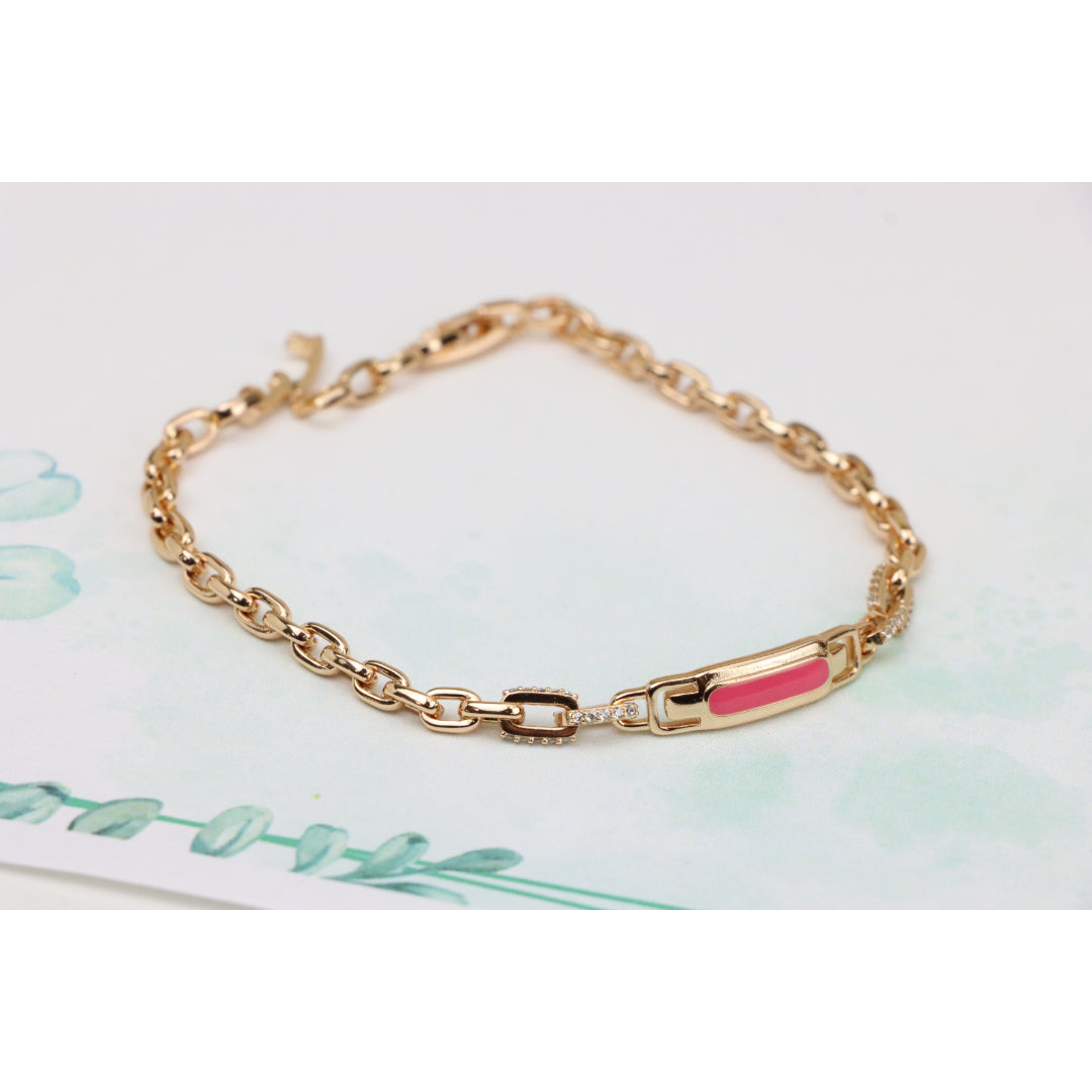 Elegant and eye-catching, this Rose Gold bracelet features a polished pink enamel centerpiece with refined chain links, ideal for adding a modern, feminine touch to your look.