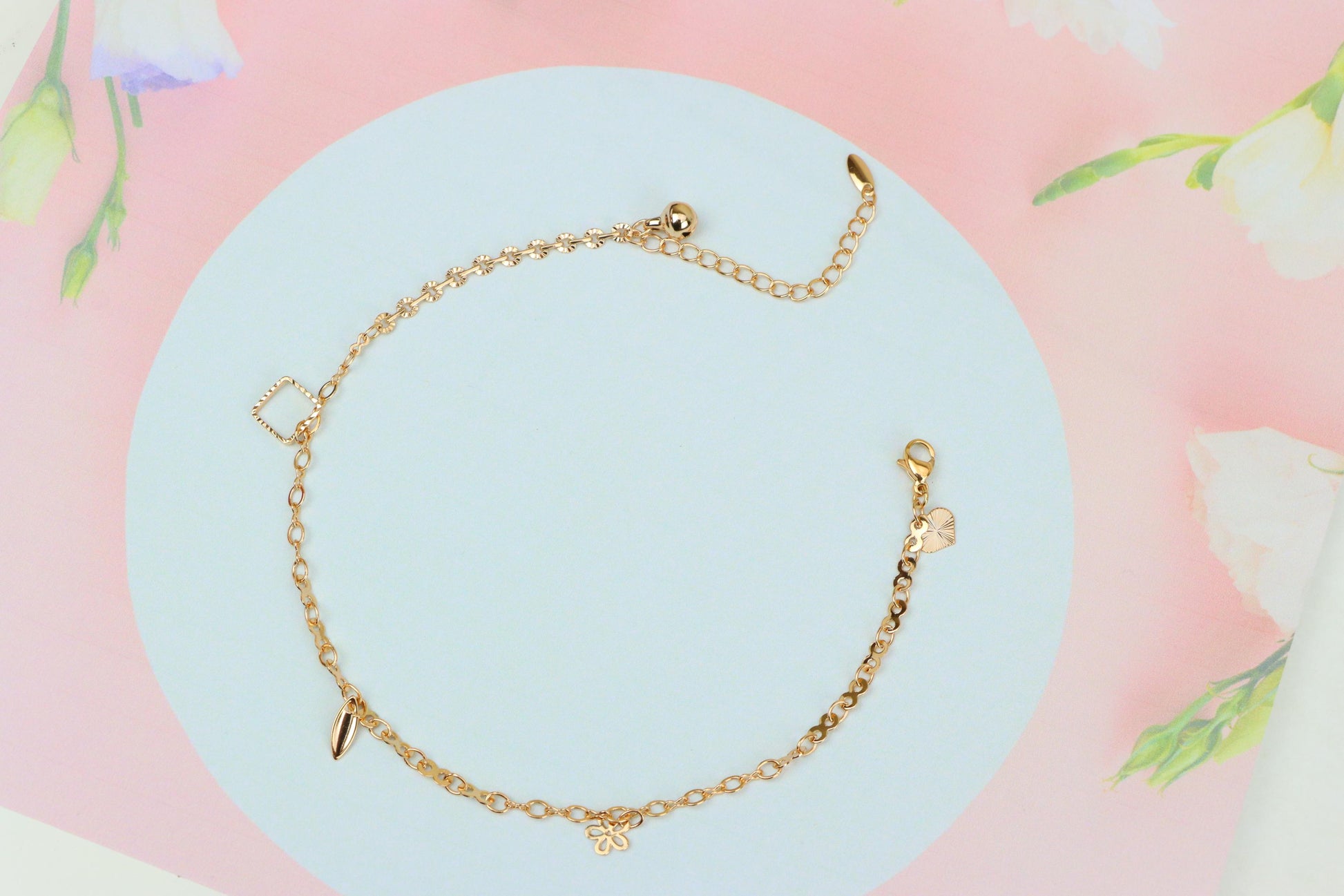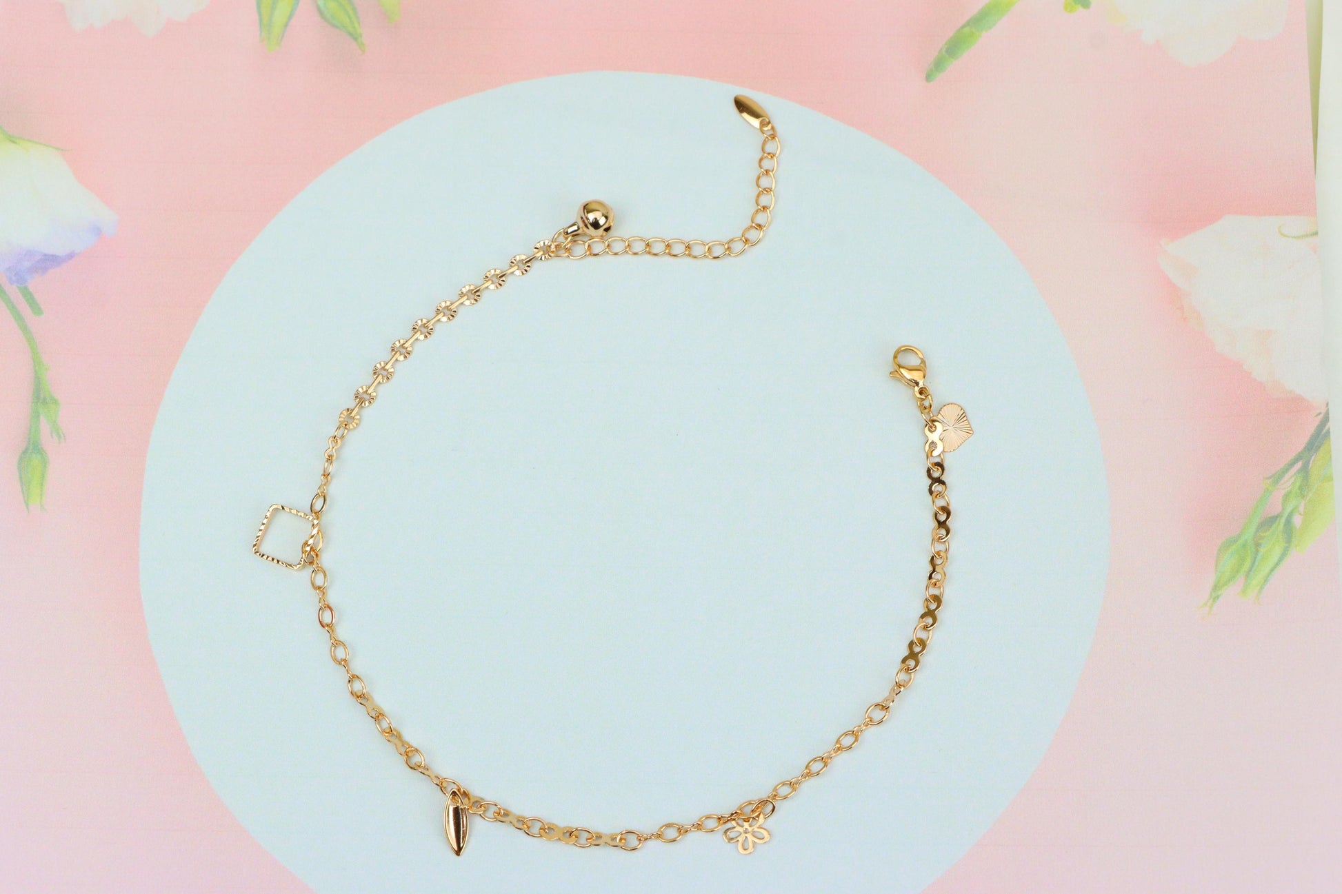 Rose Gold Charm Anklet with Floral, Leaf & Square Link Accents, XPAL1045