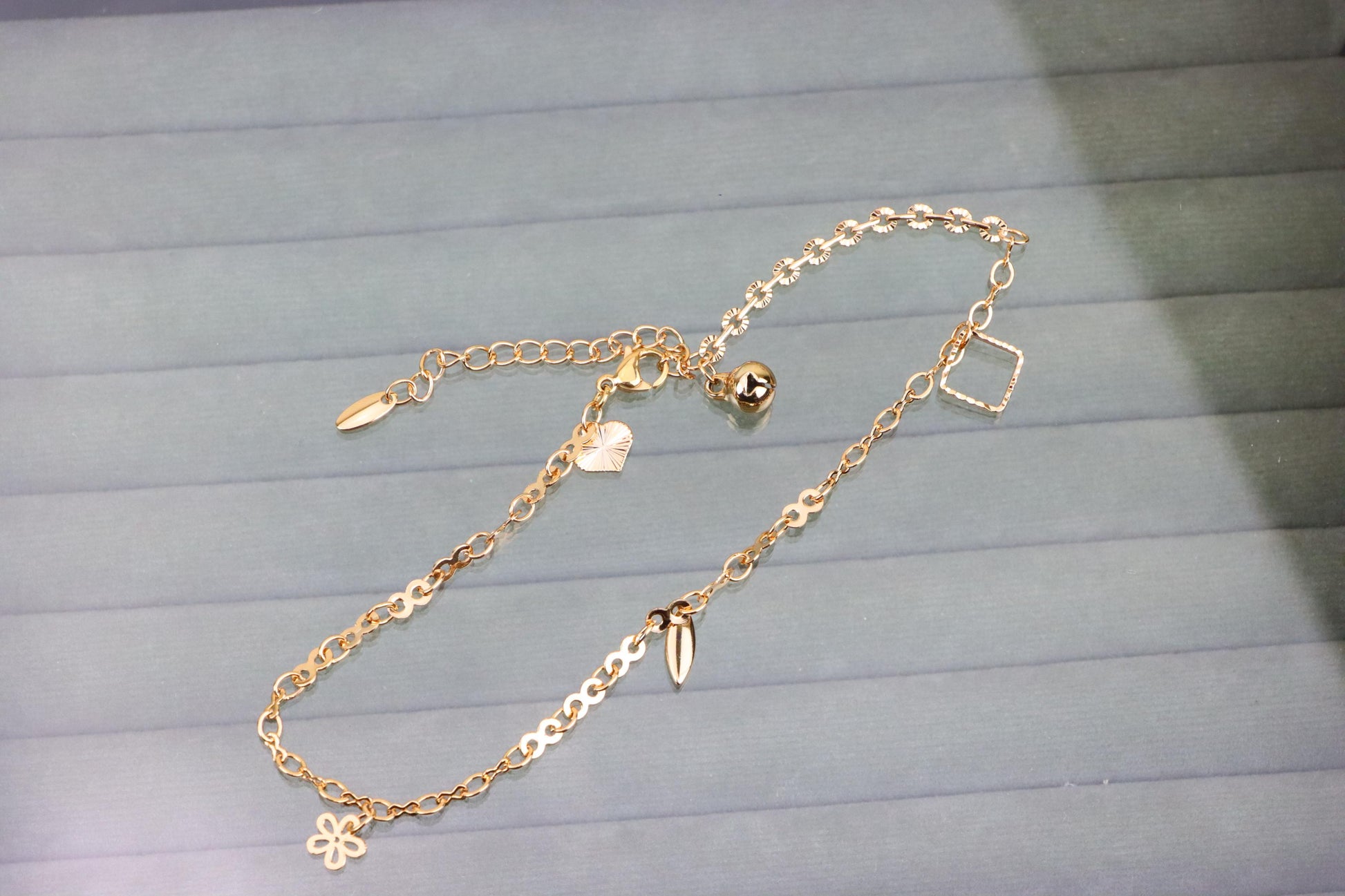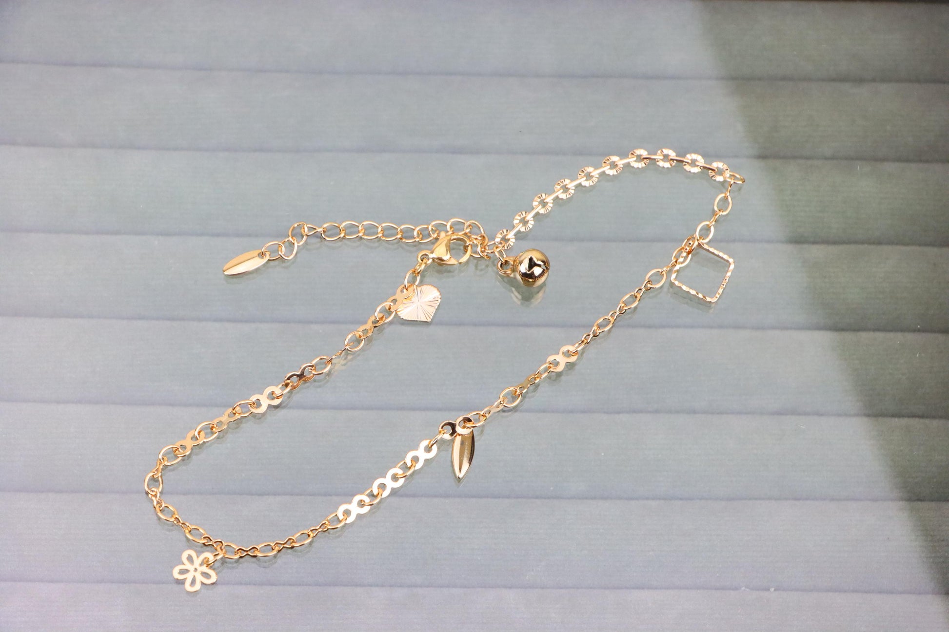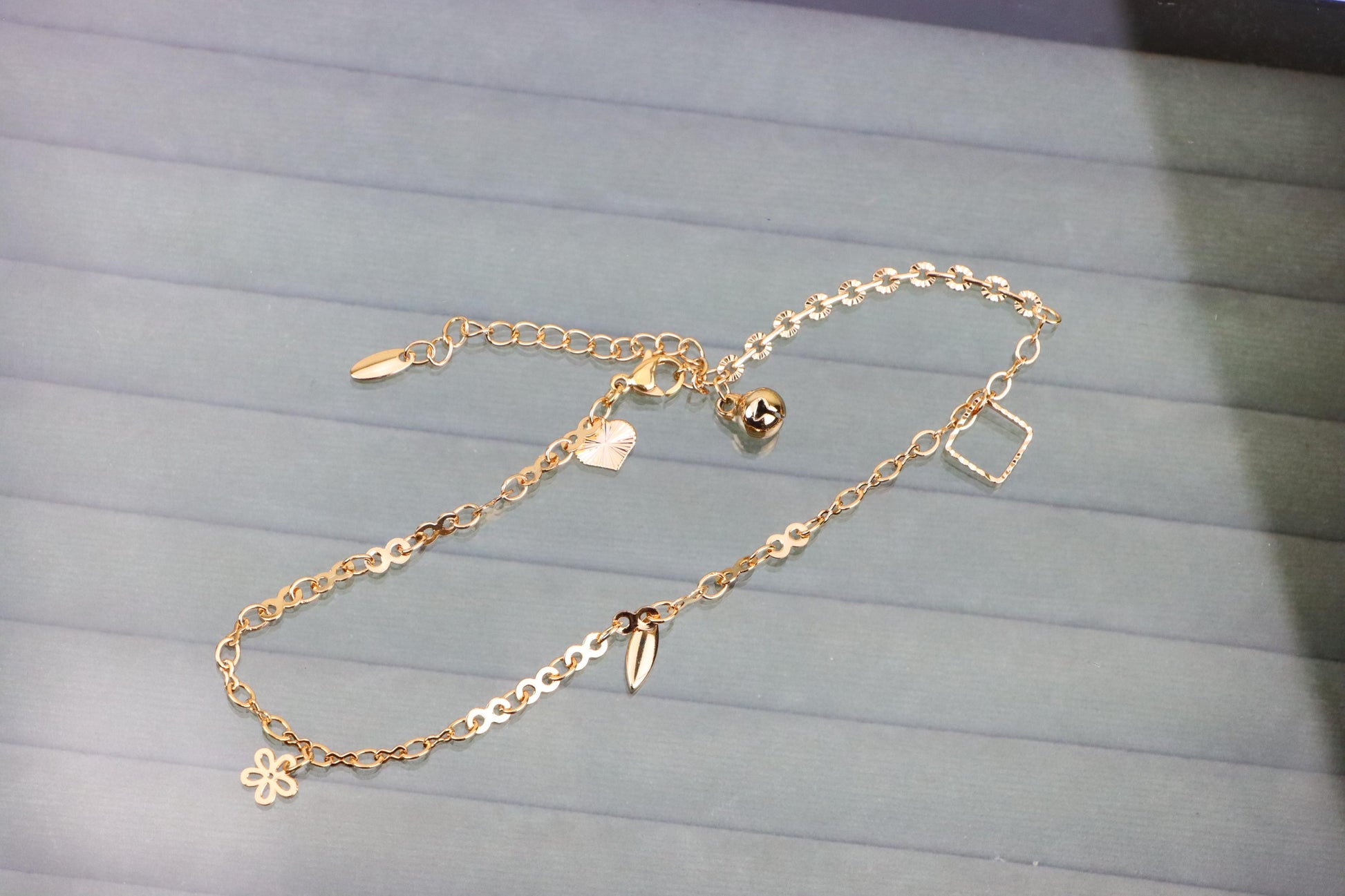 Elegant rose gold anklet crafted with a mix of chic charms and a detailed chain, perfect for adding a stylish touch to your ankle.