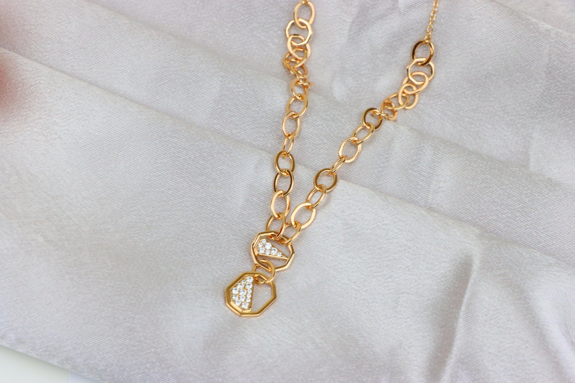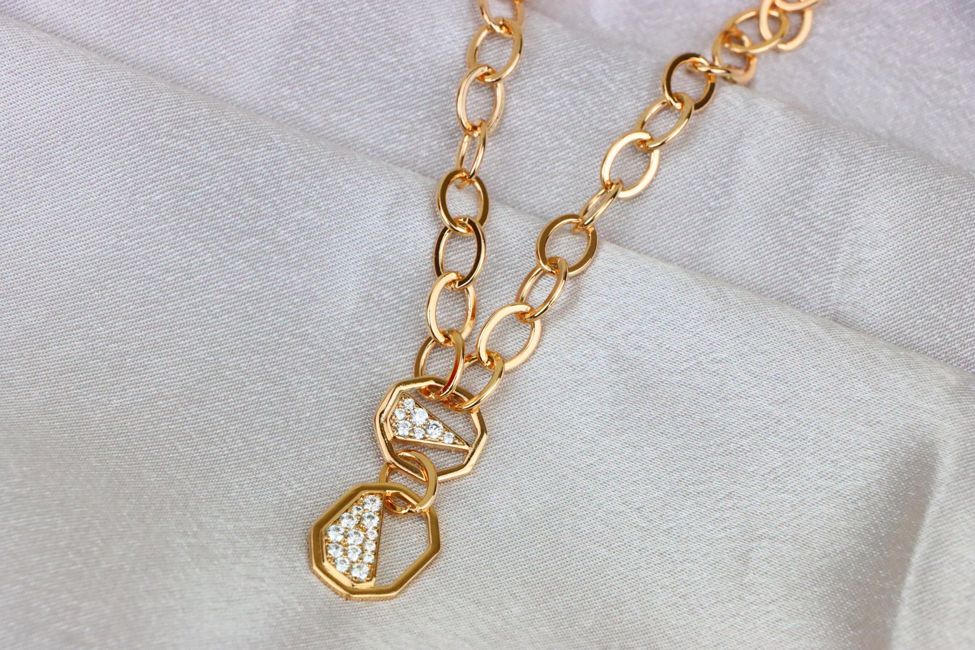 Bold and stylish rose gold necklace featuring a statement chain and geometric drop charms accented with sparkling crystals.