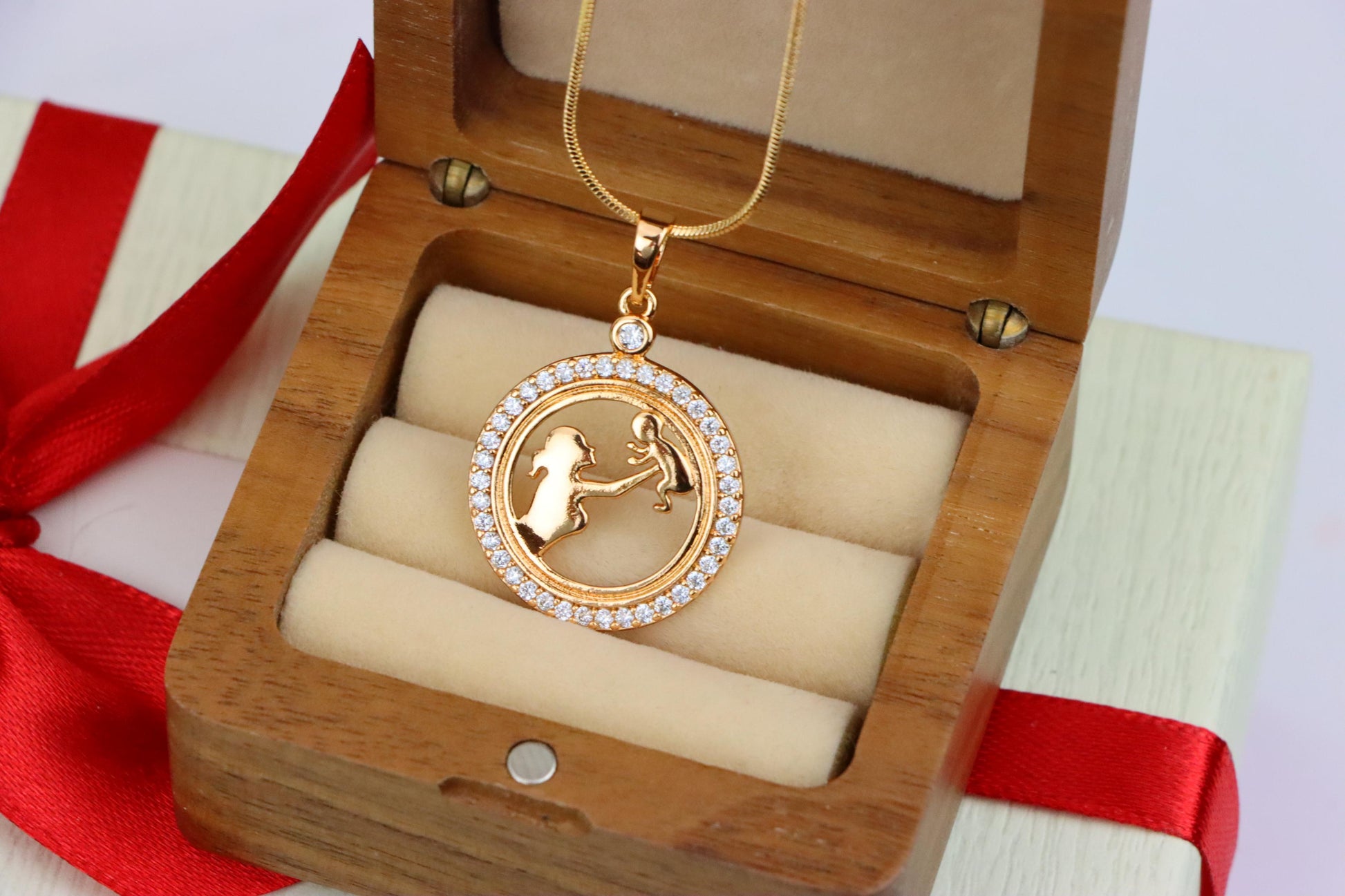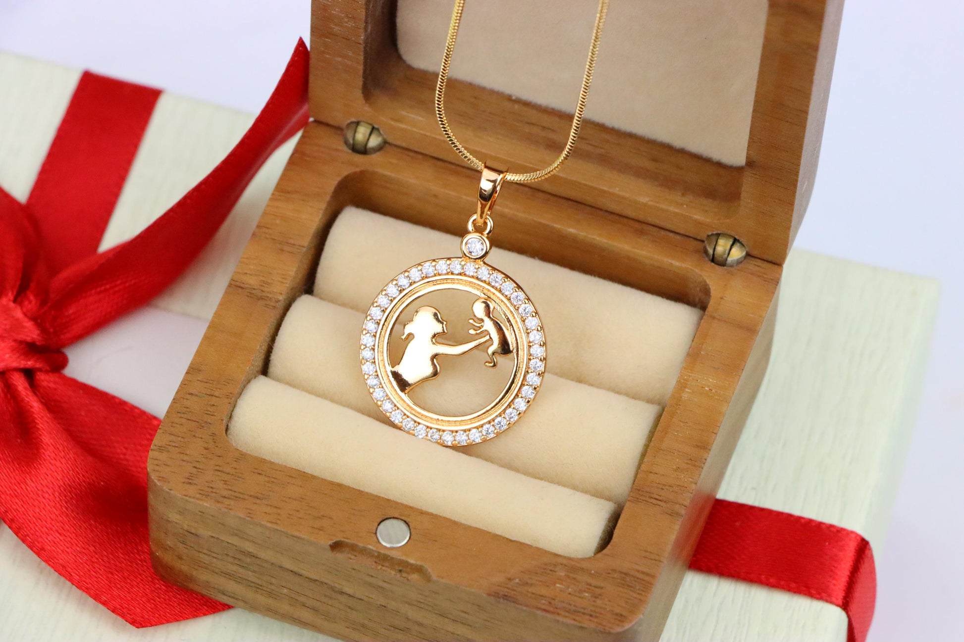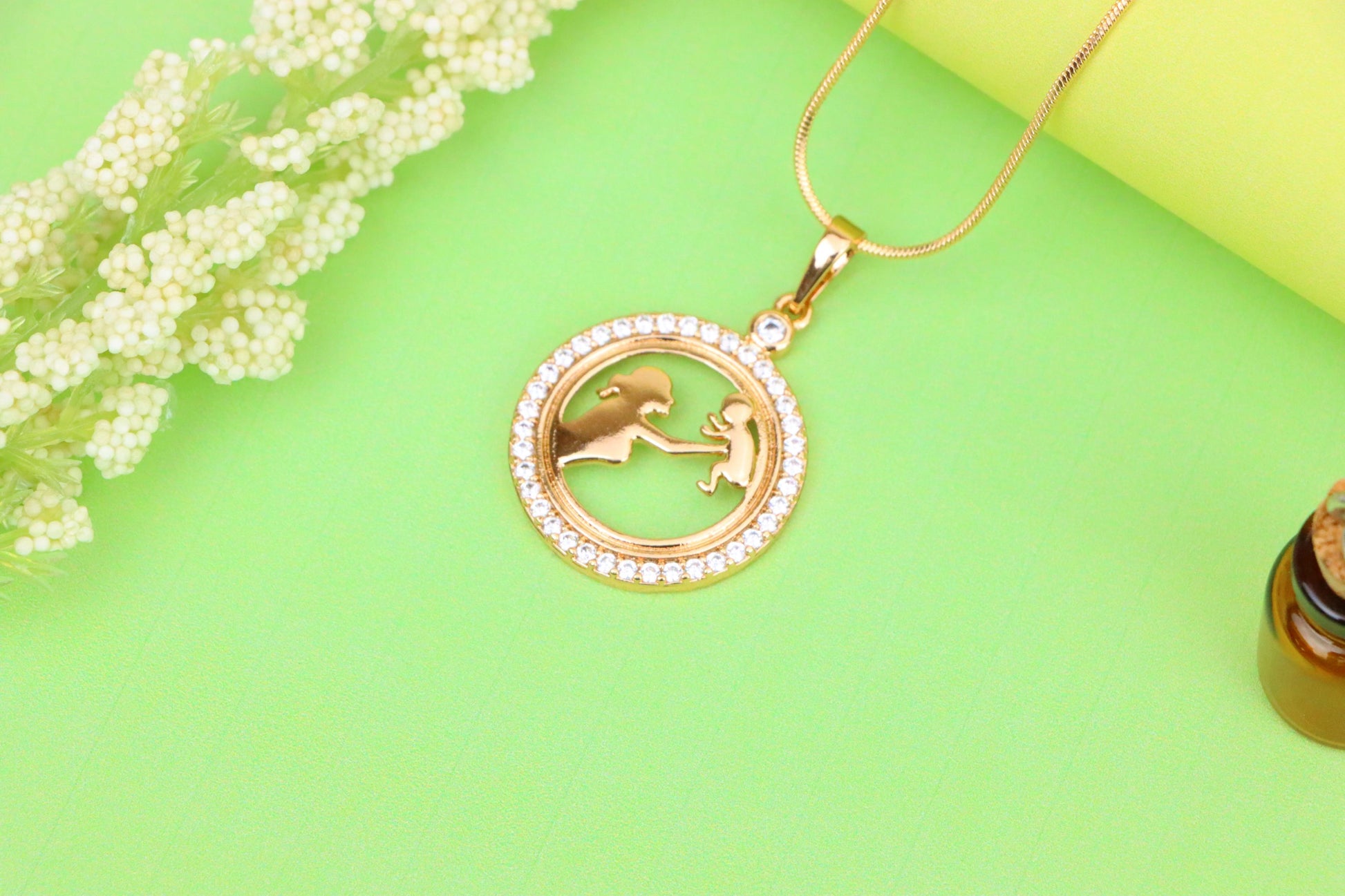 Celebrate the bond of motherhood with this beautifully crafted rose gold pendant featuring a mother lifting her child, framed by dazzling cubic zirconia stones.