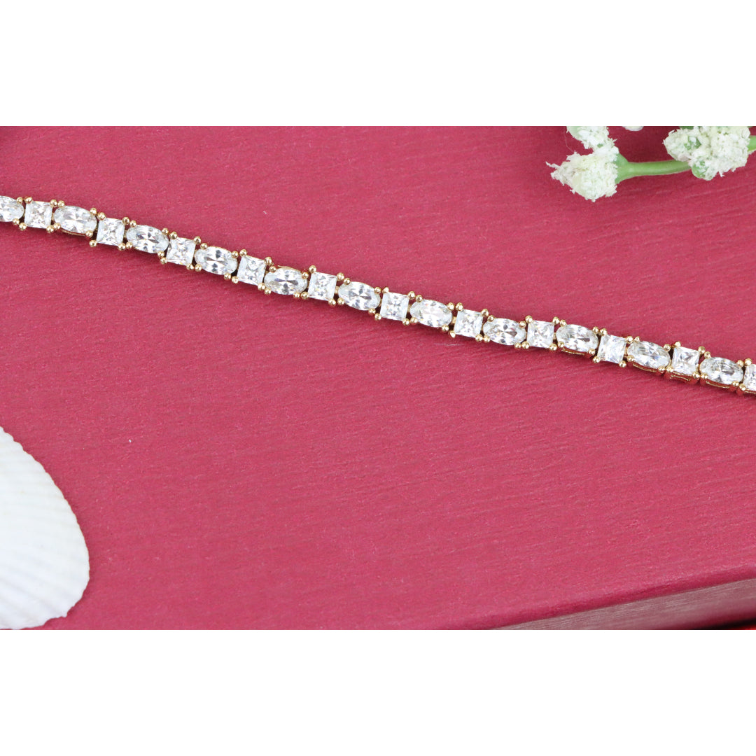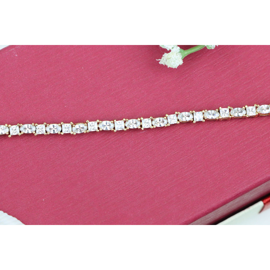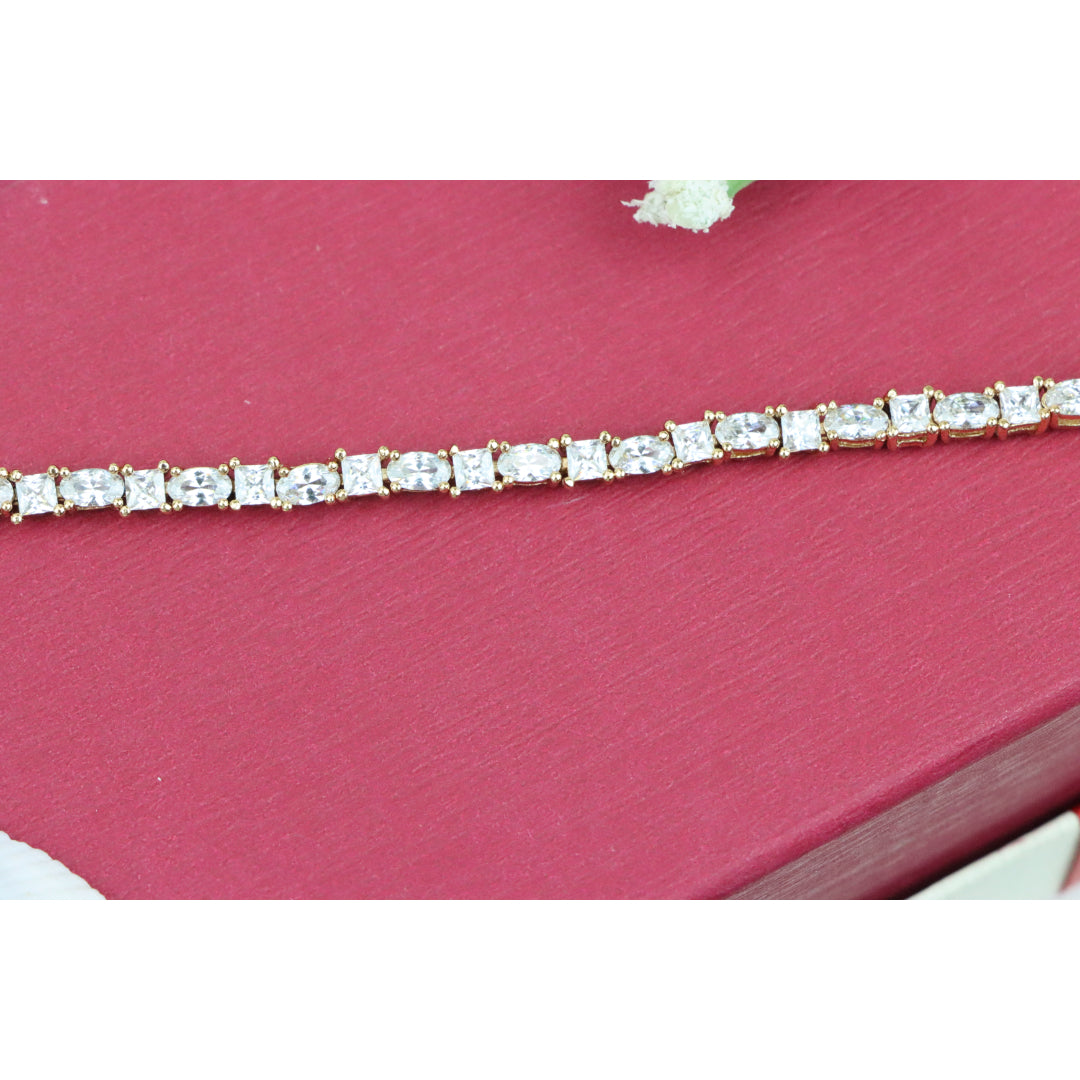 Elegant and timeless, this rose gold bracelet features alternating oval and square-cut cubic zirconia stones, delivering refined brilliance. Made from high-quality brass with gold plating for lasting shine.