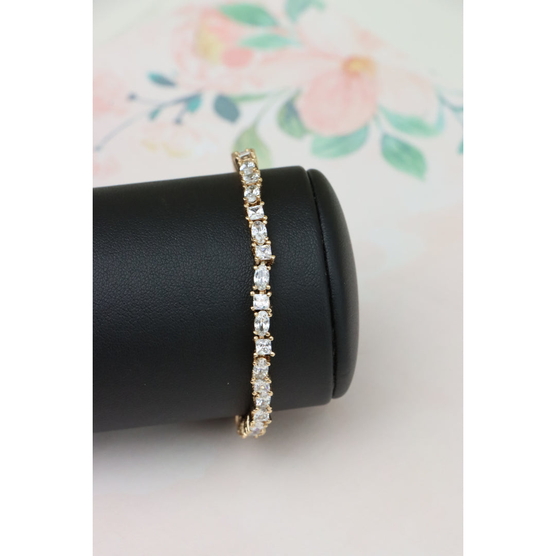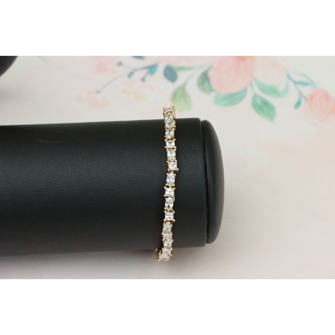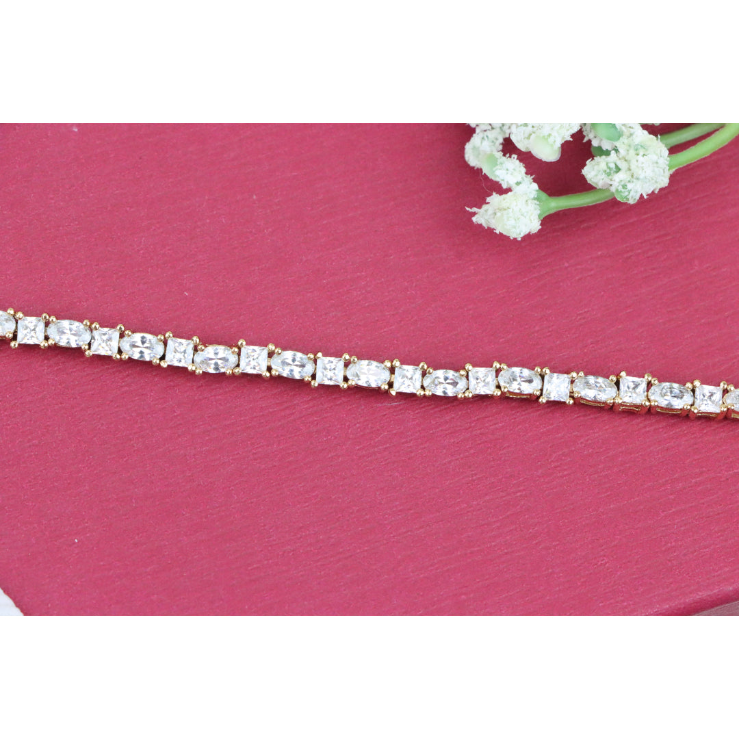 Elegant and timeless, this rose gold bracelet features alternating oval and square-cut cubic zirconia stones, delivering refined brilliance. Made from high-quality brass with gold plating for lasting shine.