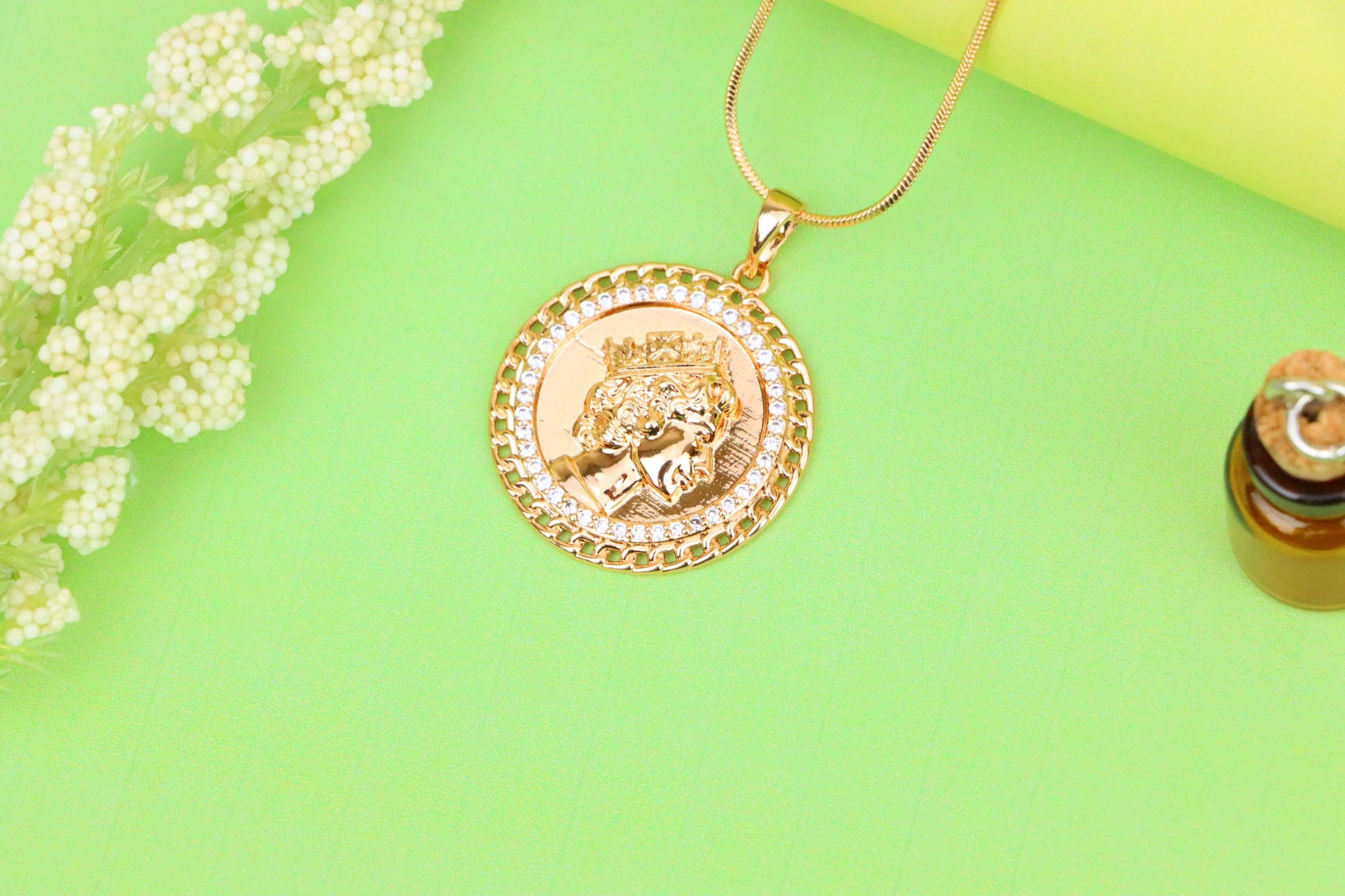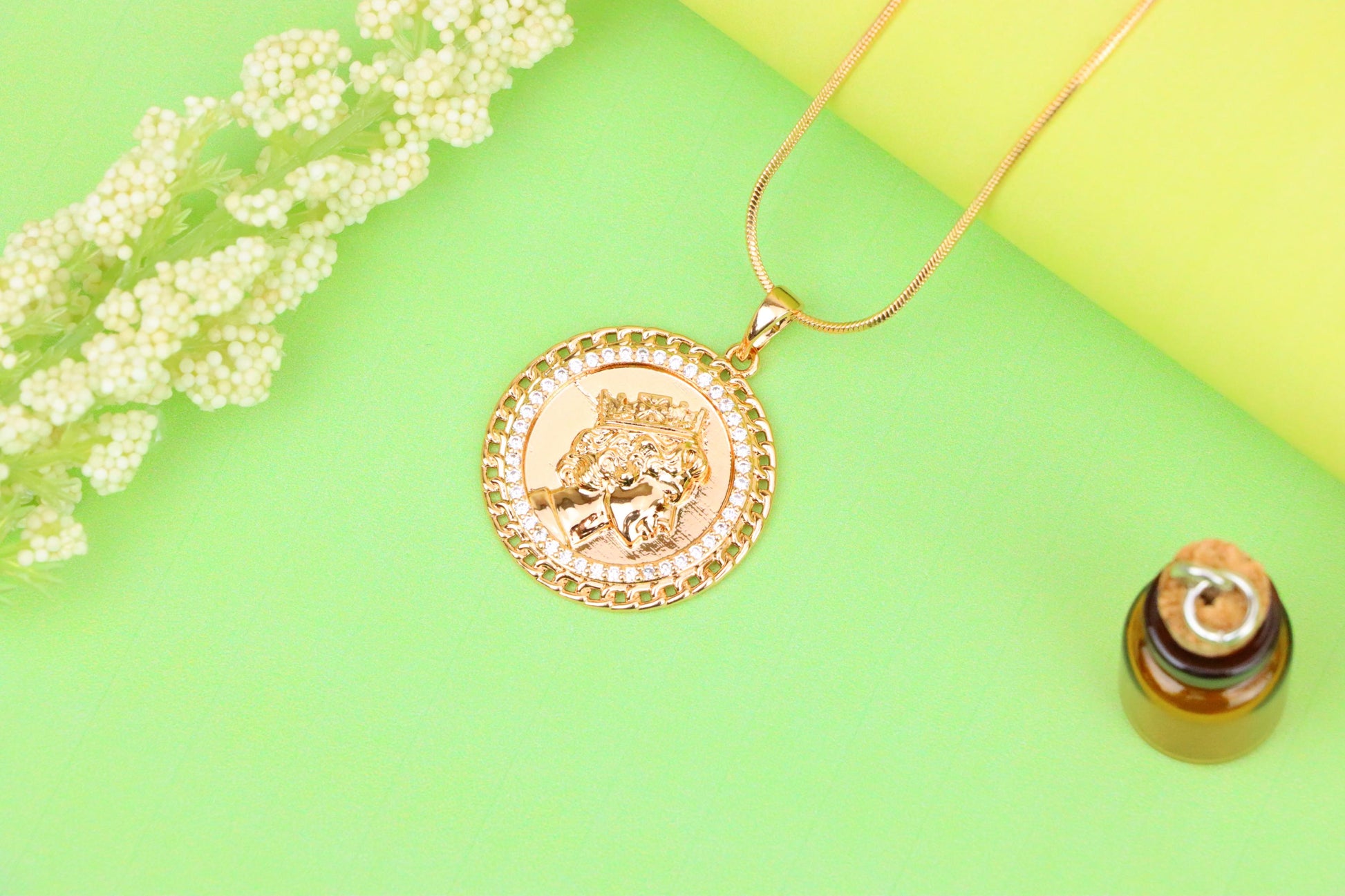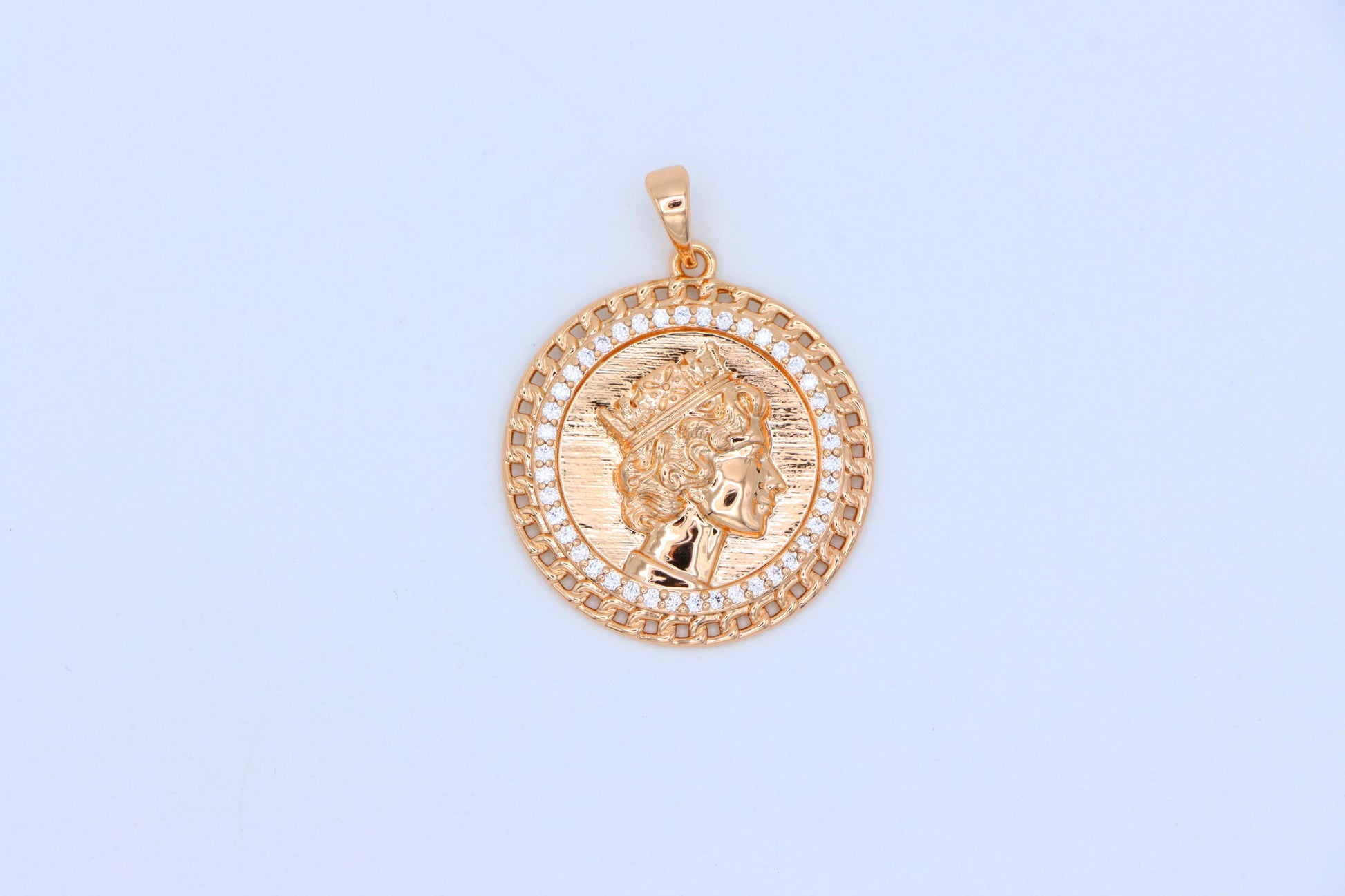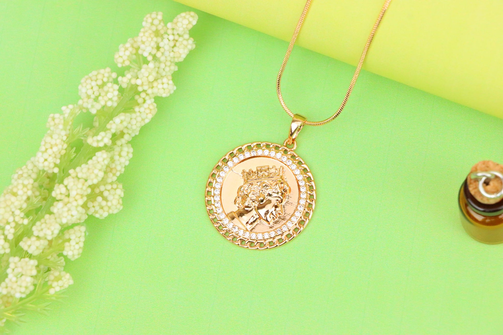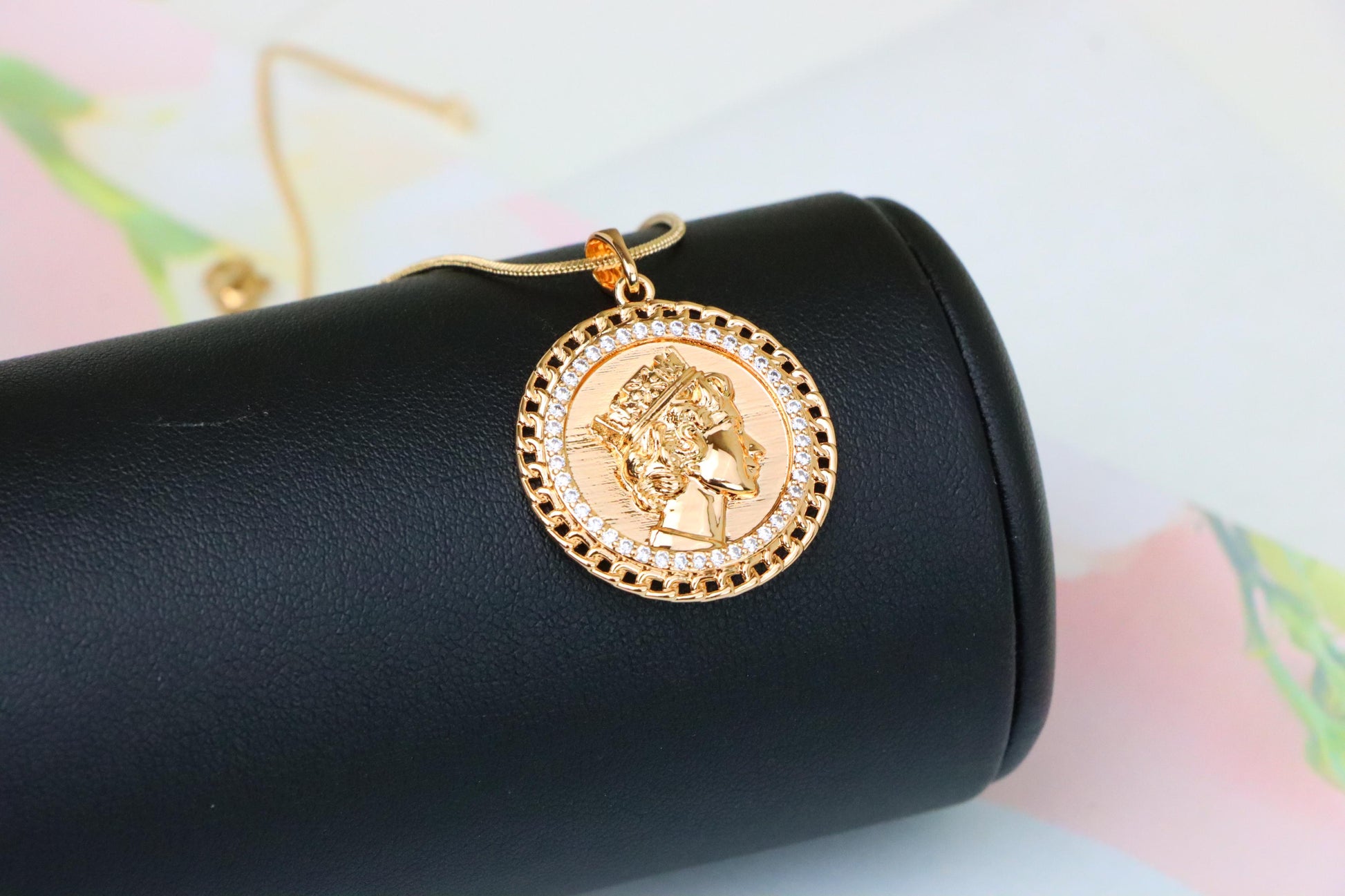 A regal addition to your collection, this coin-style pendant features a crowned queen profile surrounded by sparkling stones for a luxurious finish.