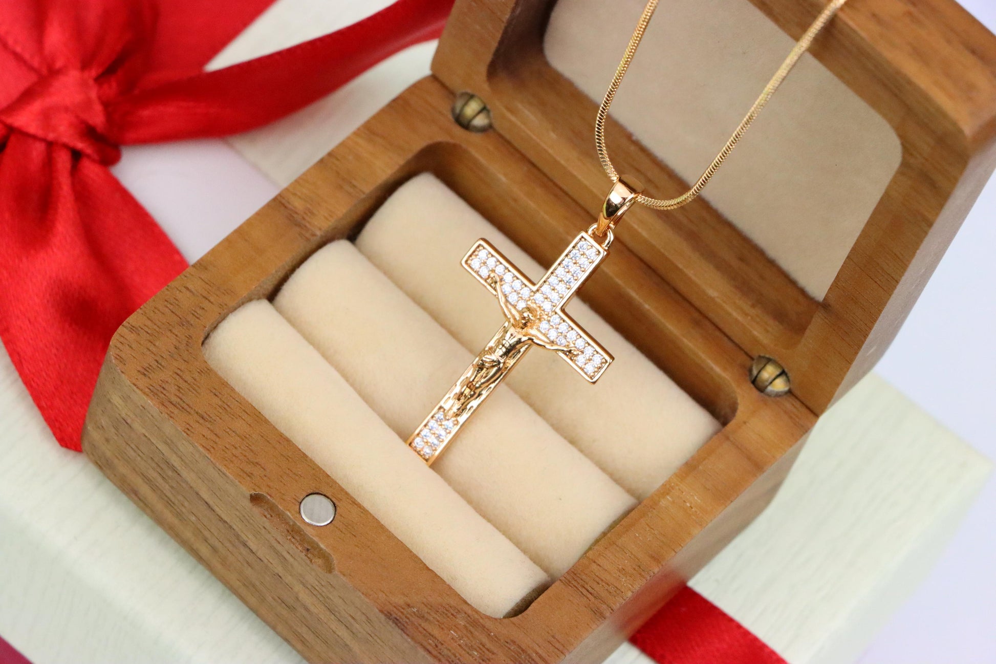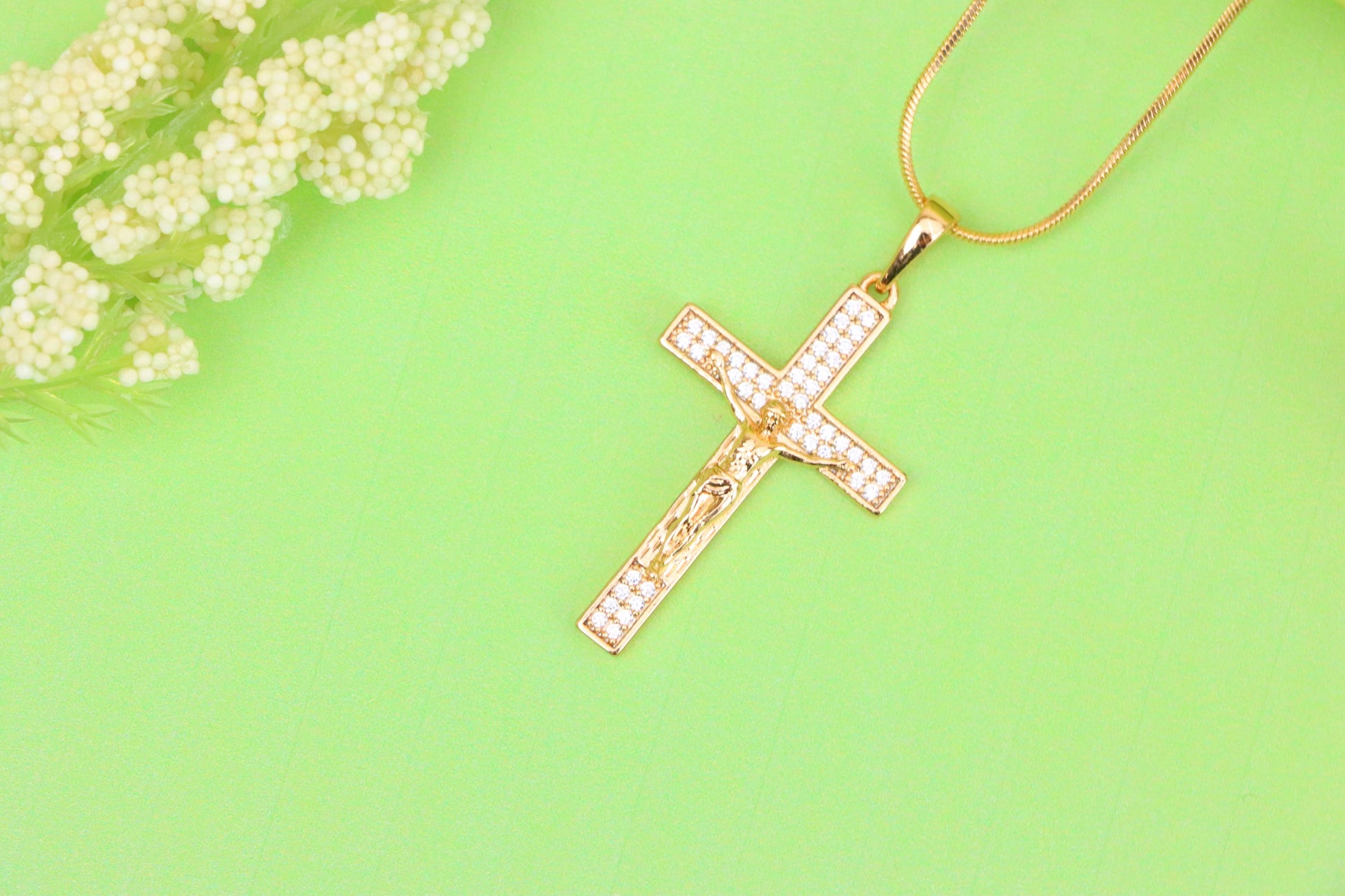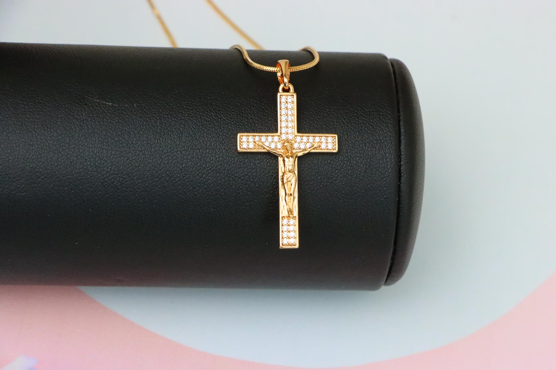 This detailed crucifix pendant features shimmering CZ stones and a sculpted Jesus figure, set in radiant gold plating over high-quality brass.