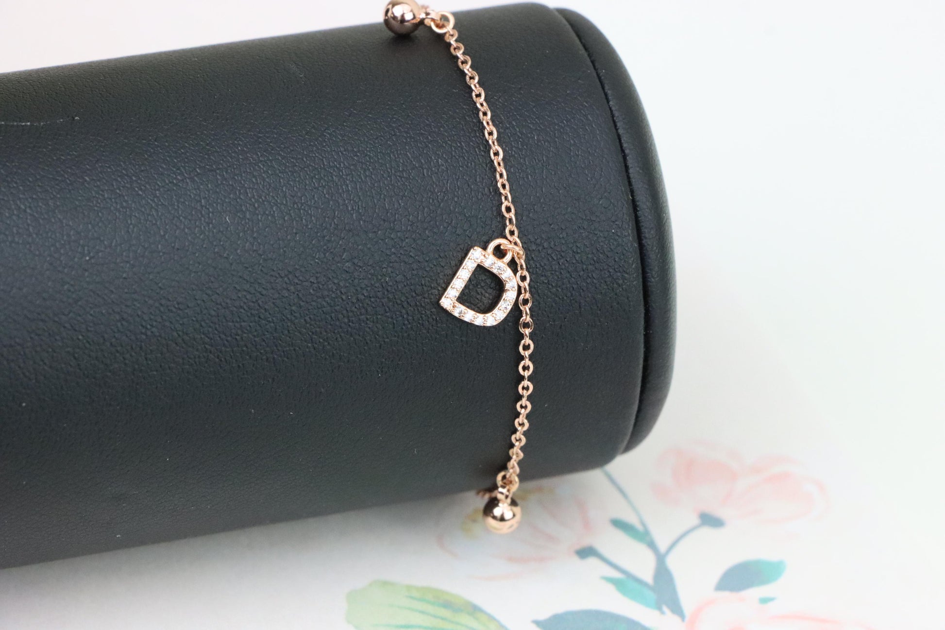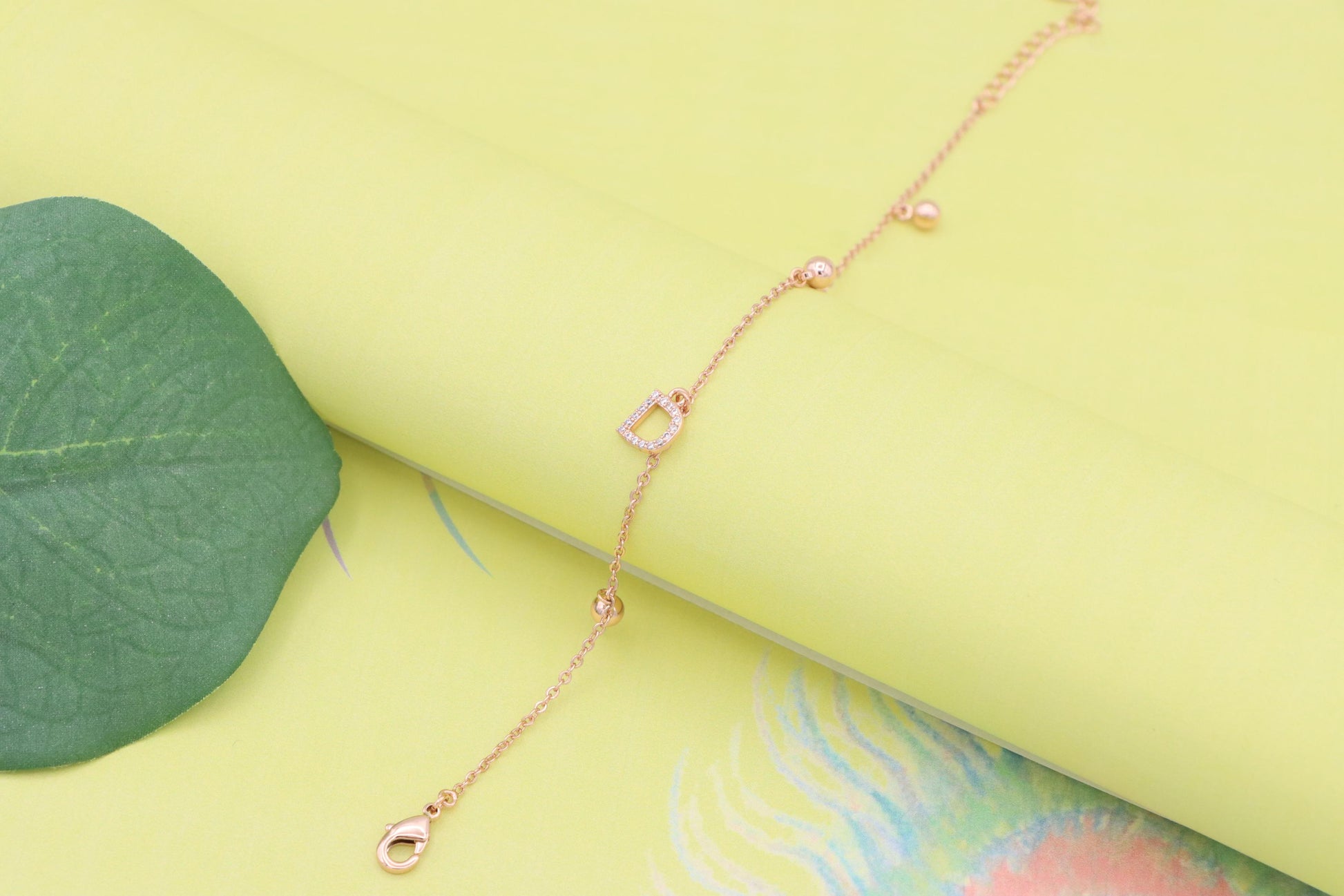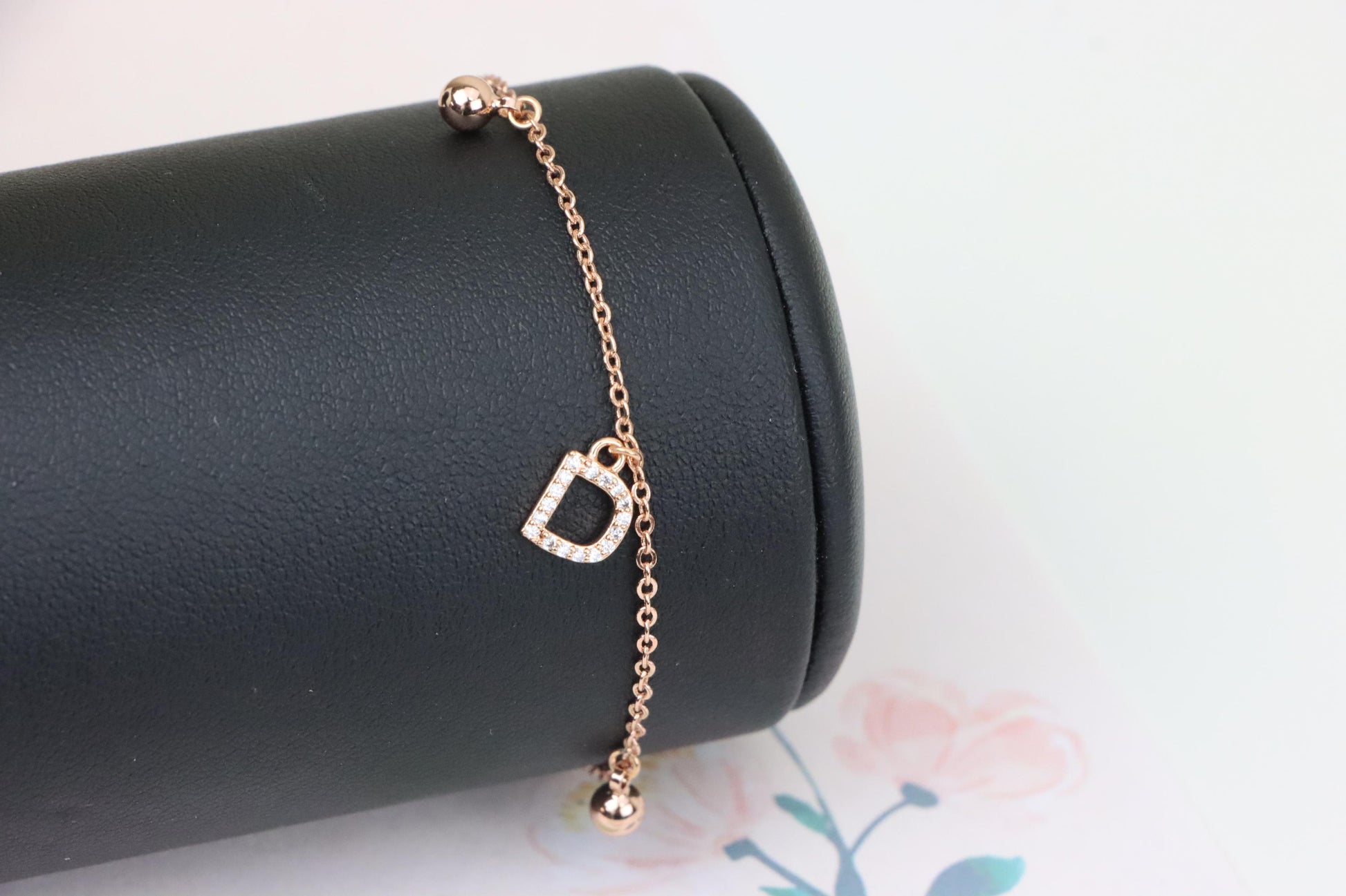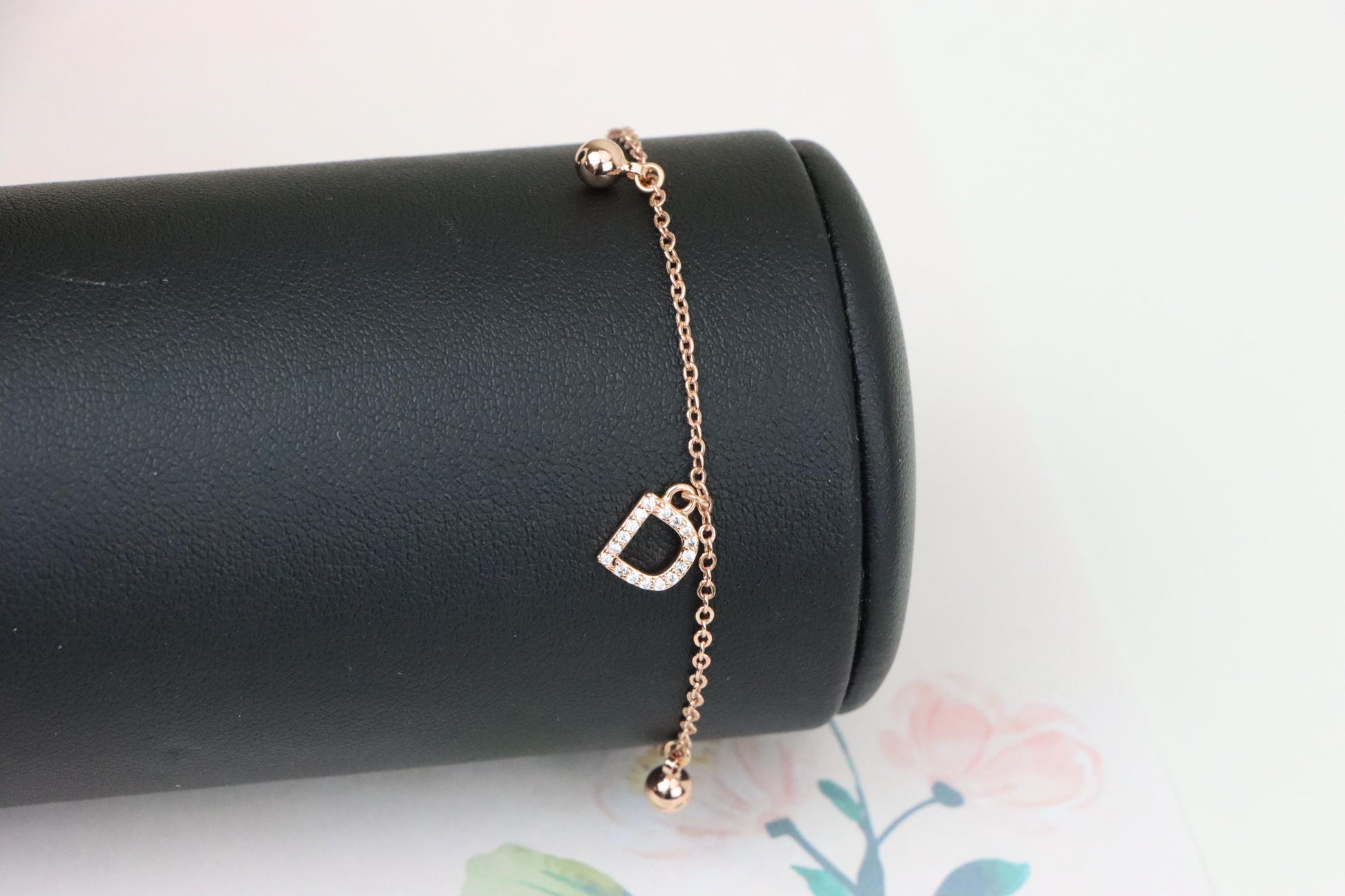 Elegant rose gold bracelet featuring a dazzling 'D' initial charm.