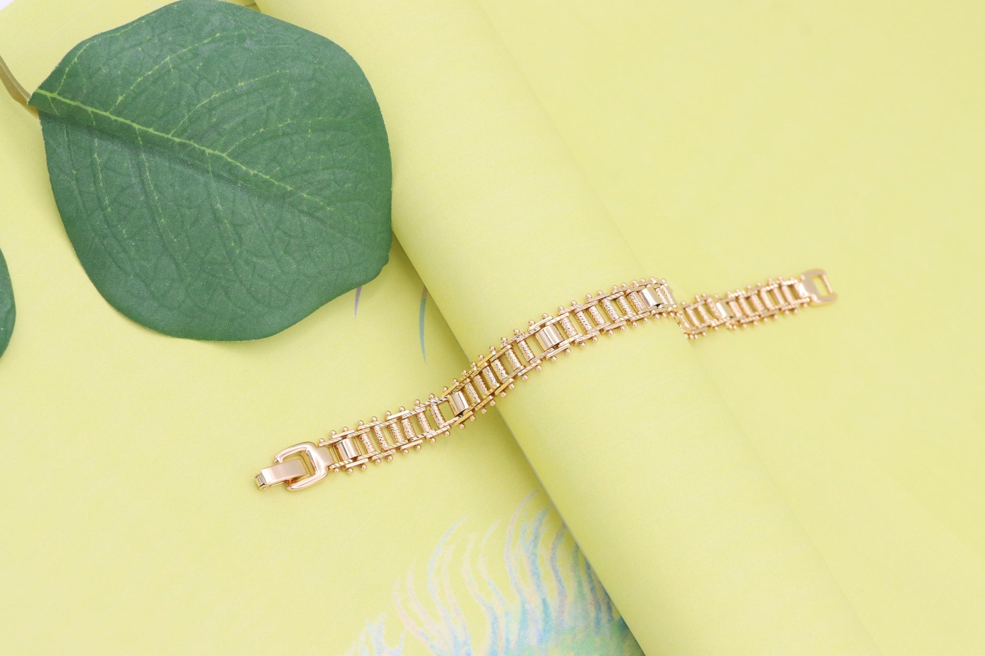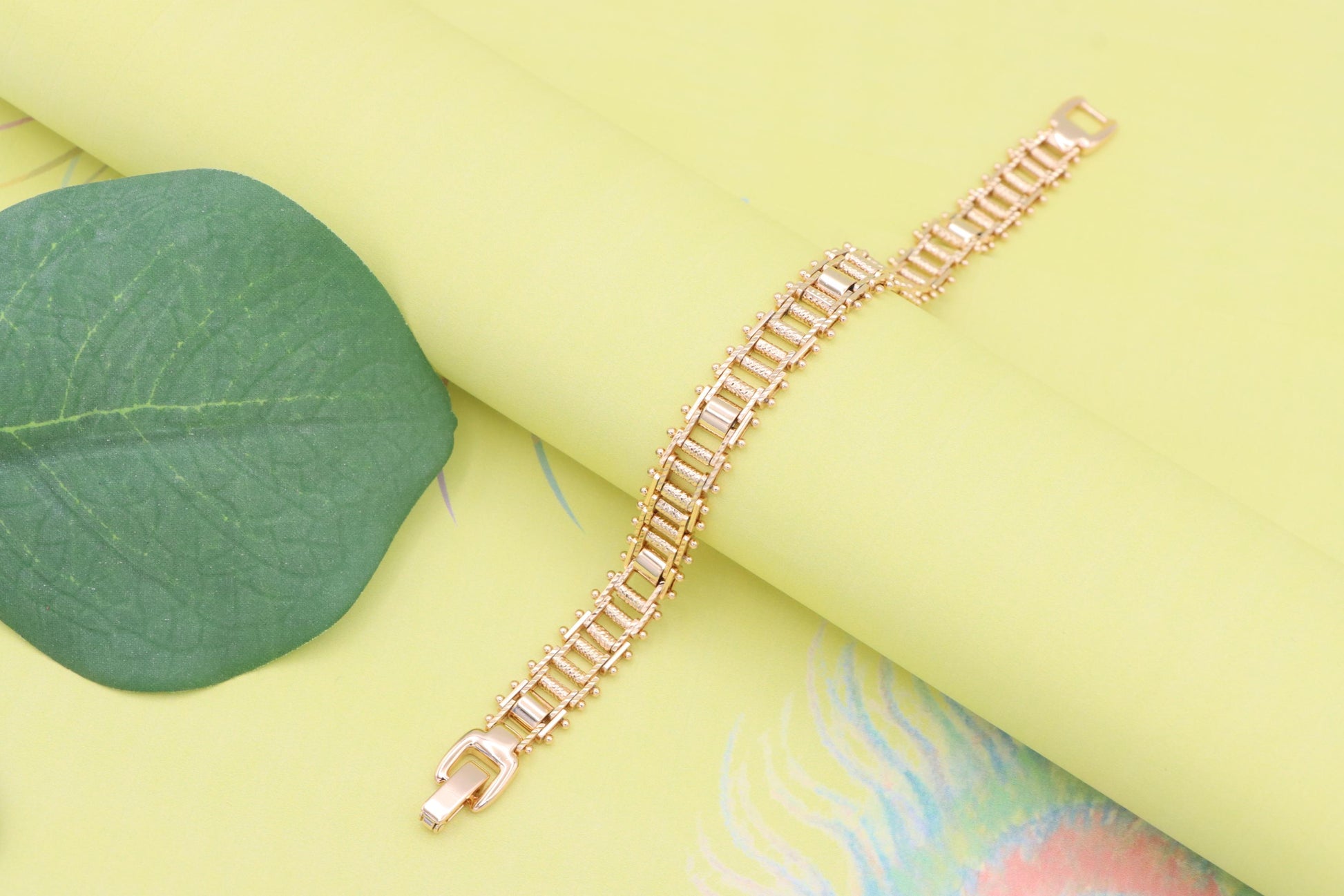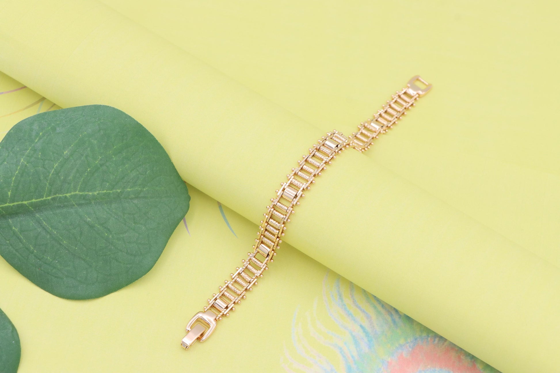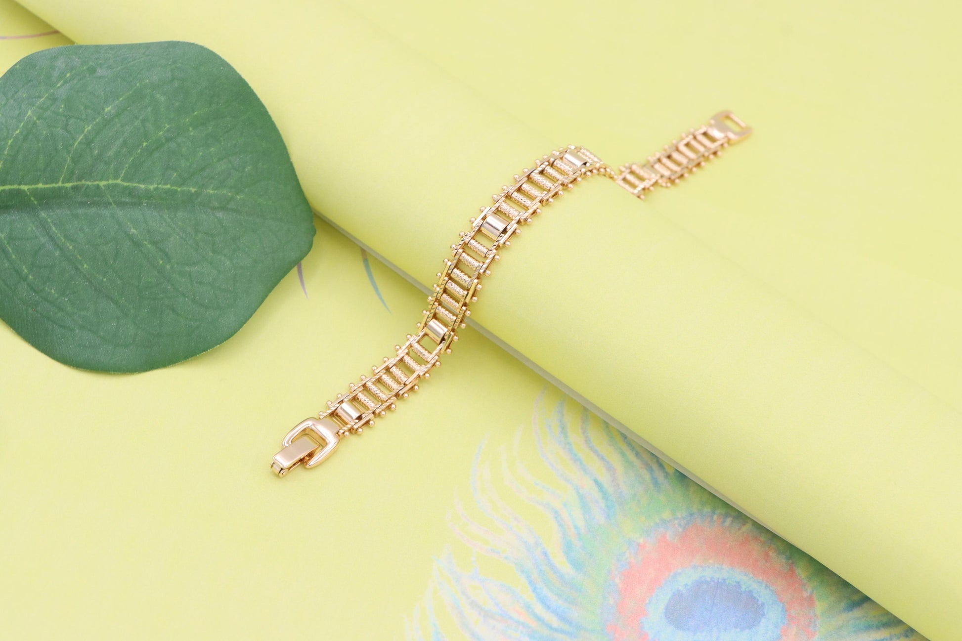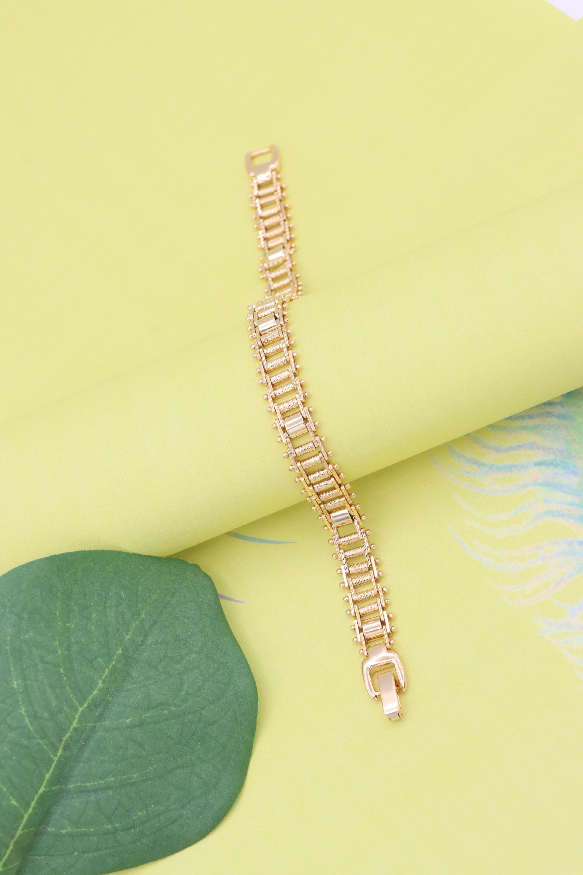 Elevate your style with this chic rose gold bracelet, crafted from high-quality brass and beautifully gold plated for a radiant finish. The bracelet features a unique textured link design with detailed side accents for a luxurious look.