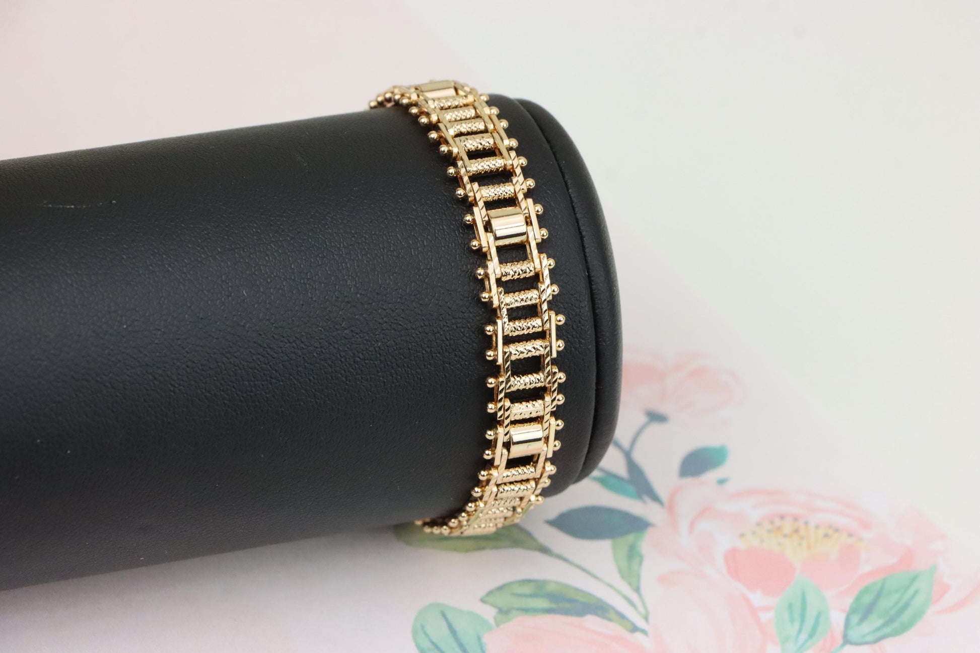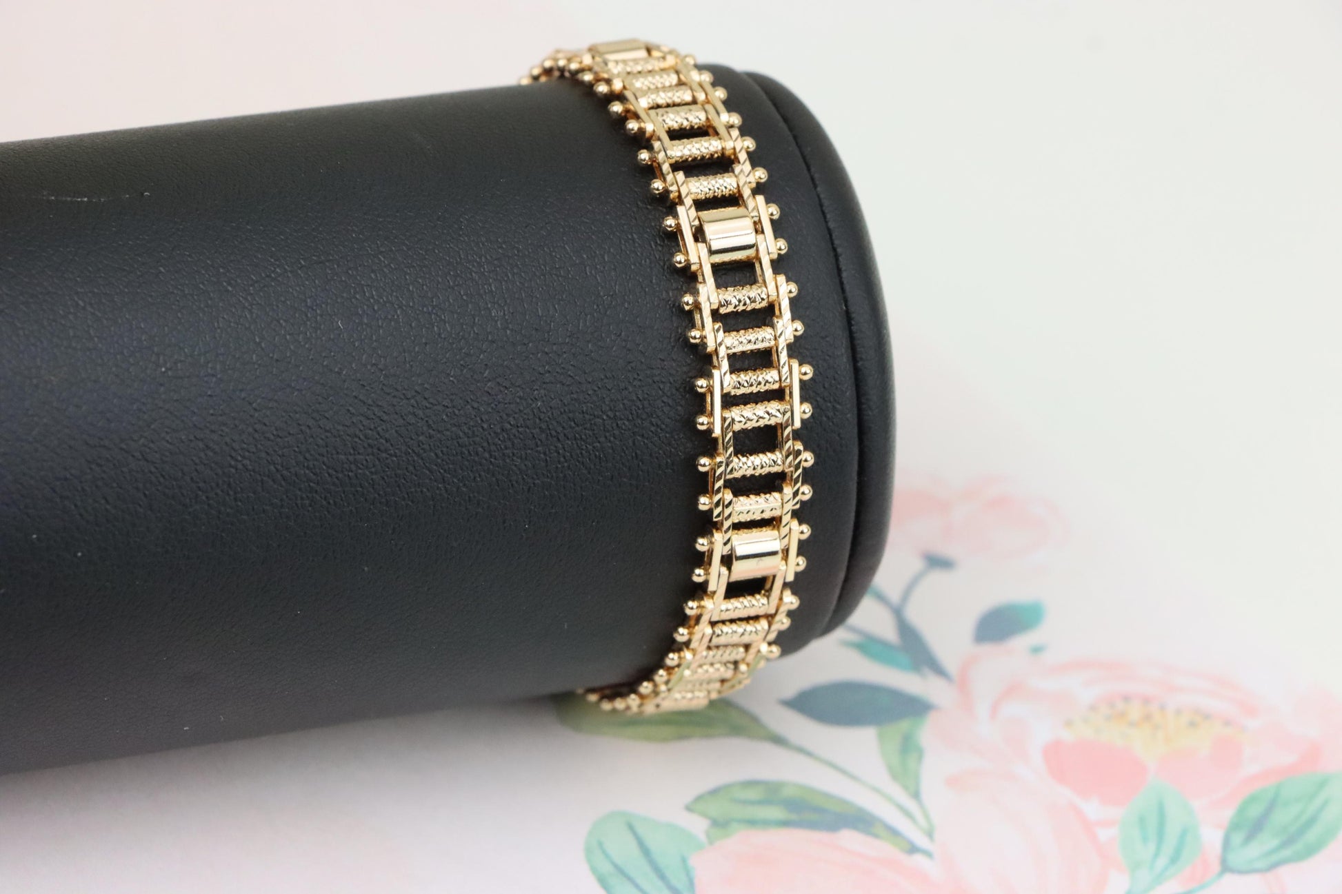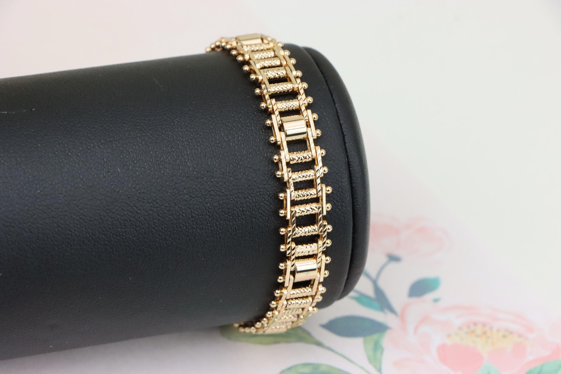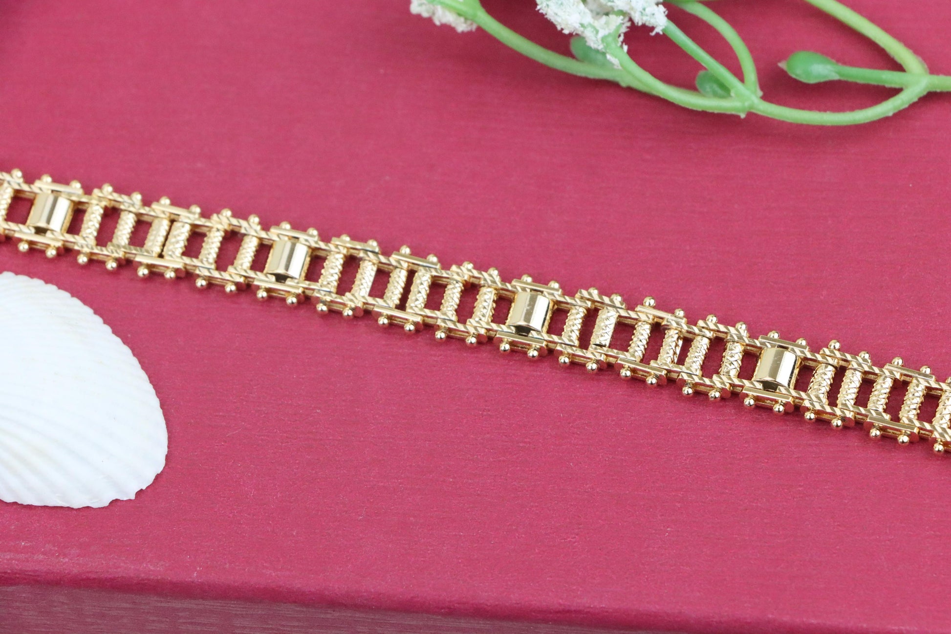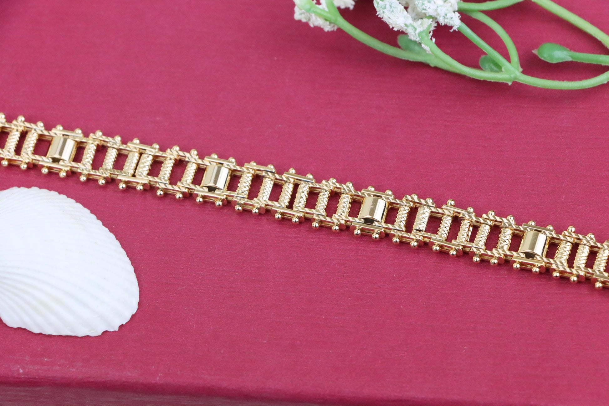 Elevate your style with this chic rose gold bracelet, crafted from high-quality brass and beautifully gold plated for a radiant finish. The bracelet features a unique textured link design with detailed side accents for a luxurious look.