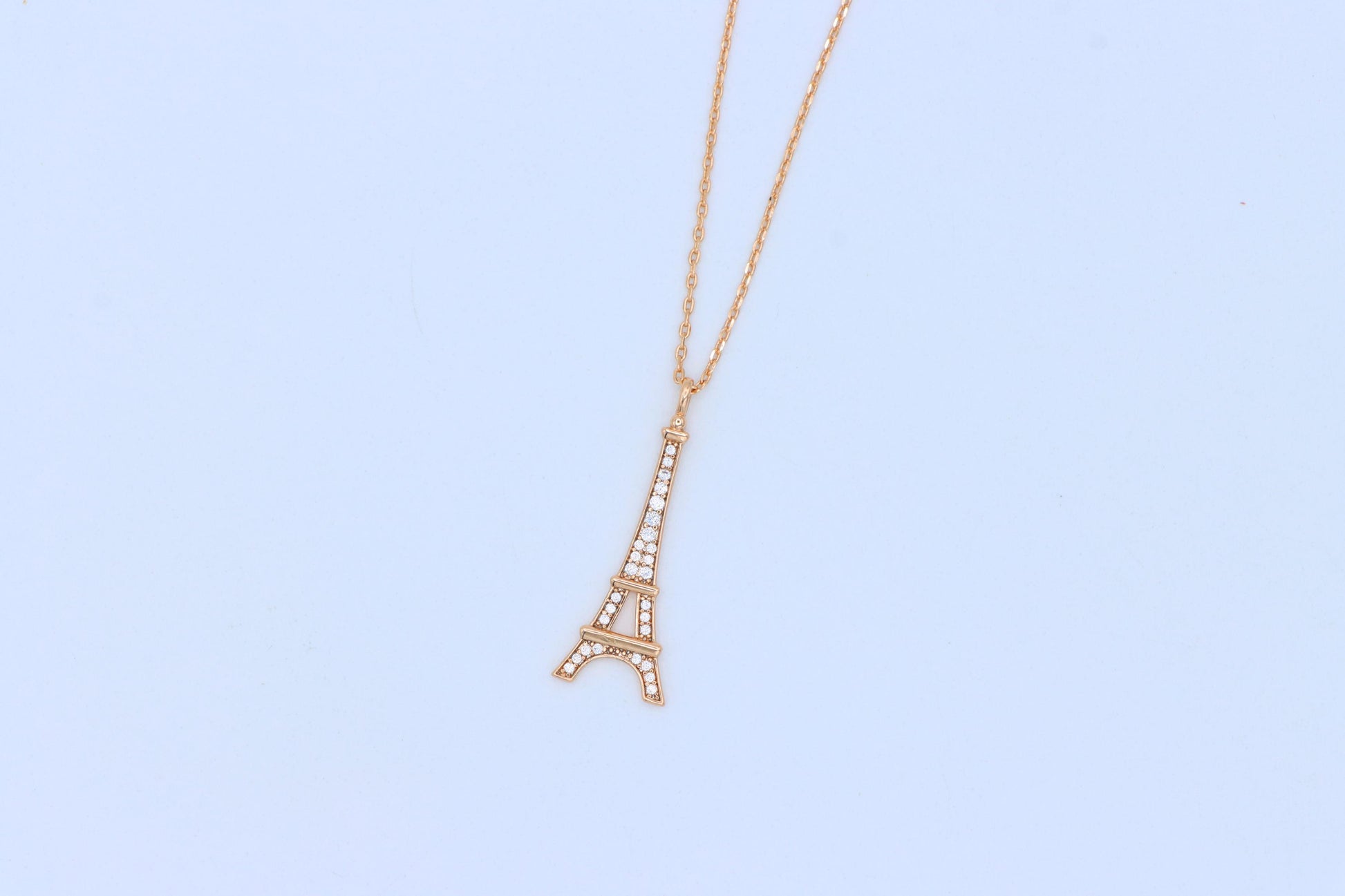 Elegant rose gold necklace featuring a crystal-studded Eiffel Tower pendant, perfect for adding Parisian charm to any outfit.