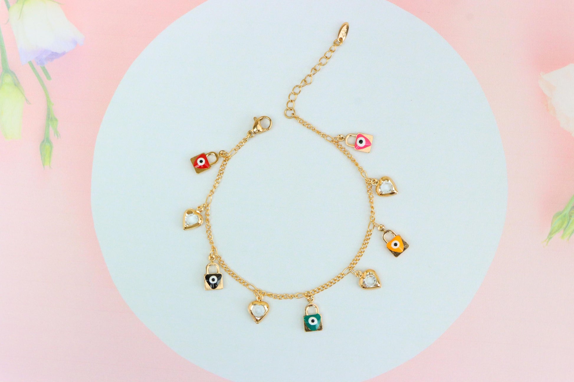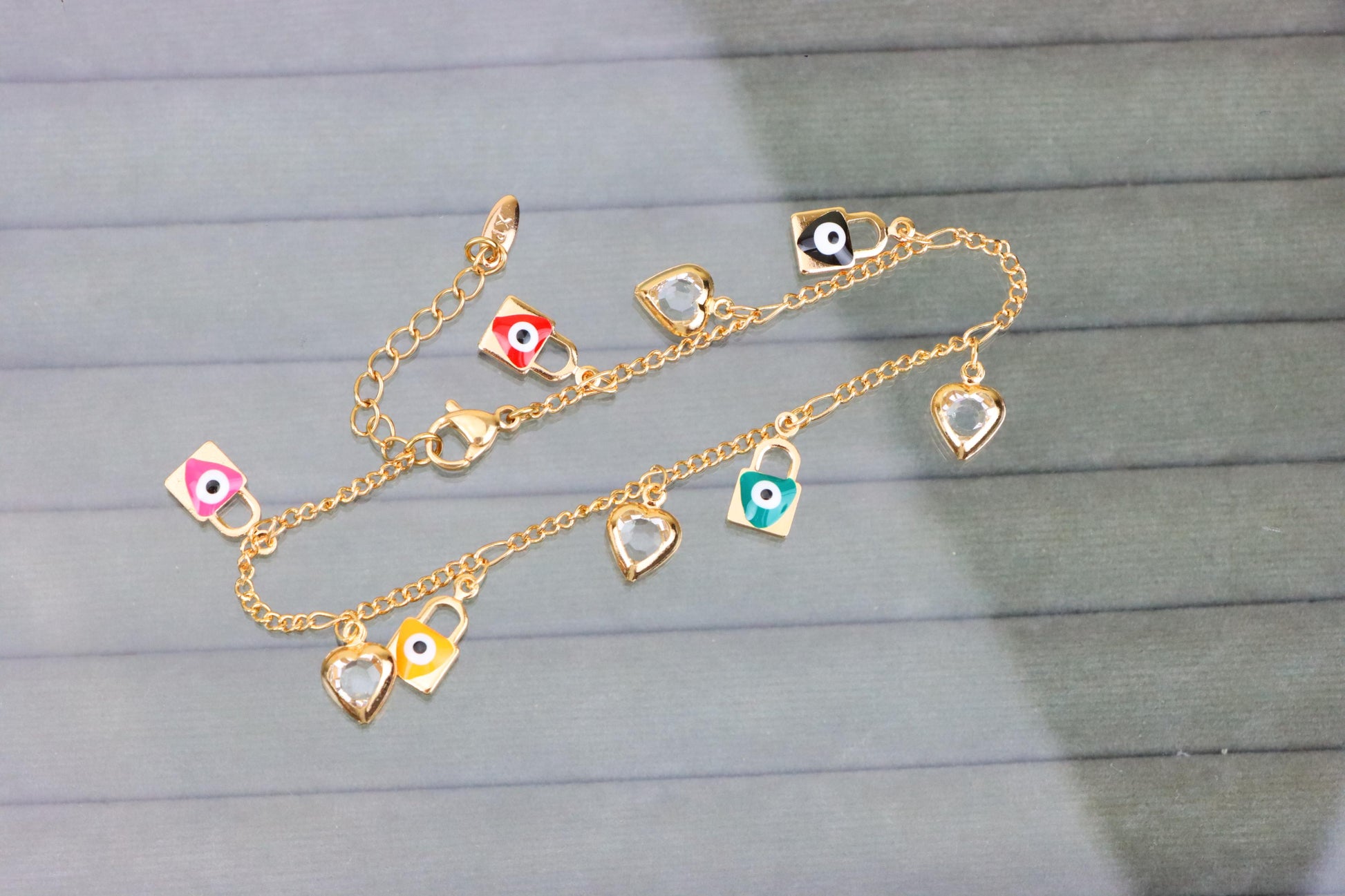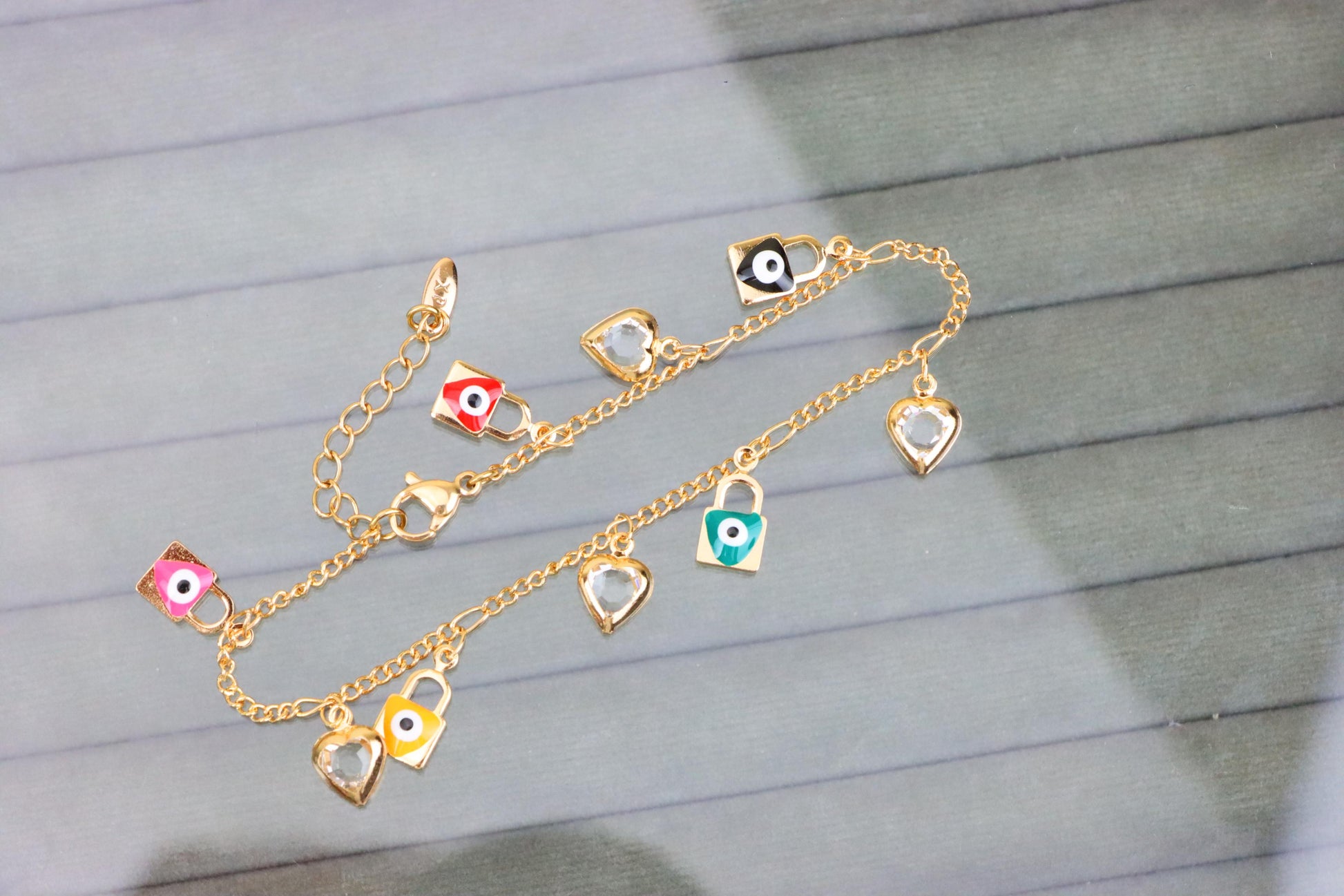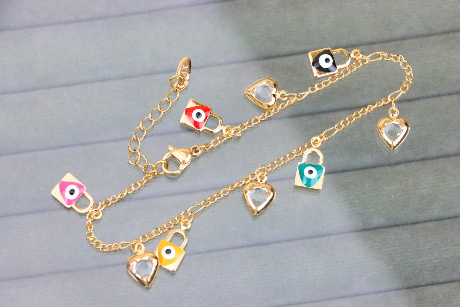 ✓ Adorned with alternating evil eye charms and heart-shaped crystals