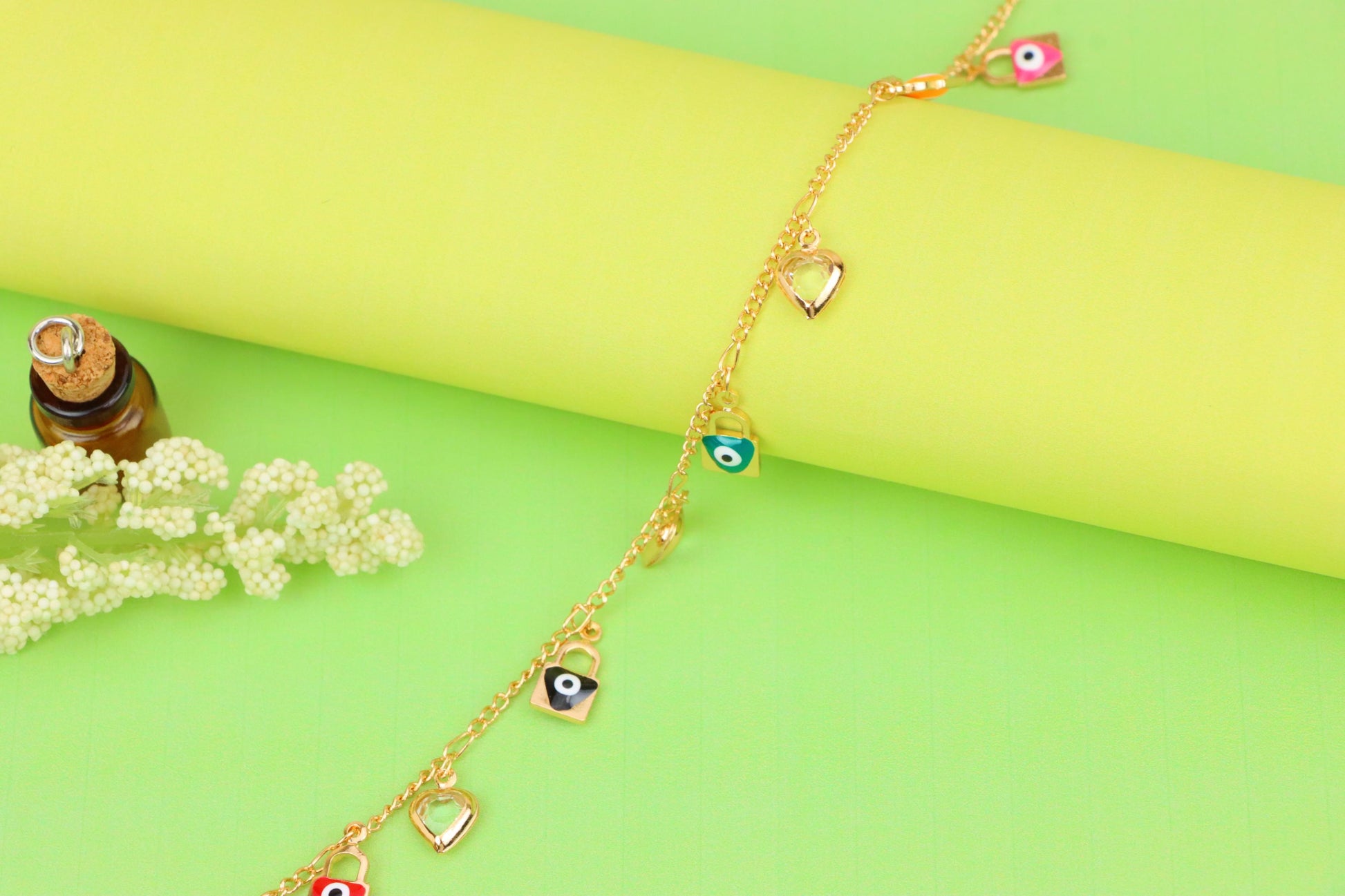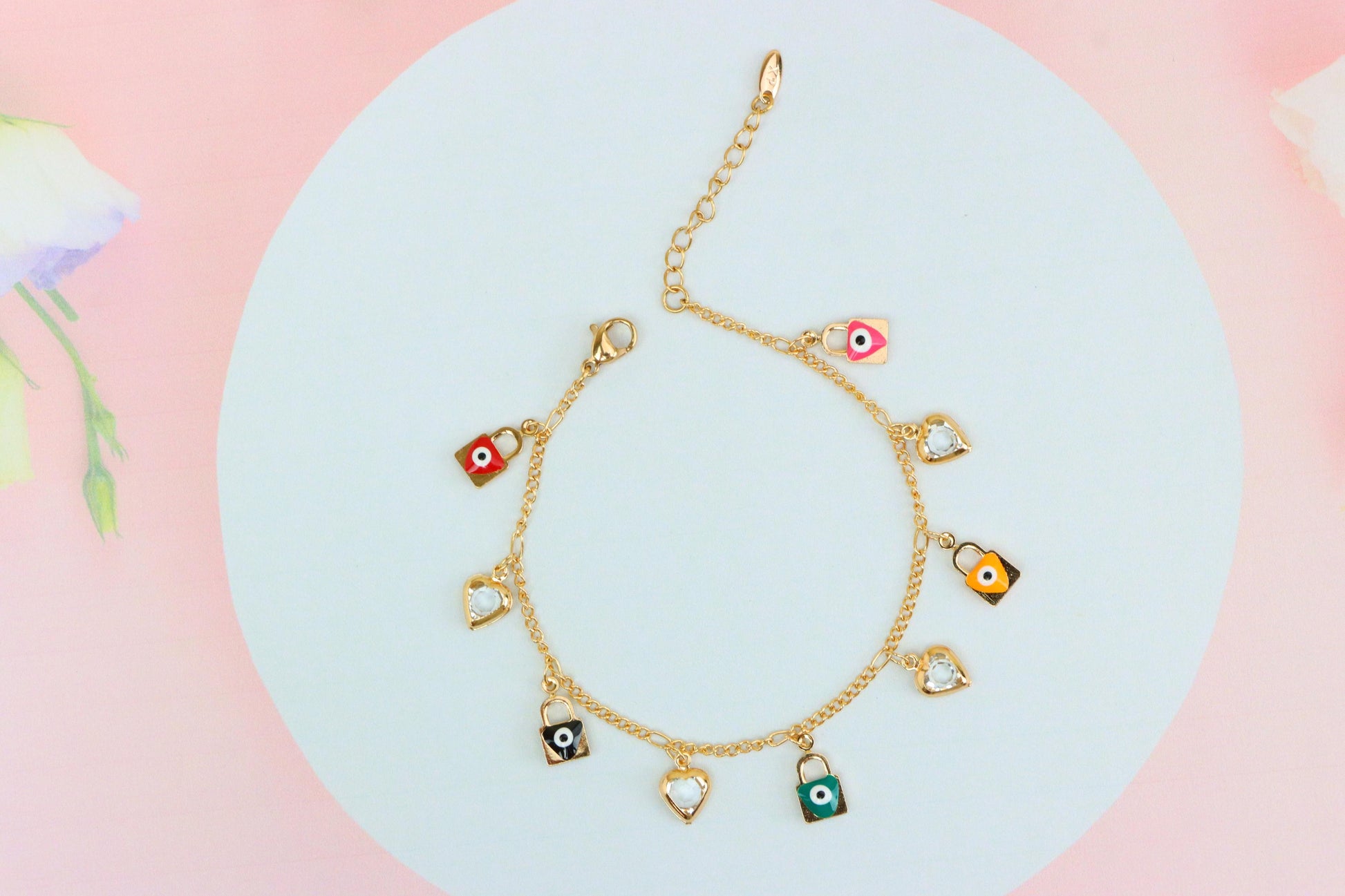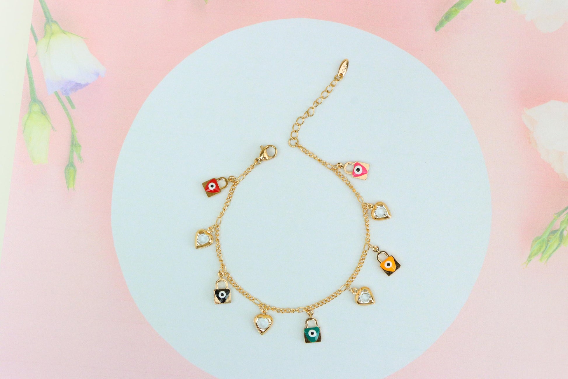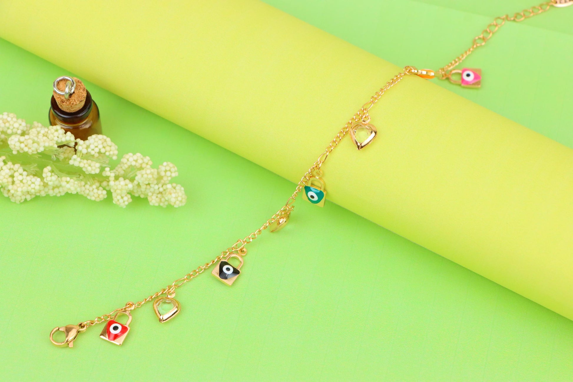 ✓ Adorned with alternating evil eye charms and heart-shaped crystals
