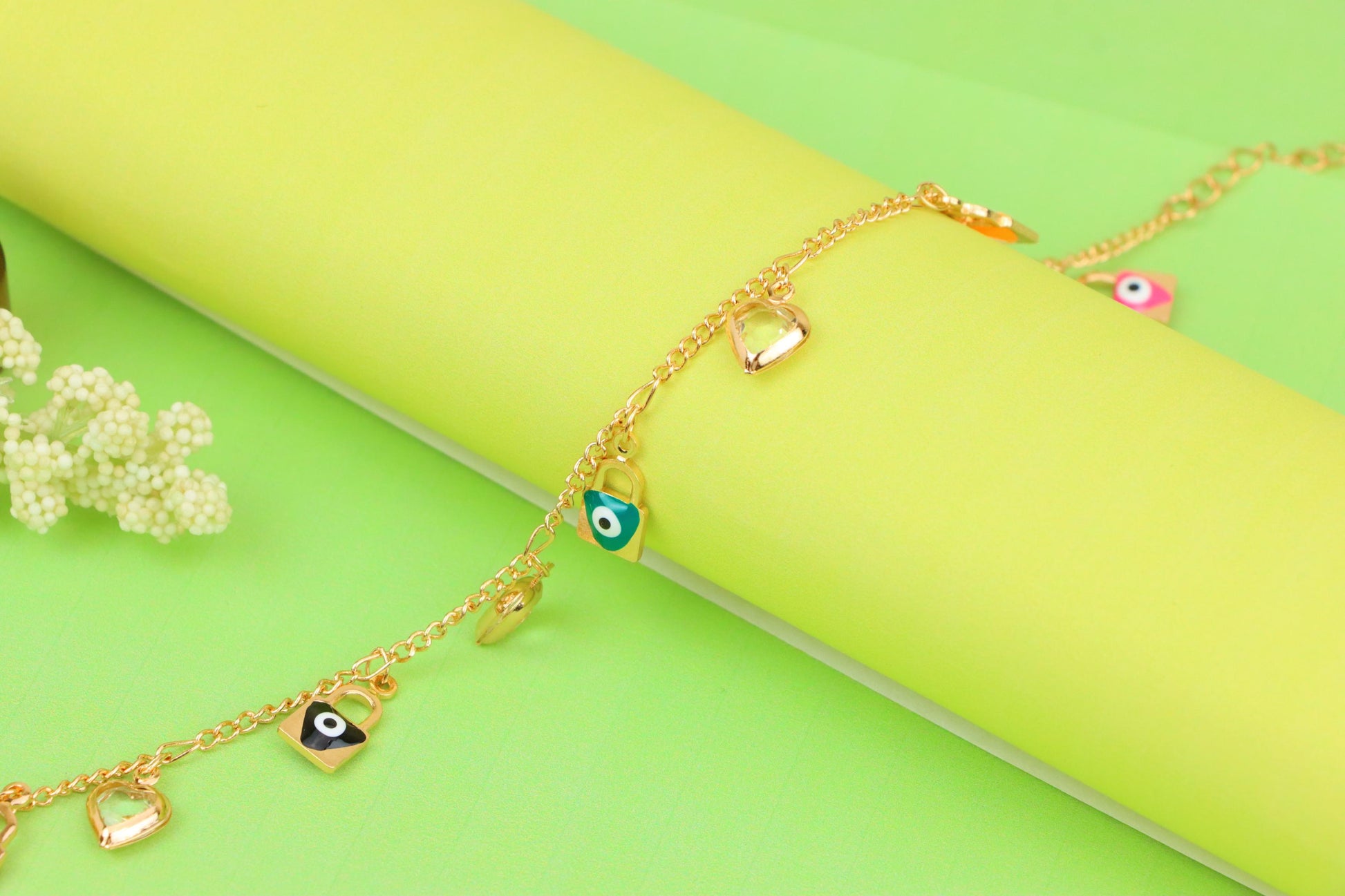 Rose Gold Evil Eye & Heart Charm Anklet in Gold Plated Brass, XPAL1193
