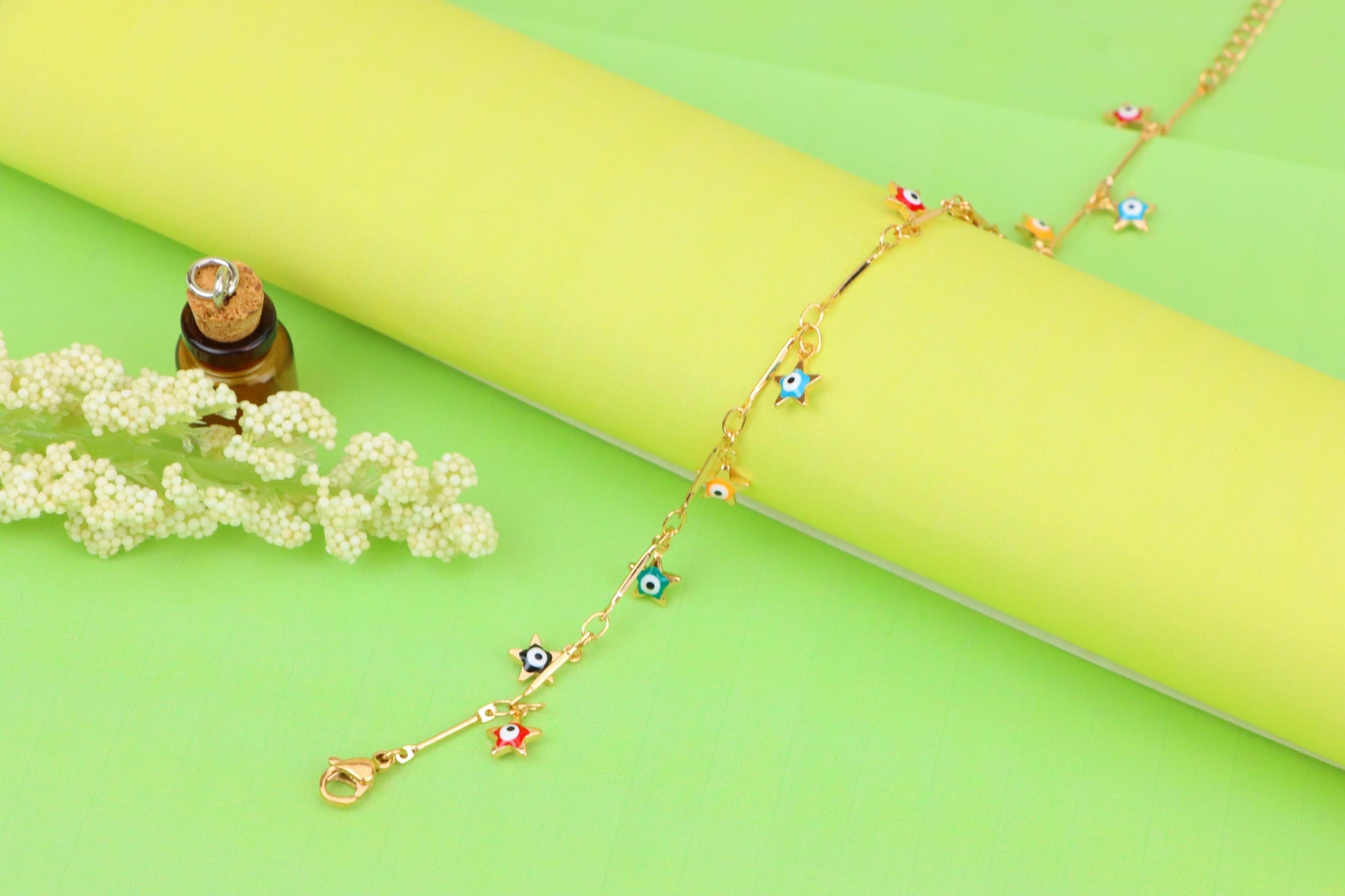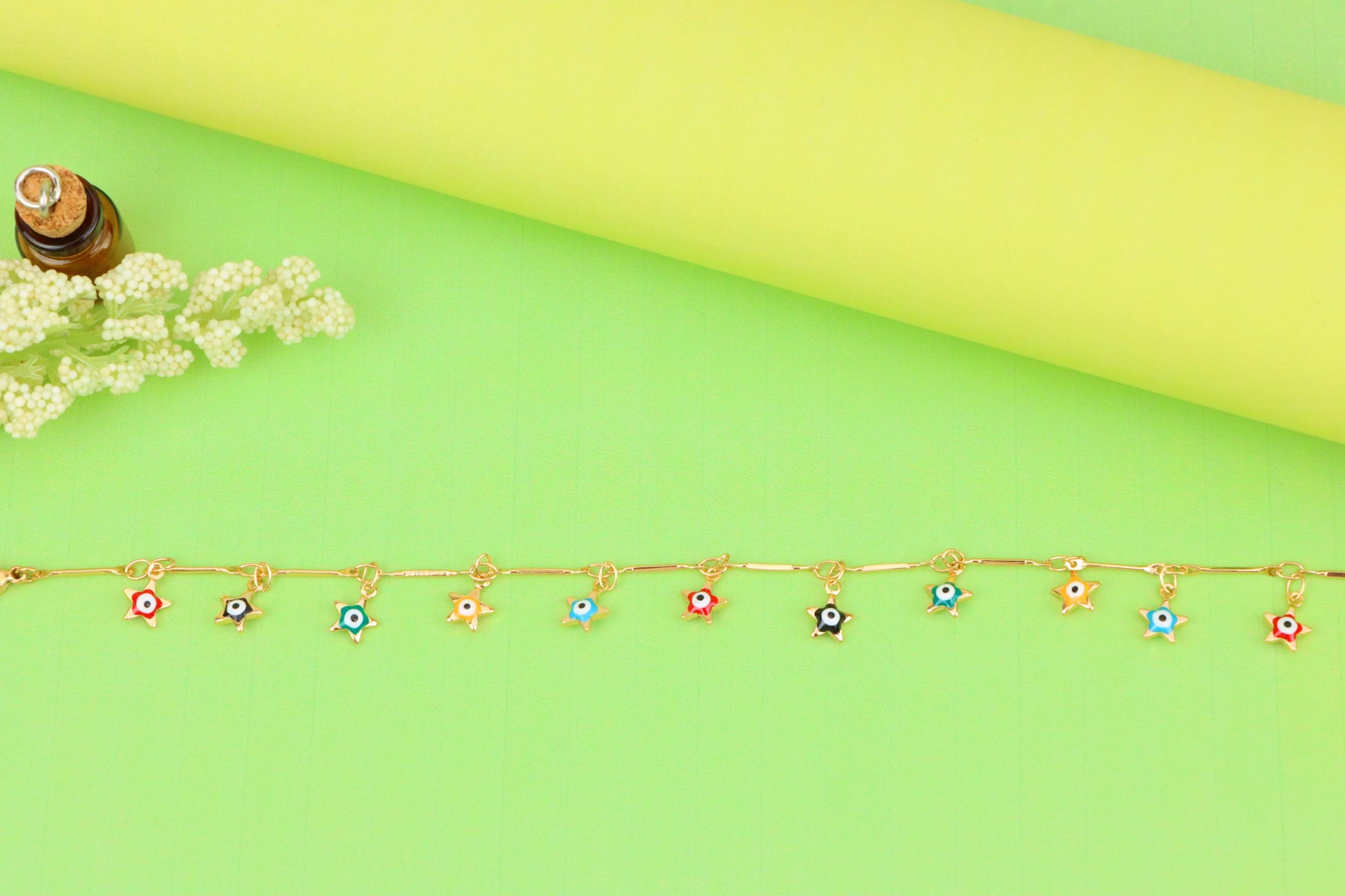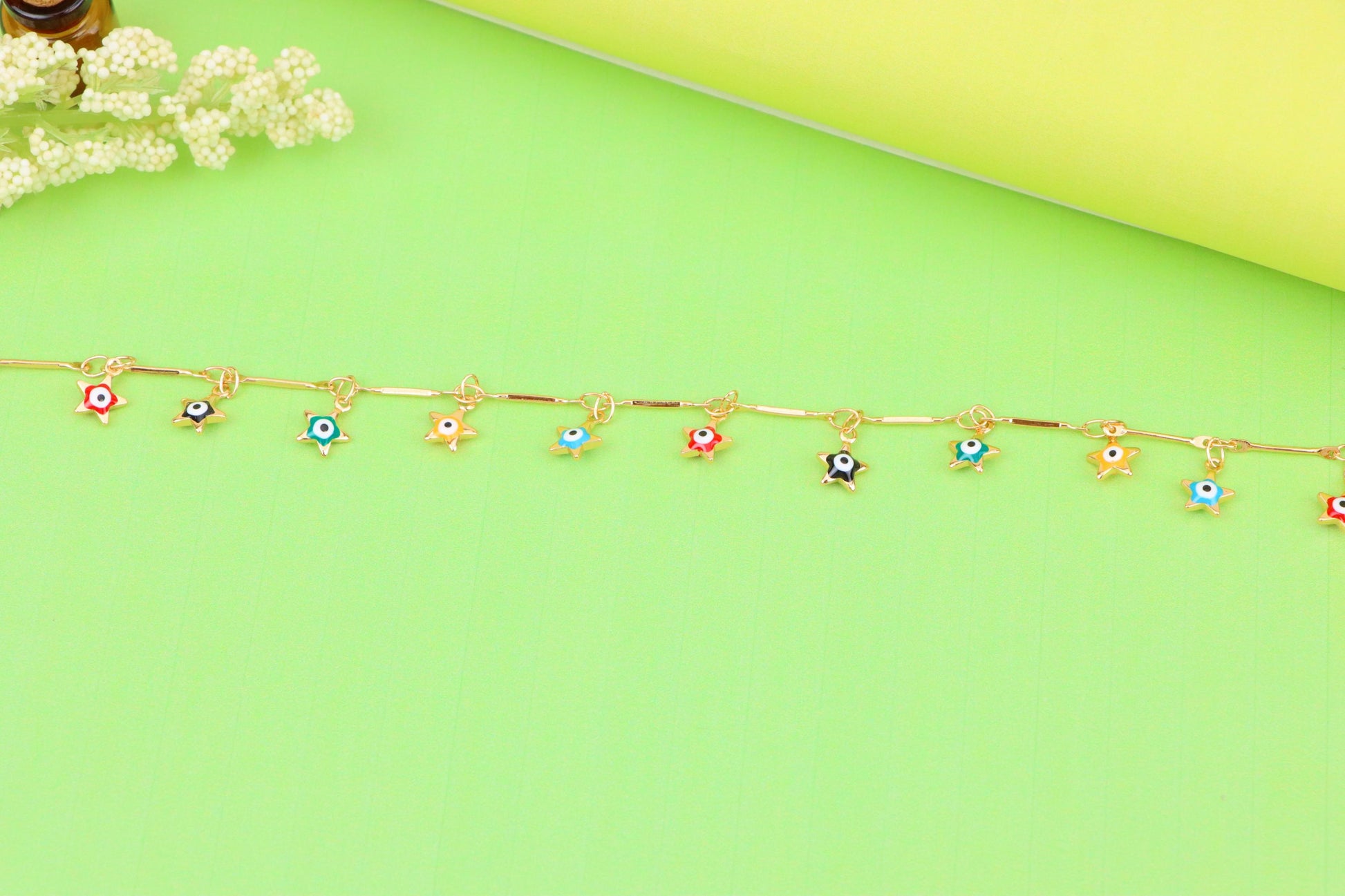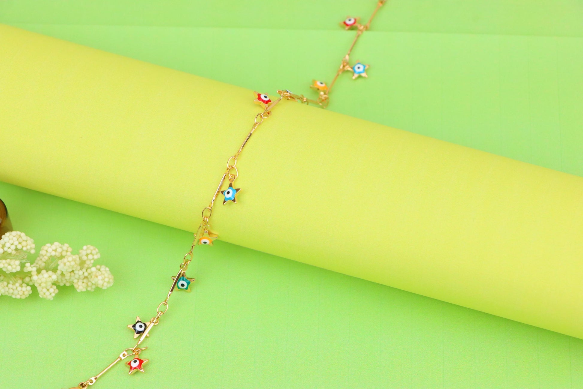 Delicate and stylish, this Rose Gold Anklet adds charm to any outfit with its vibrant evil eye star charms.