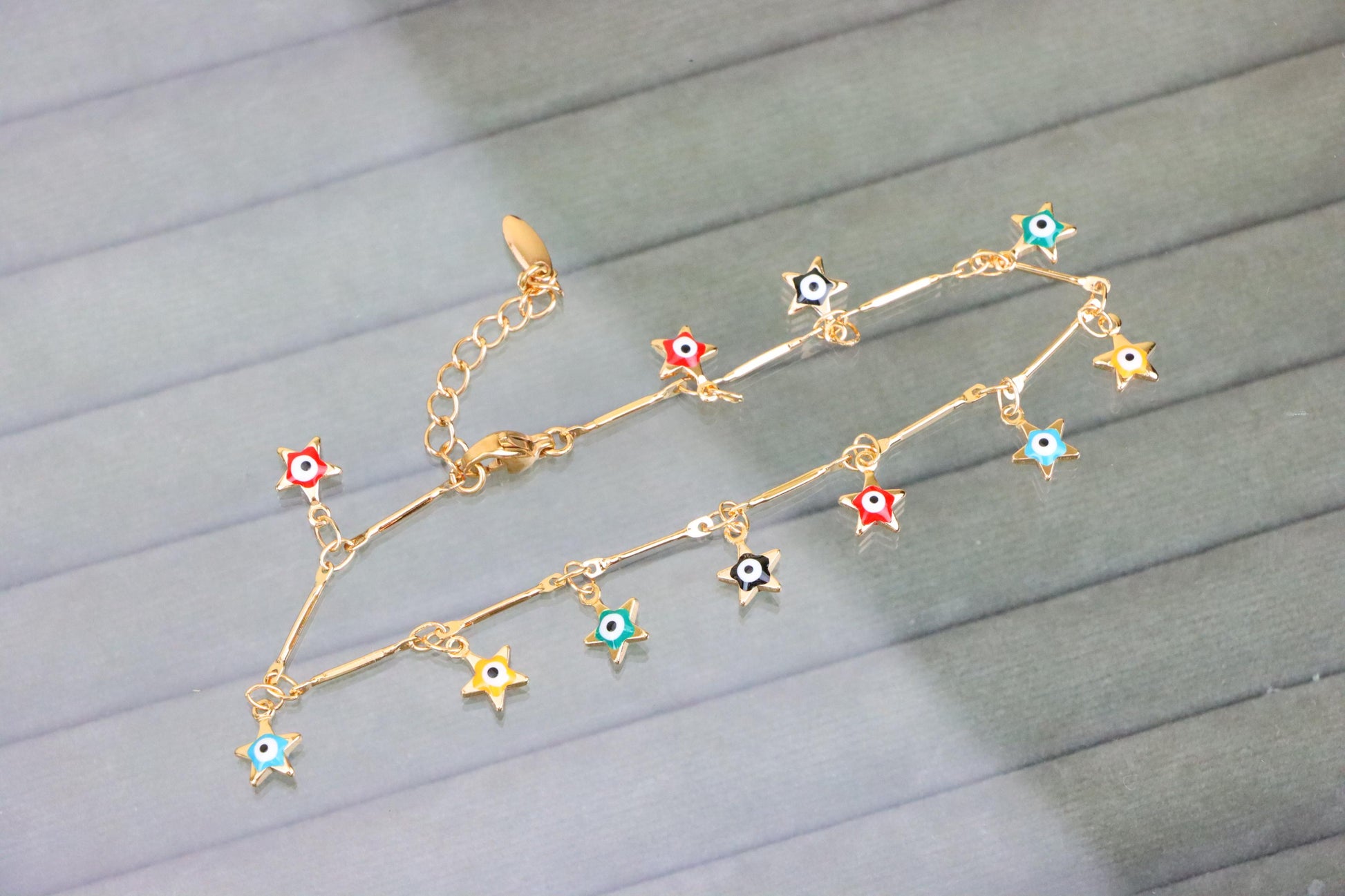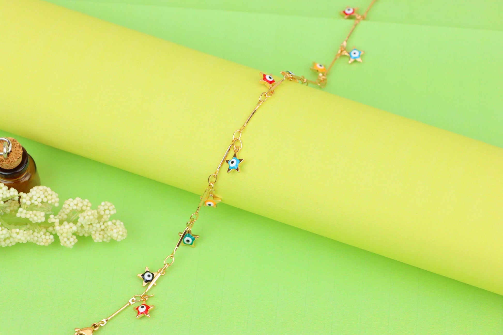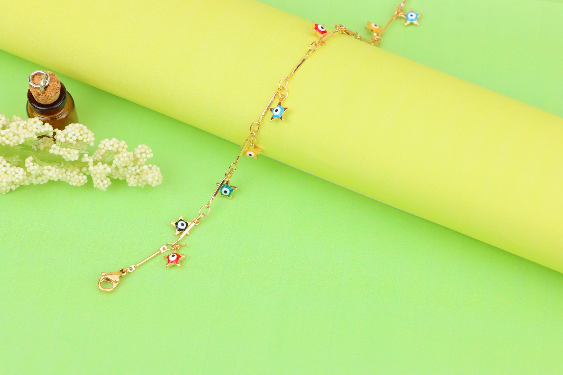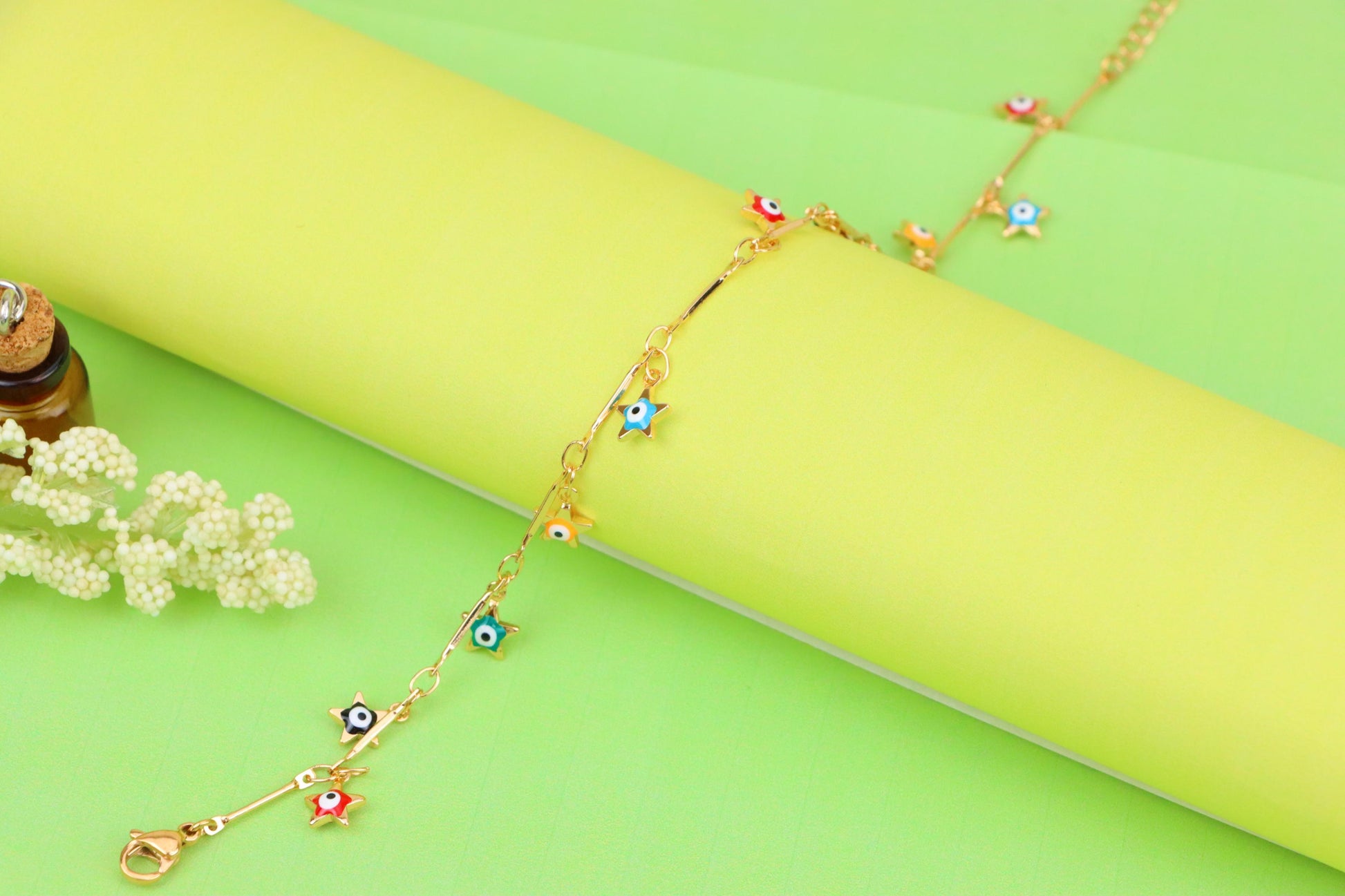 Delicate and stylish, this Rose Gold Anklet adds charm to any outfit with its vibrant evil eye star charms.