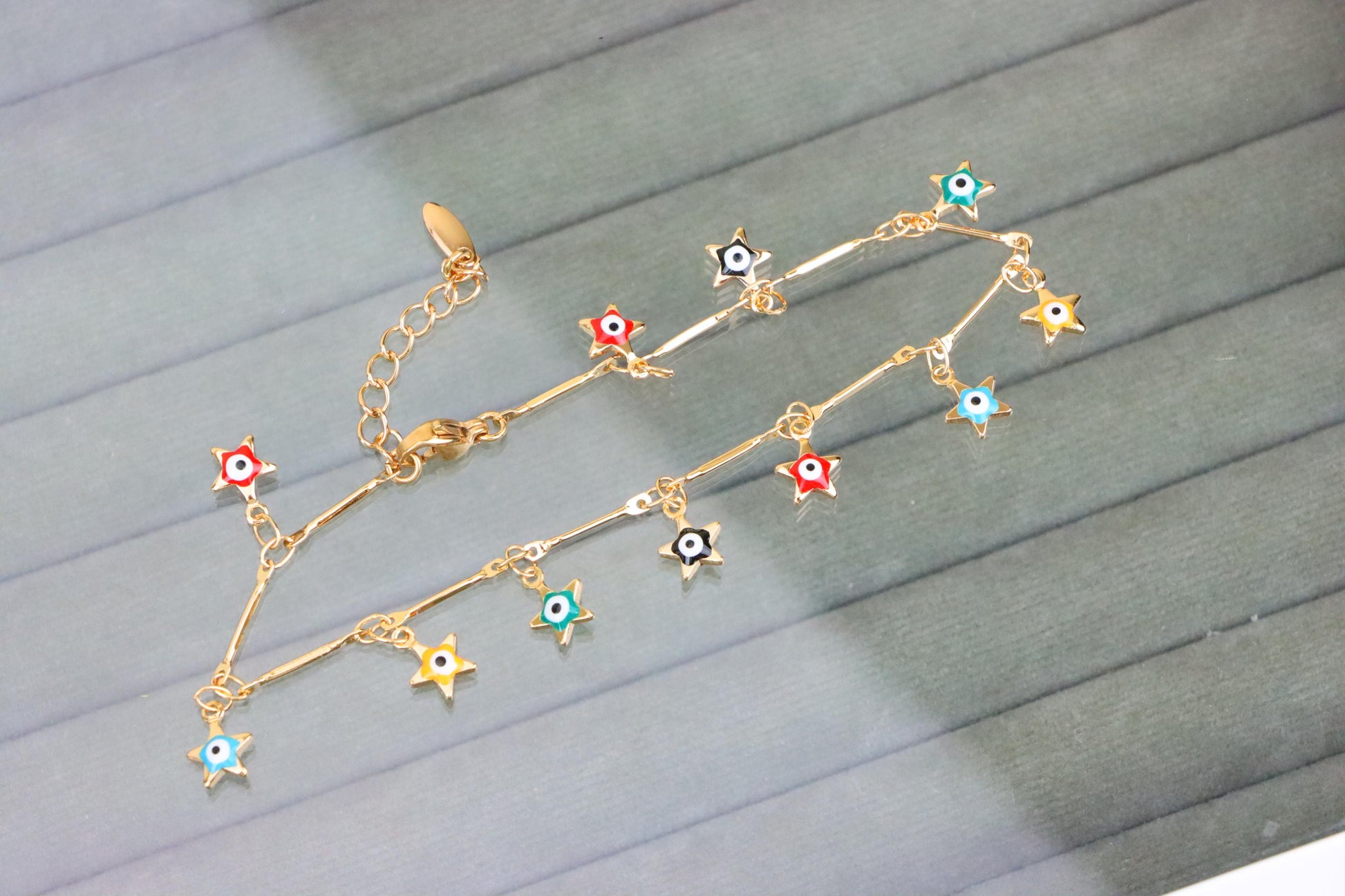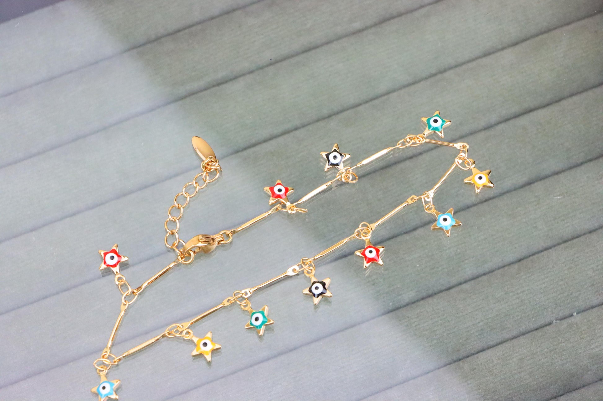 Rose Gold Evil Eye Anklet with Colorful Star Charms, XPAL1192