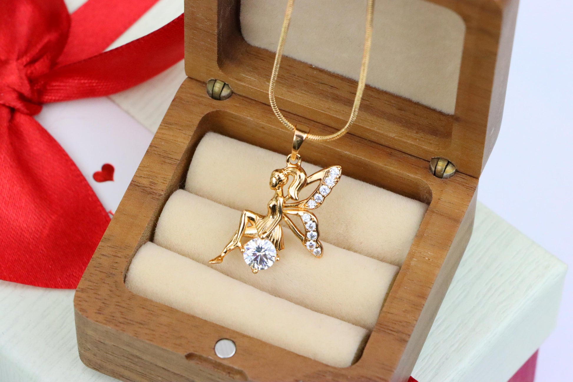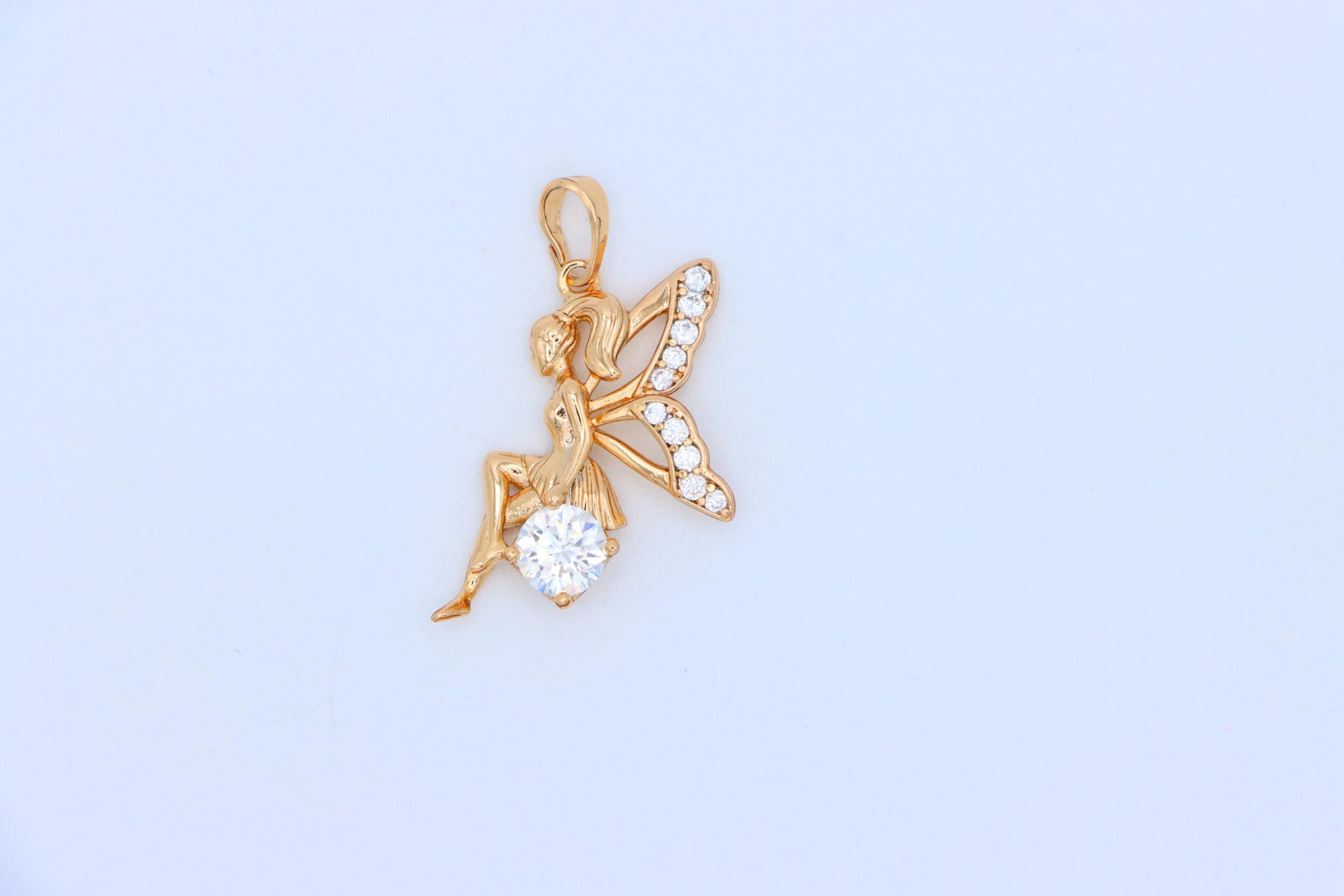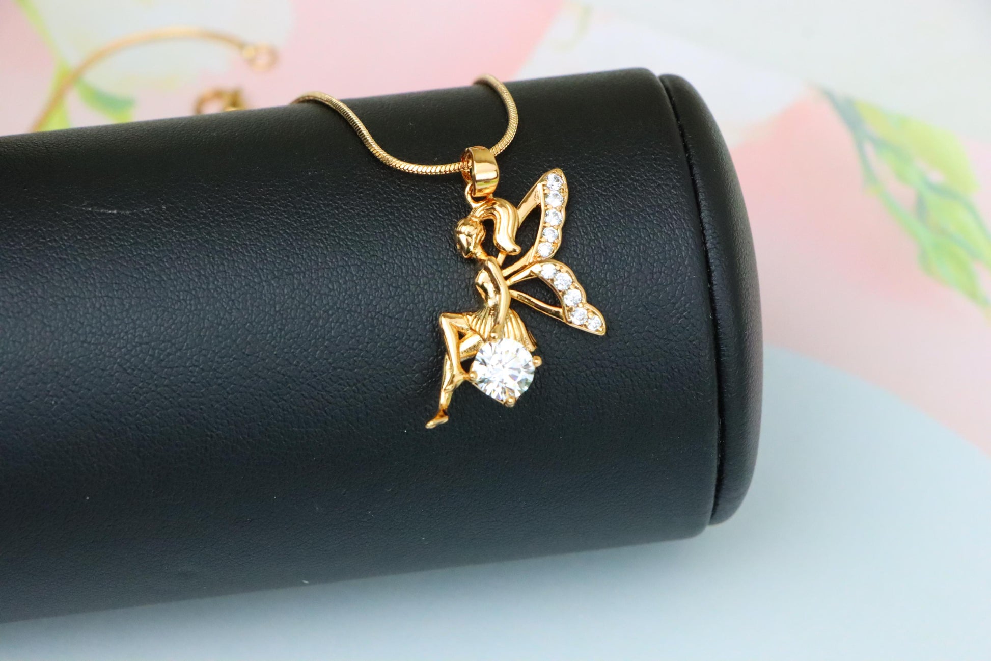 Delicately designed rose gold fairy pendant with sparkling wing details.