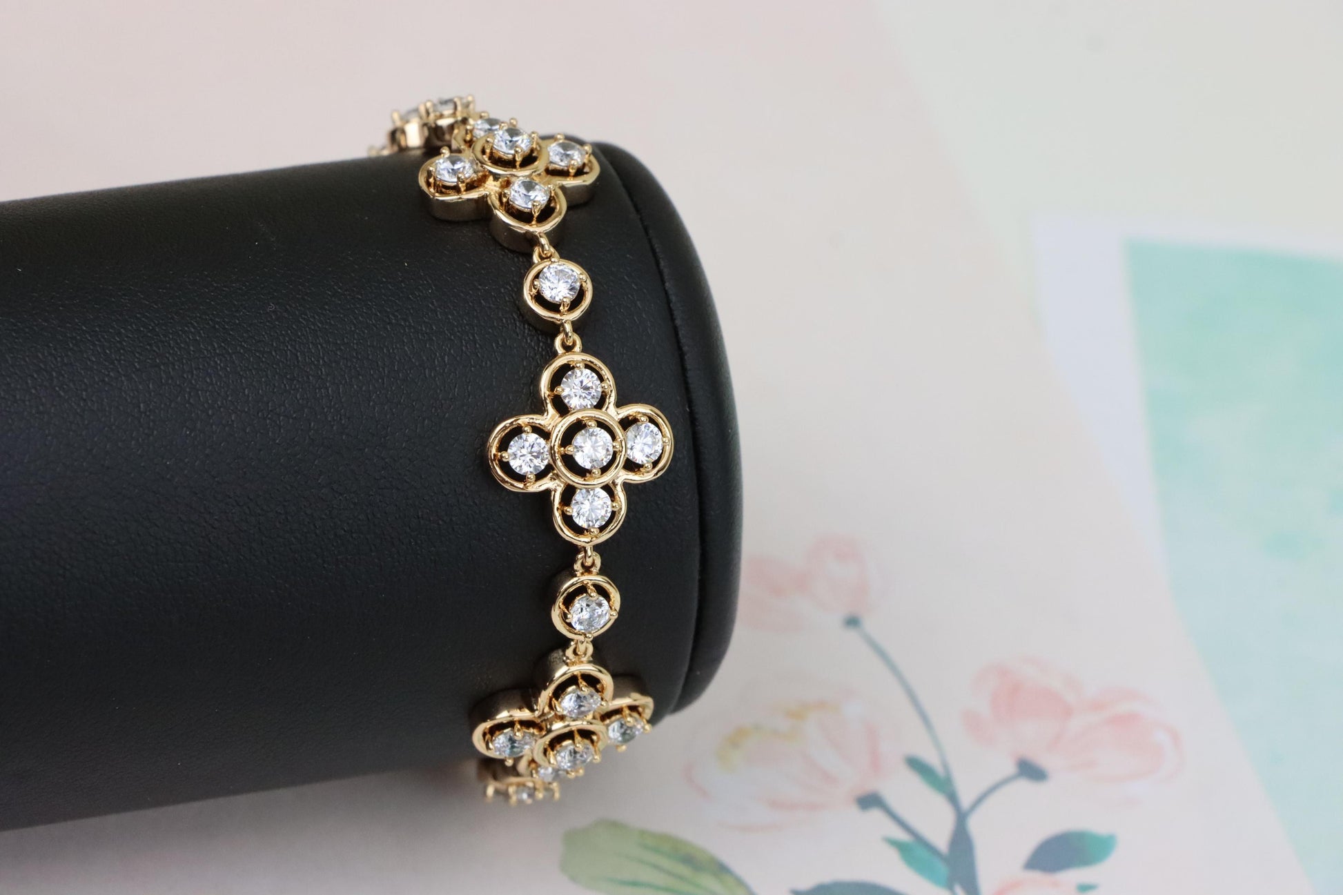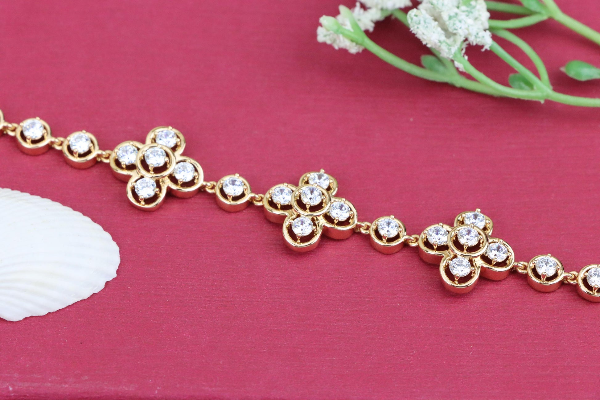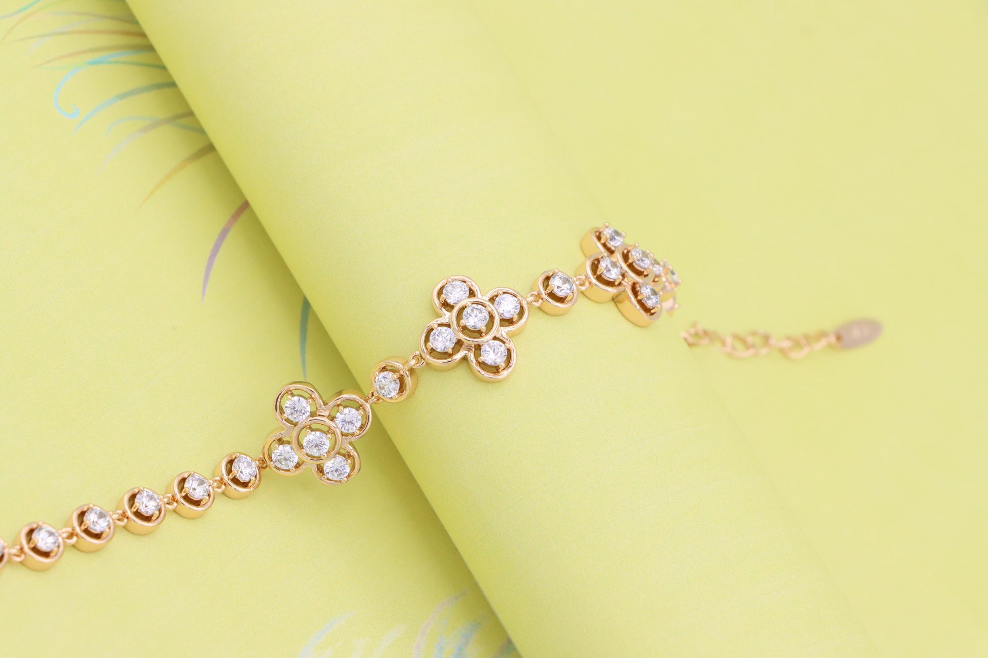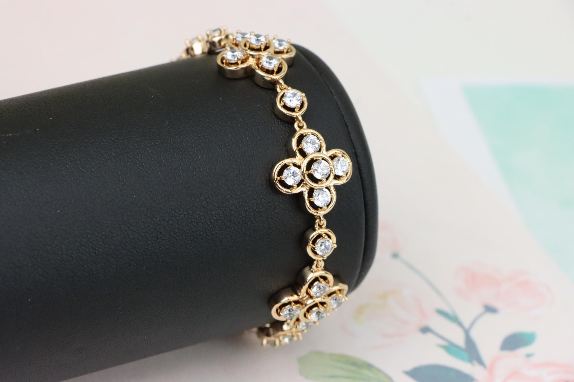 Elegant rose gold bracelet featuring a floral-inspired design with sparkling crystal clusters.