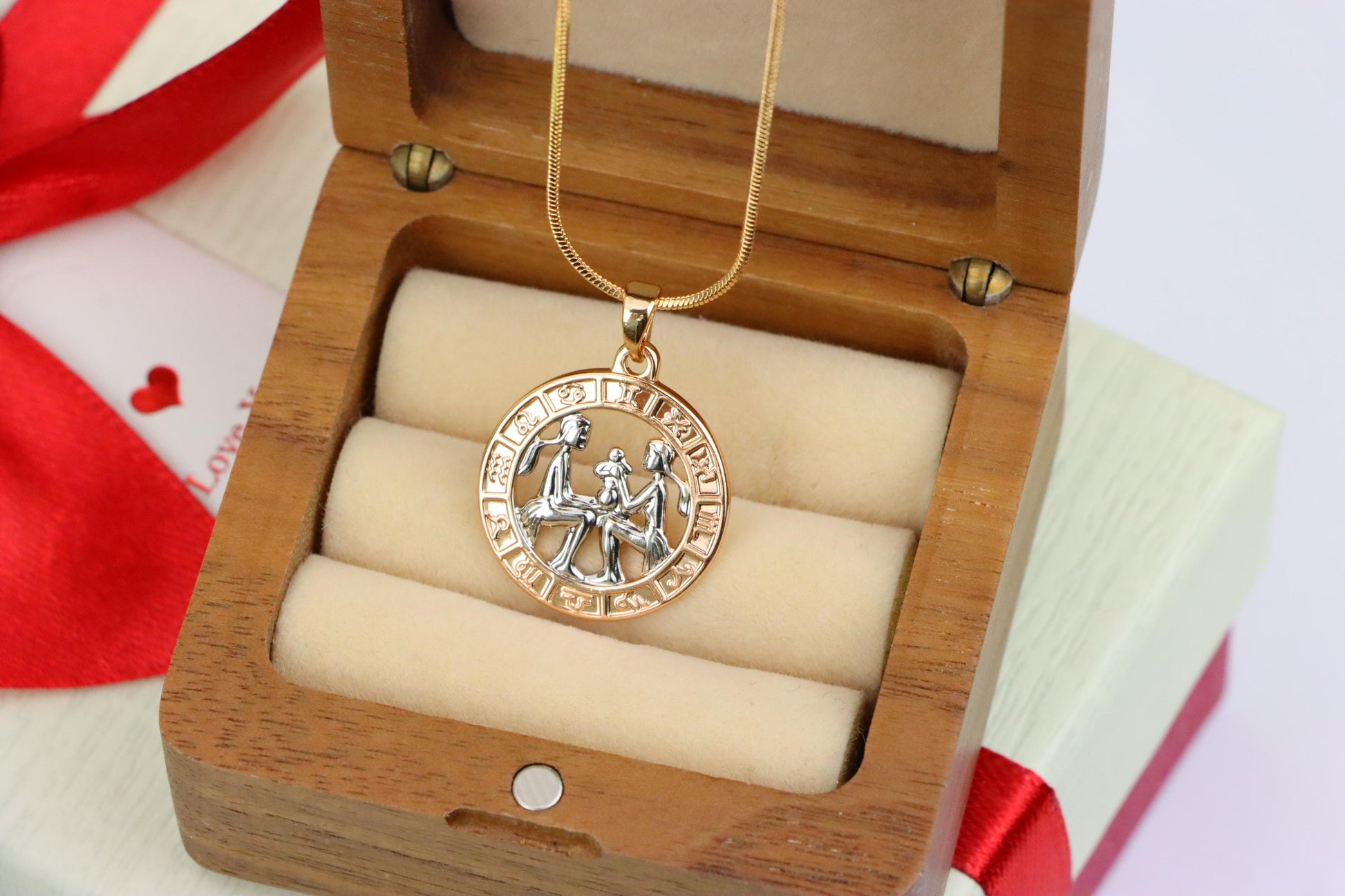 Add charm and character to your jewelry collection with this elegant rose gold Gemini pendant, symbolizing duality and intellect.