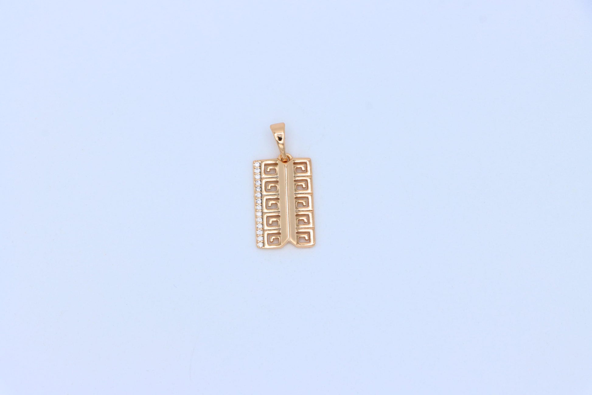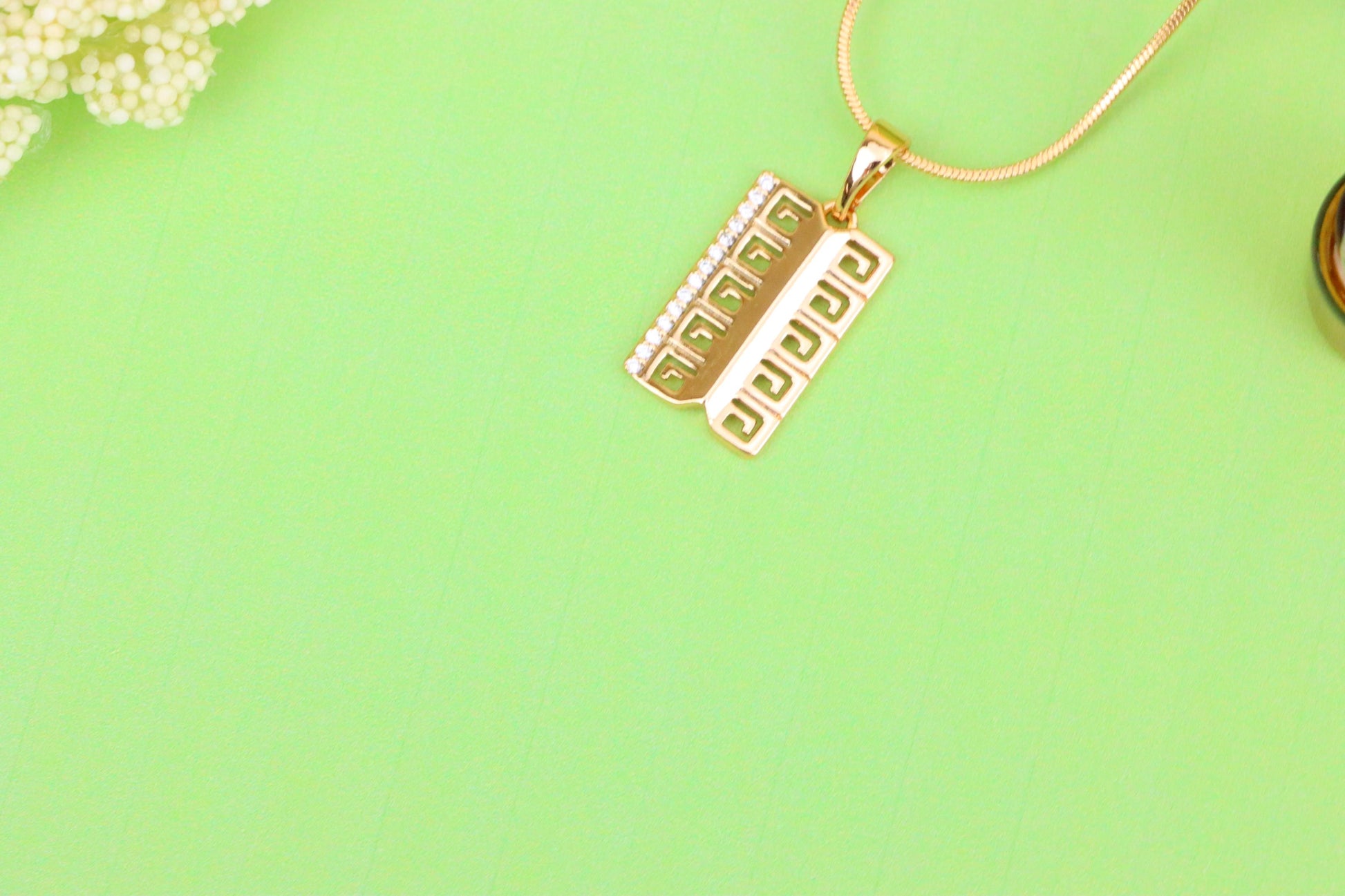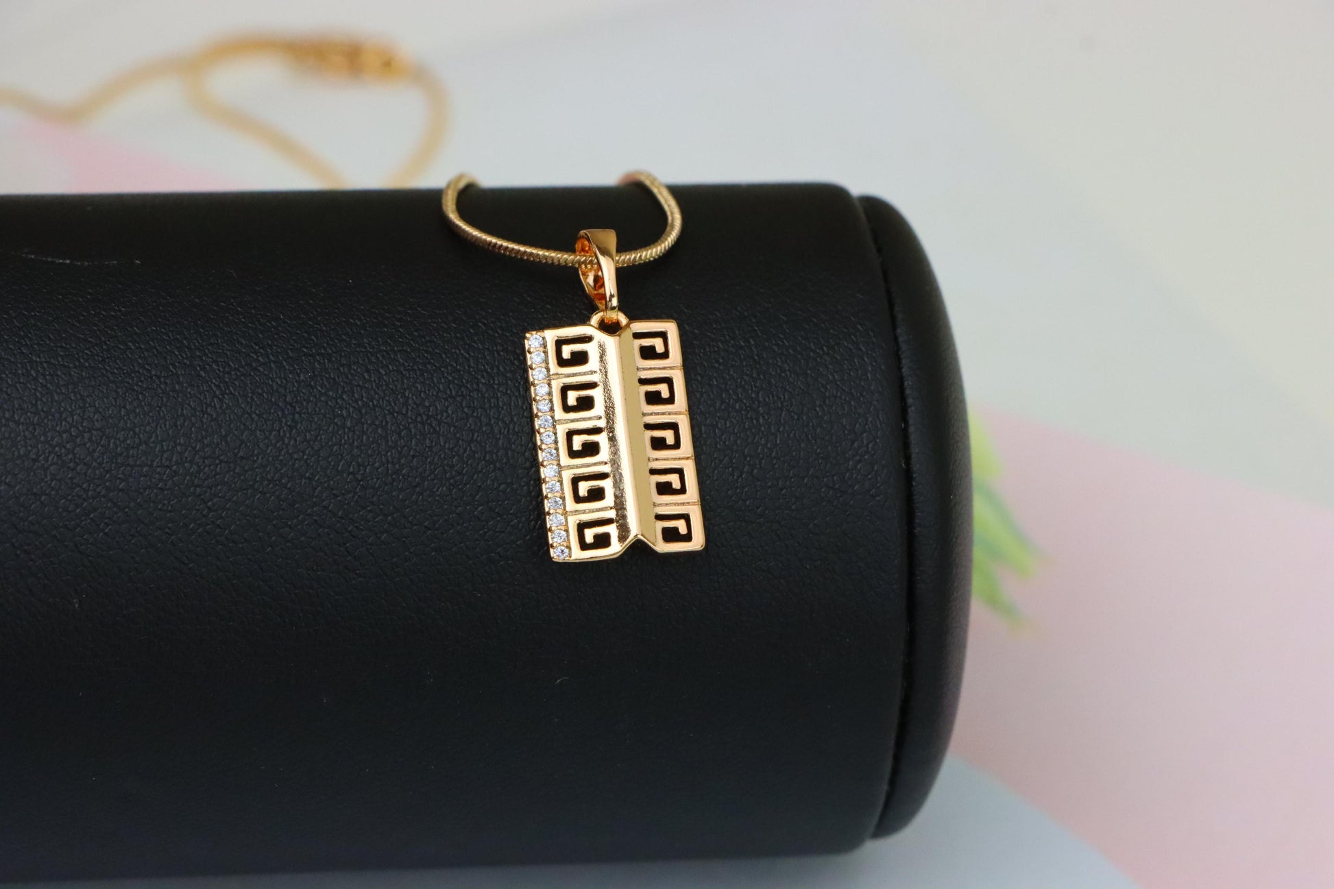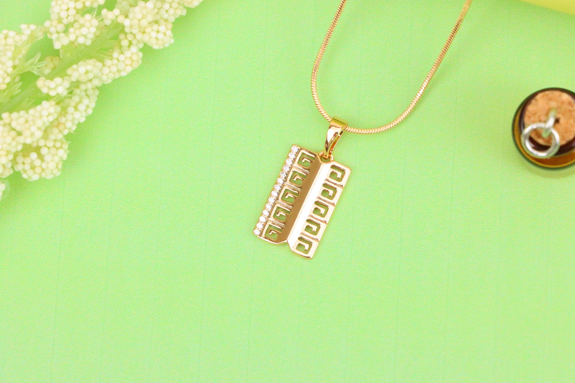 Modern and sleek rose gold rectangular pendant with geometric cutouts and a sparkling crystal line, designed to elevate any look.
