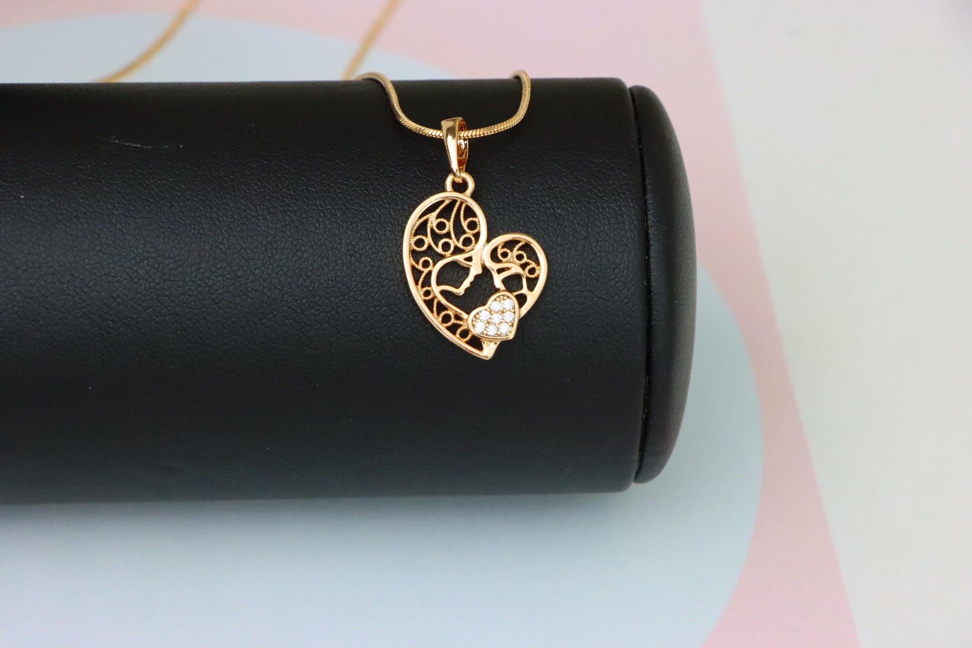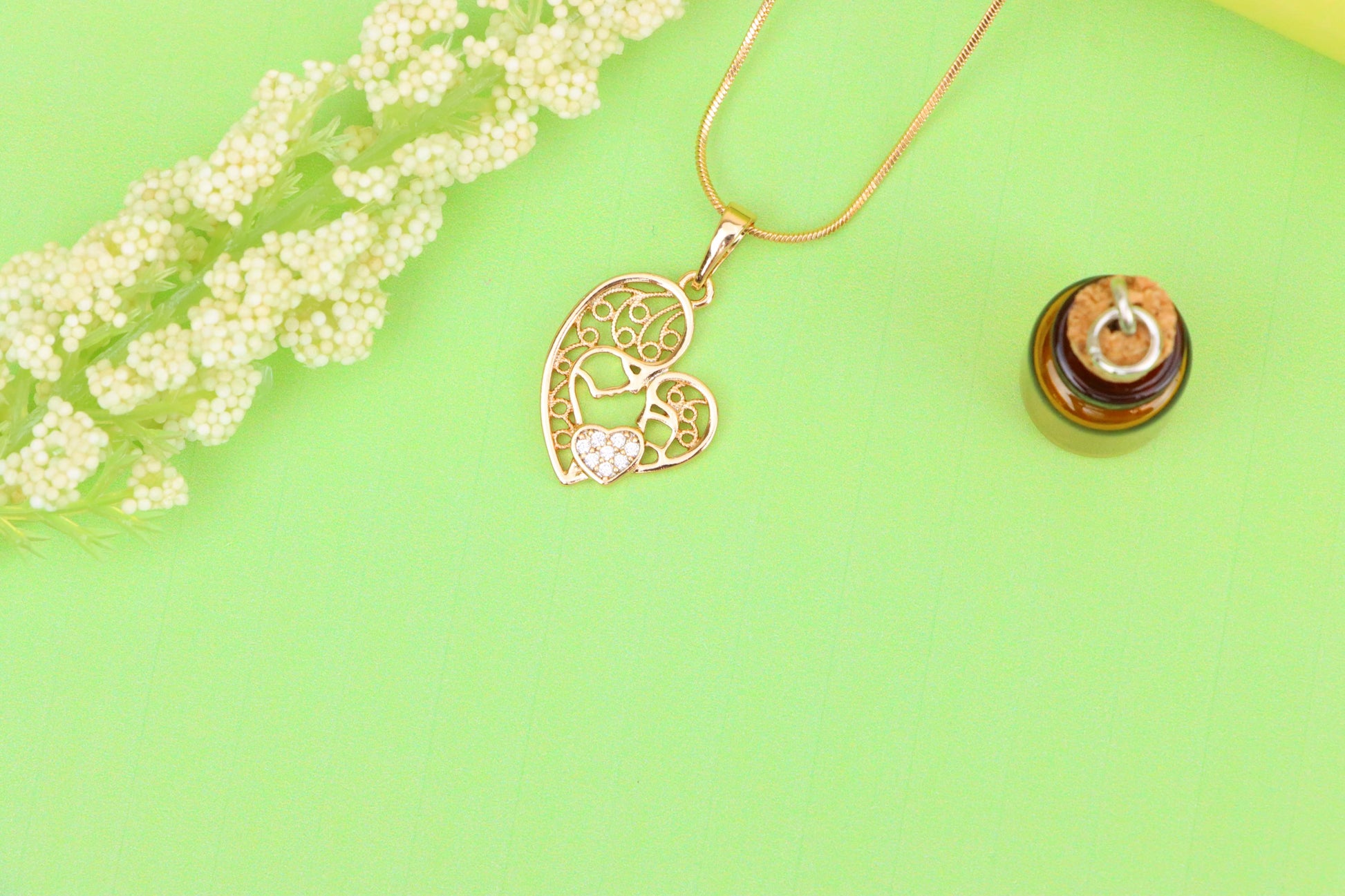 Charming rose gold heart-shaped pendant symbolizing a mother and child, beautifully accented with a sparkling crystal heart.