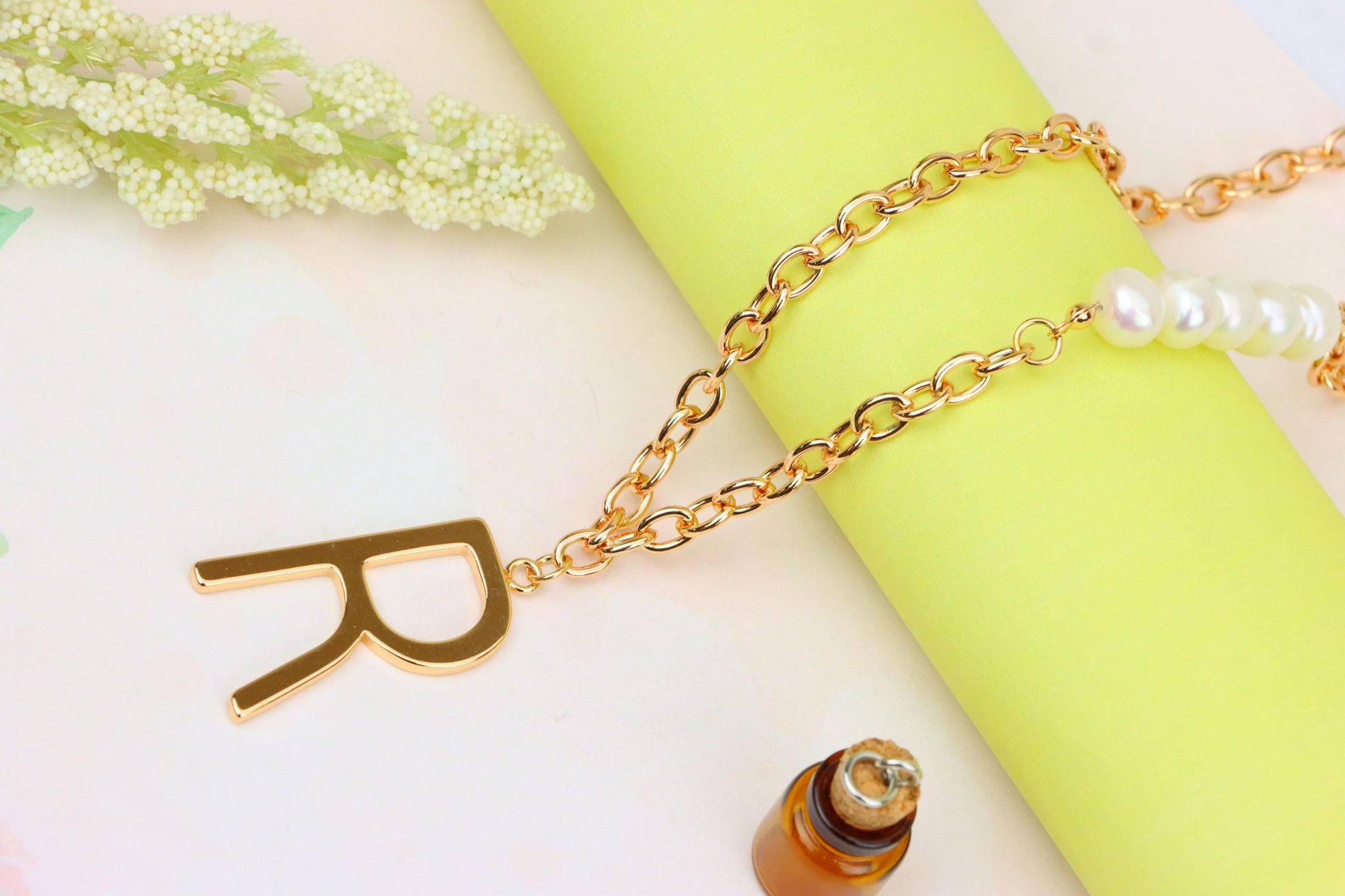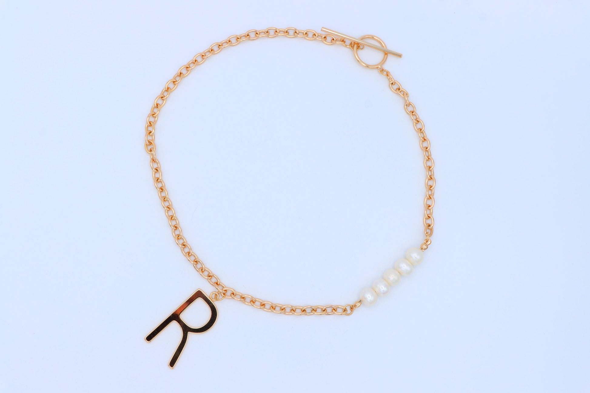 Elegant and chic rose gold necklace featuring a bold 'R' initial and a unique pearl accent. Perfect for adding a personalized touch to any outfit.