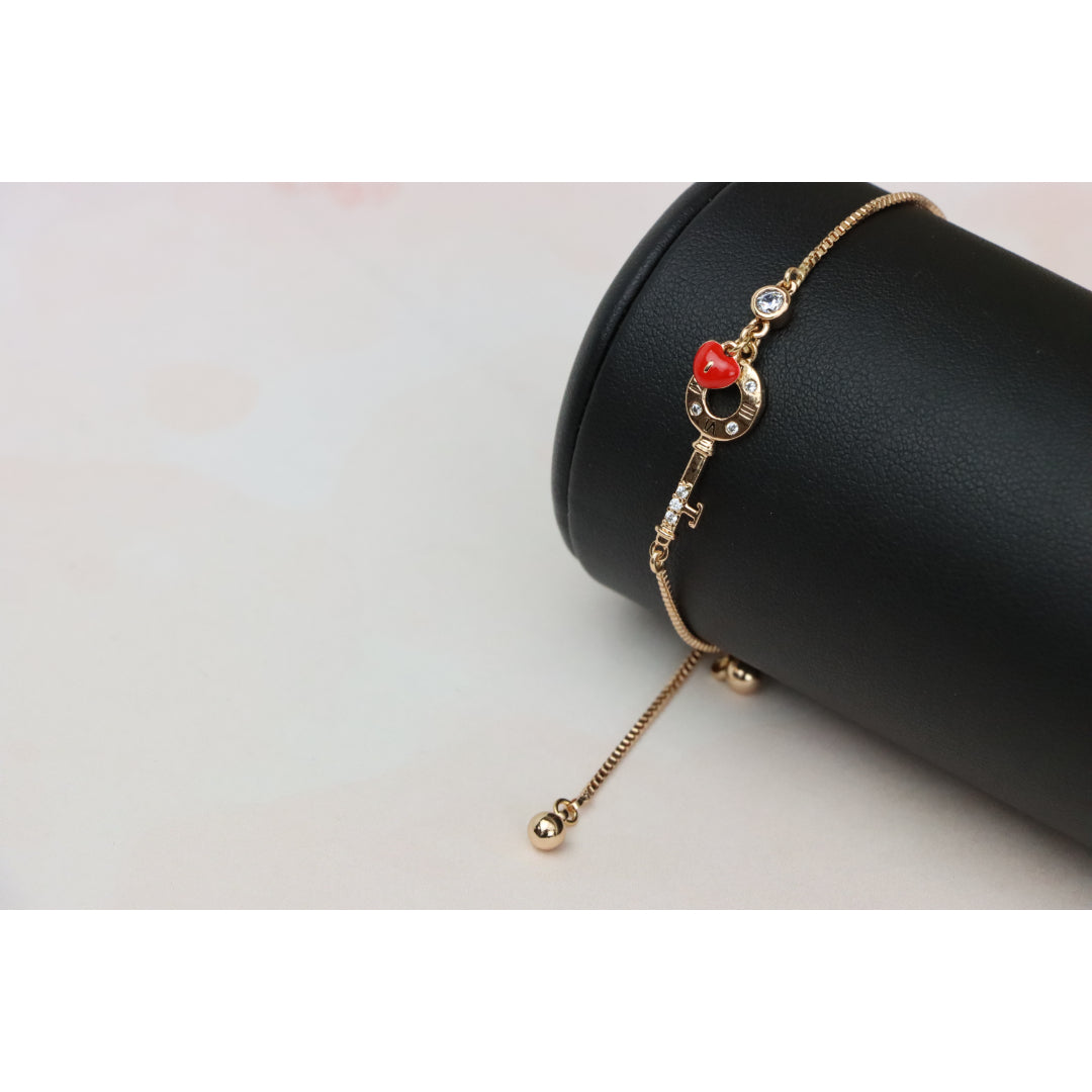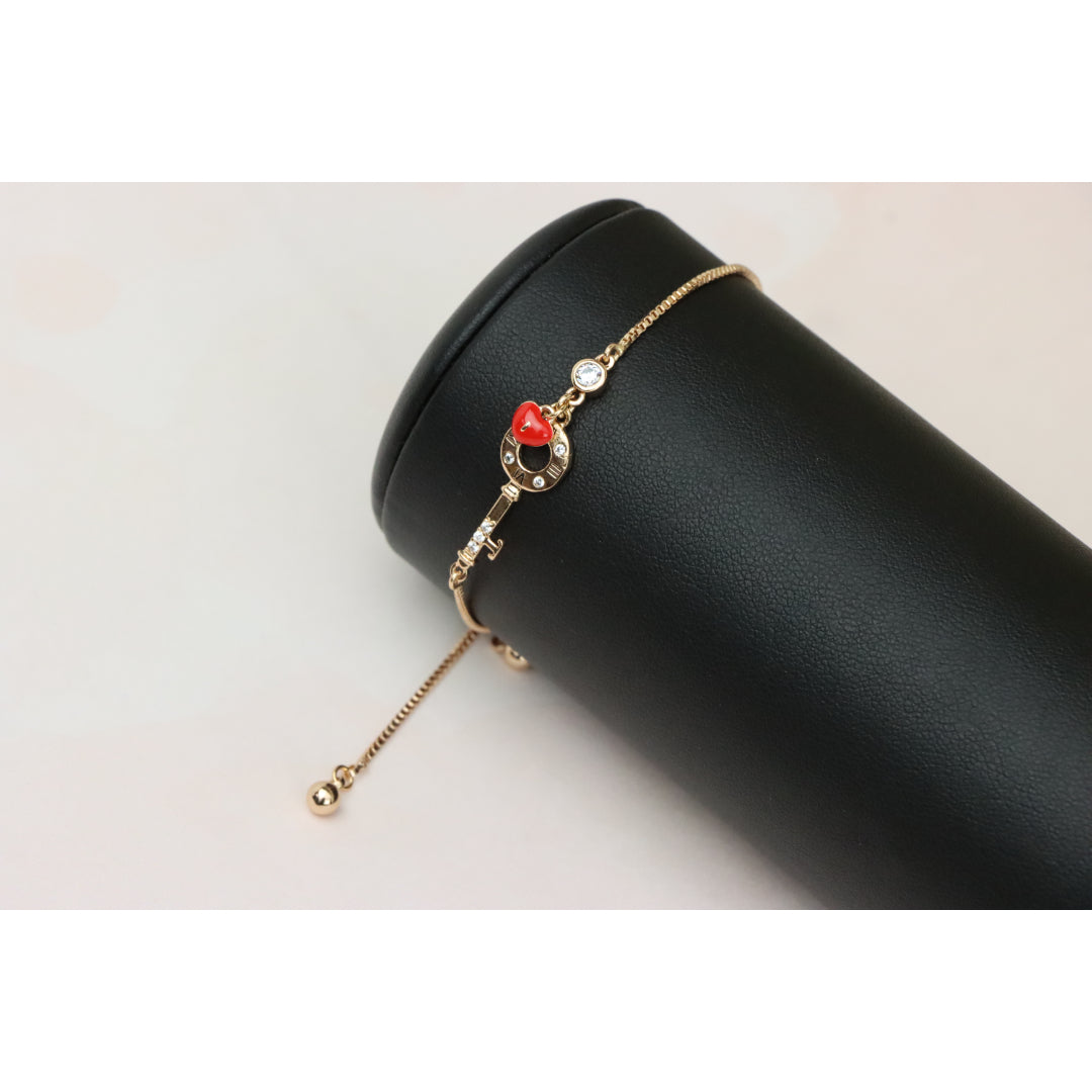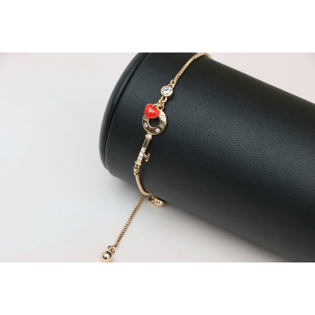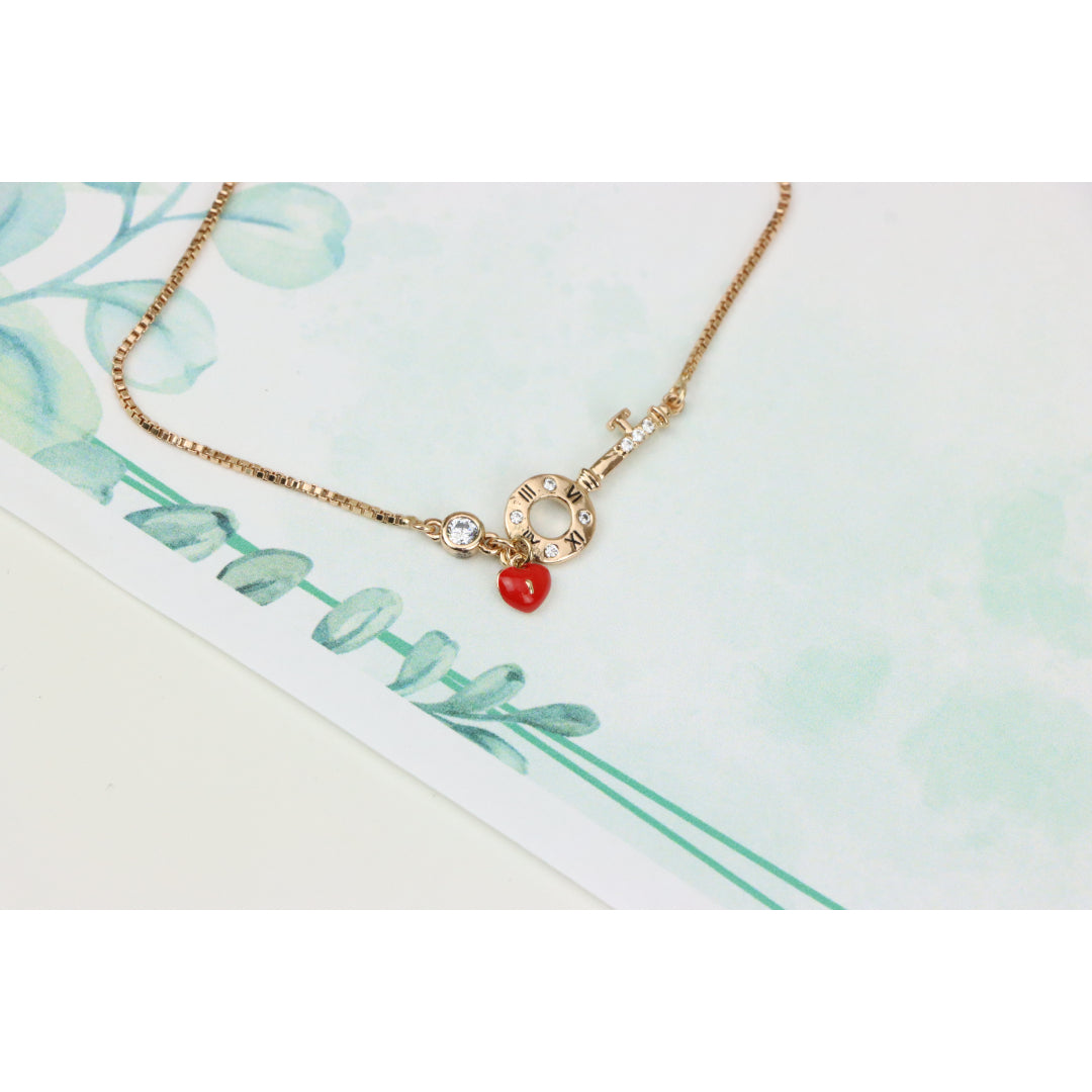 Elevate your style with this charming Rose Gold A-Bracelet, featuring a delicate key and red heart charm for a playful, elegant touch.