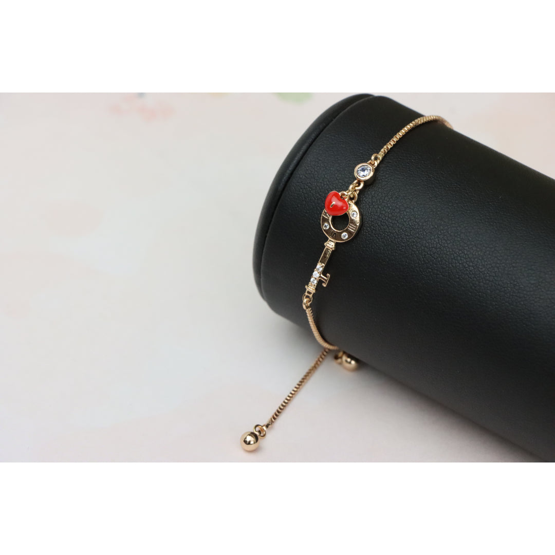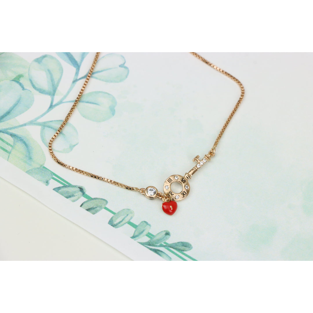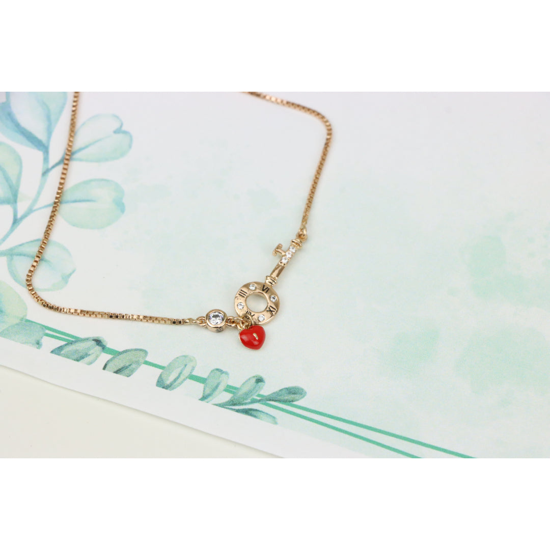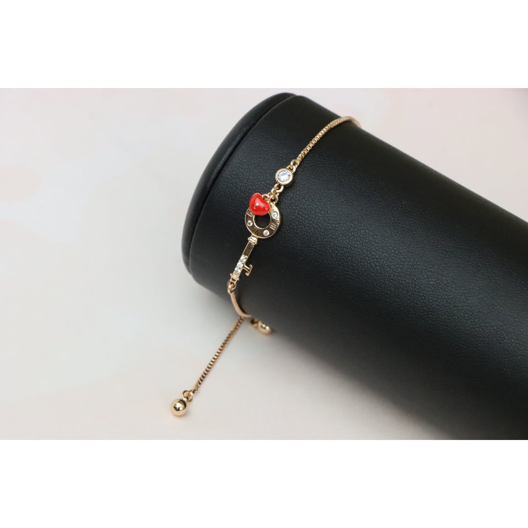 Elevate your style with this charming Rose Gold A-Bracelet, featuring a delicate key and red heart charm for a playful, elegant touch.