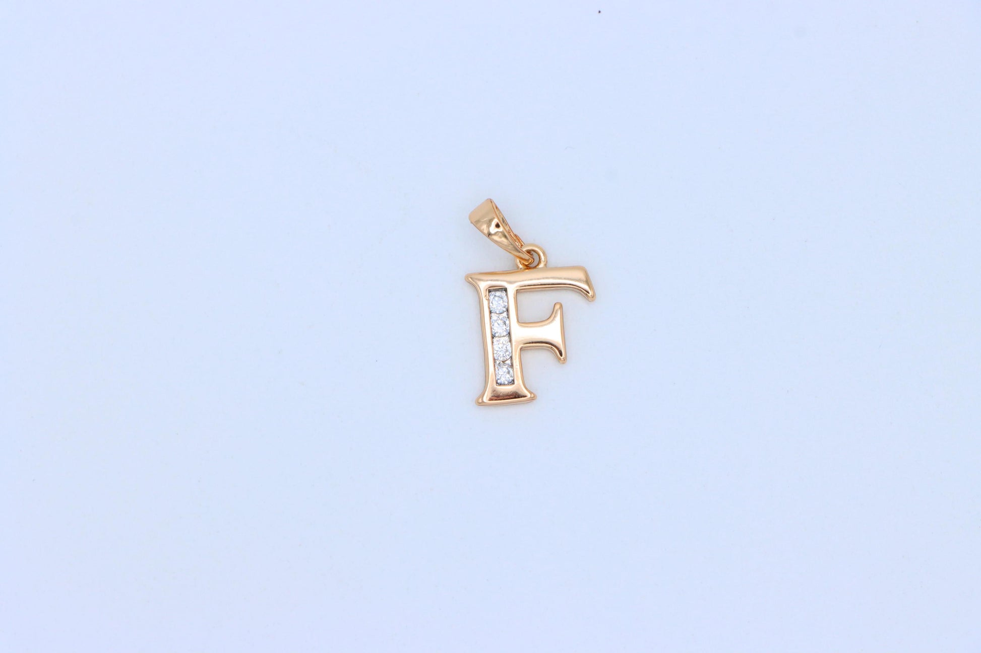 Sophisticated rose gold letter "F" pendant, adorned with sparkling crystals. Expertly crafted from high-quality brass and finished in radiant 18K gold plating.