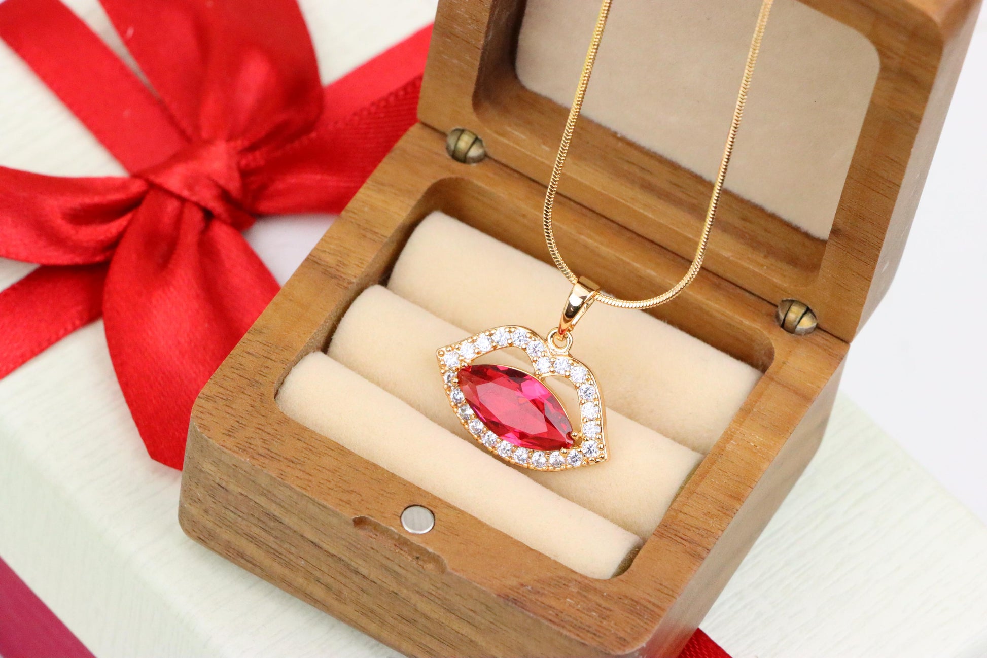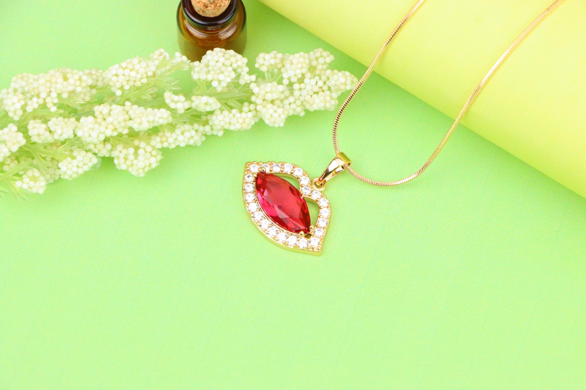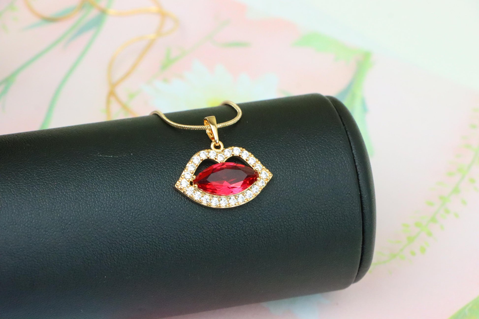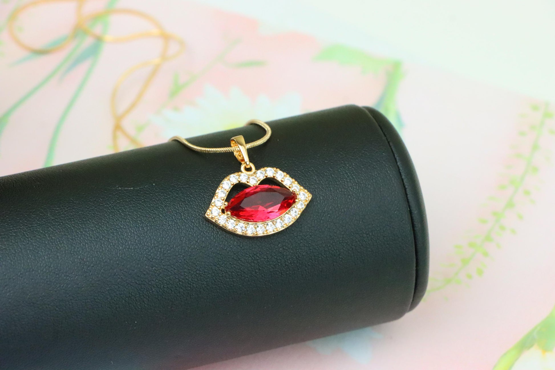 Eye-catching lips-shaped pendant with a red marquise center stone and sparkling crystals, crafted for a bold fashion statement.