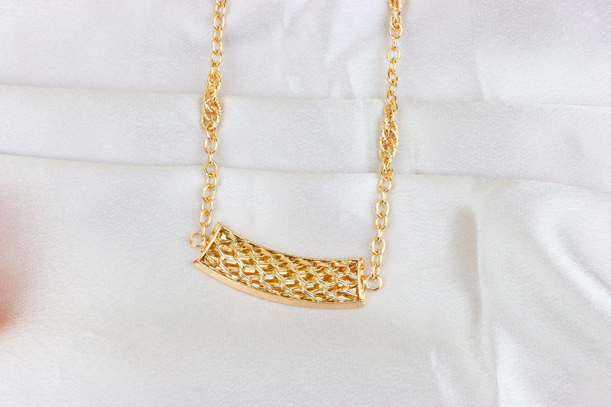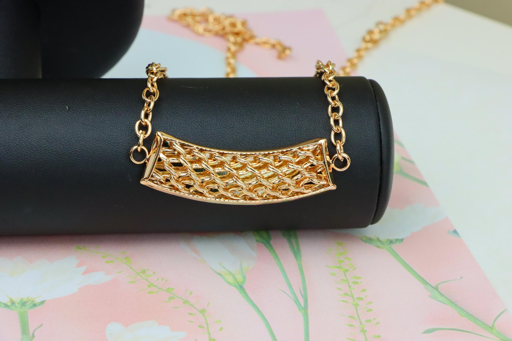 Bold and elegant rose gold necklace featuring a curved textured centerpiece and intricate chain design for standout style.