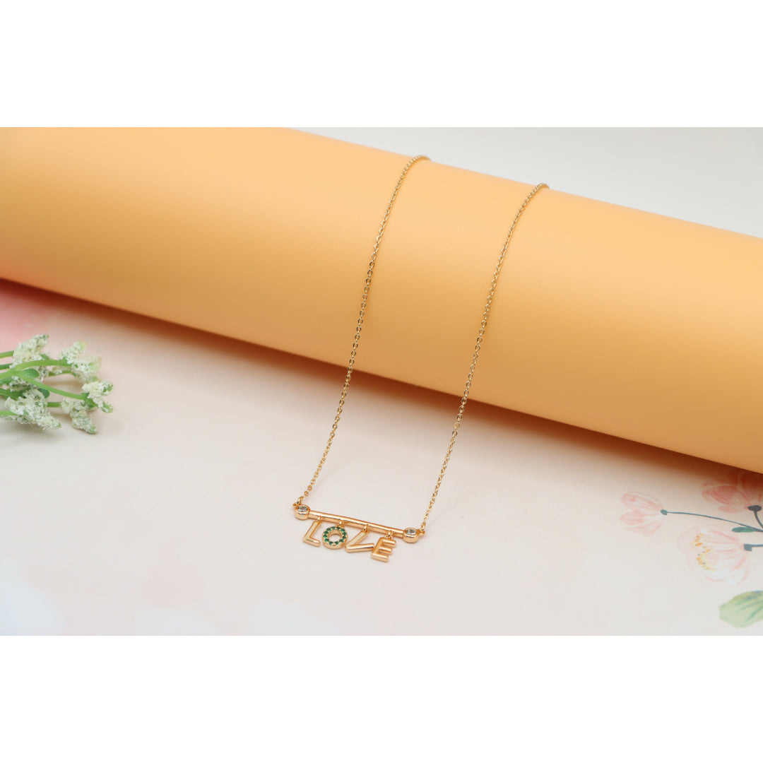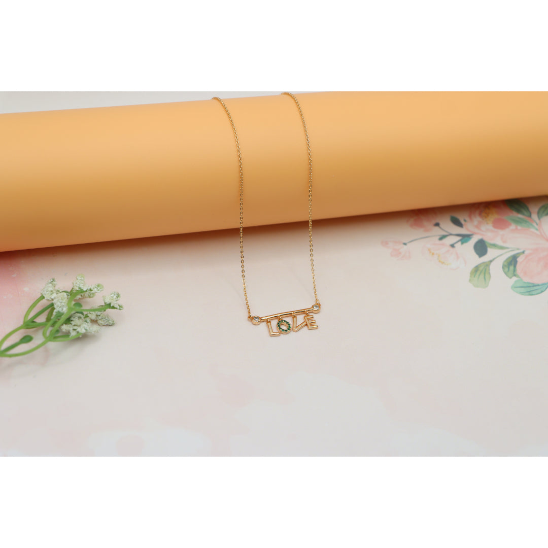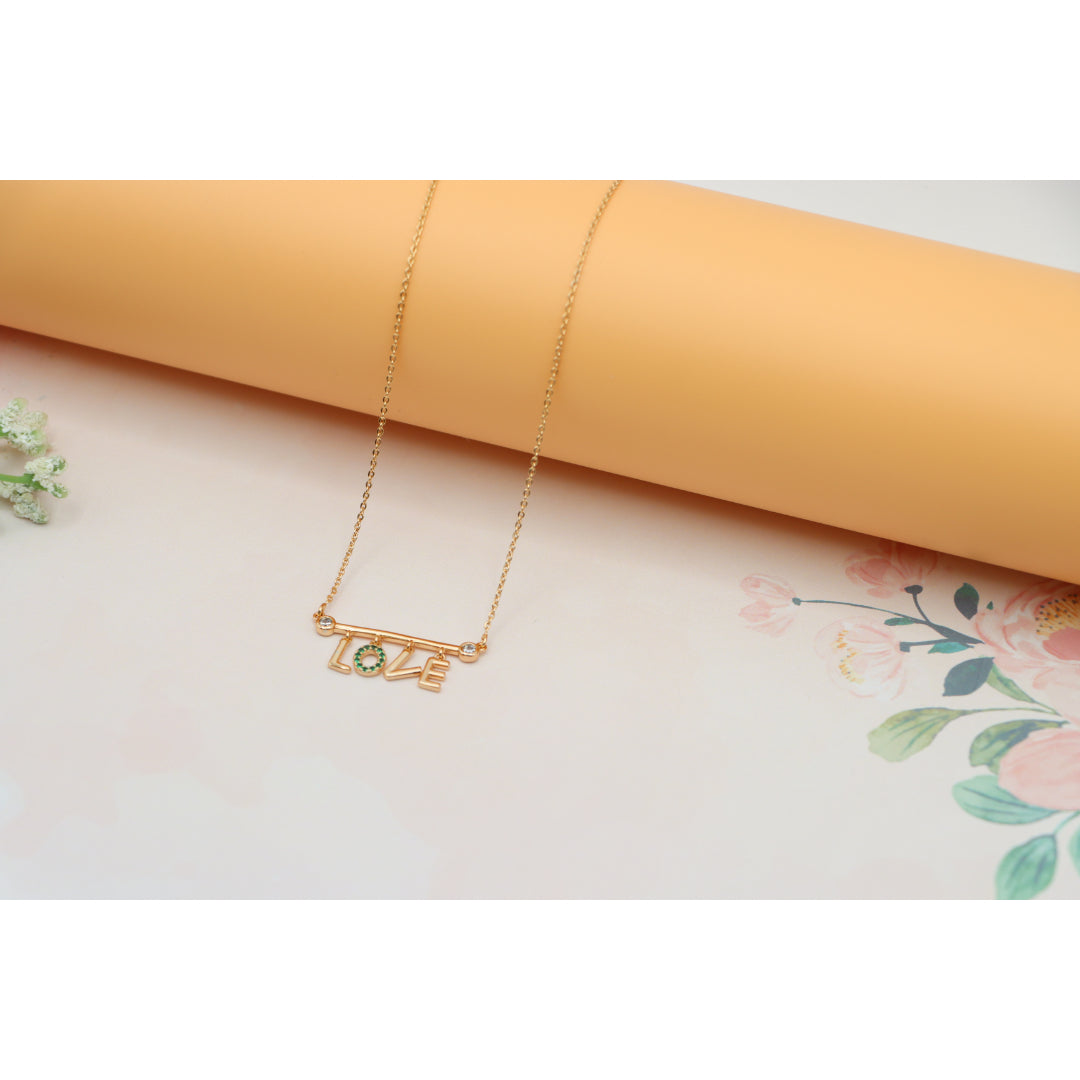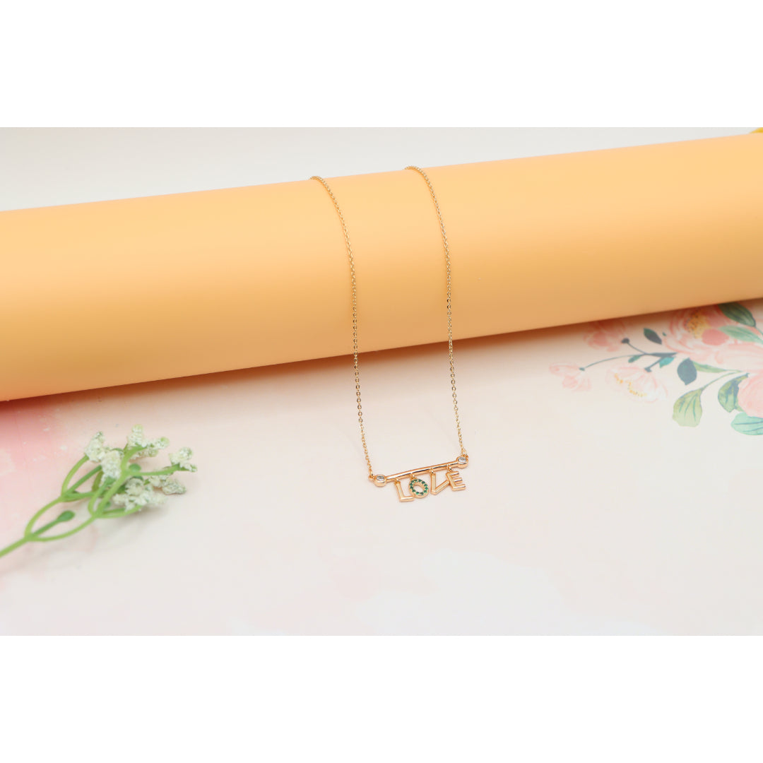 A delicate rose gold necklace featuring a playful “LOVE” pendant, with the "O" encrusted in vibrant green stones. Made with gold-plated high-quality brass, it’s elegant, lightweight, and adjustable for the perfect fit.