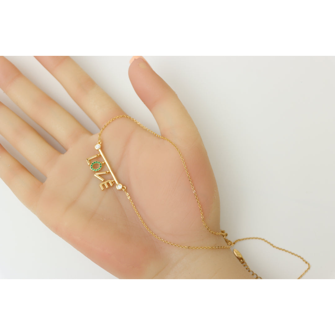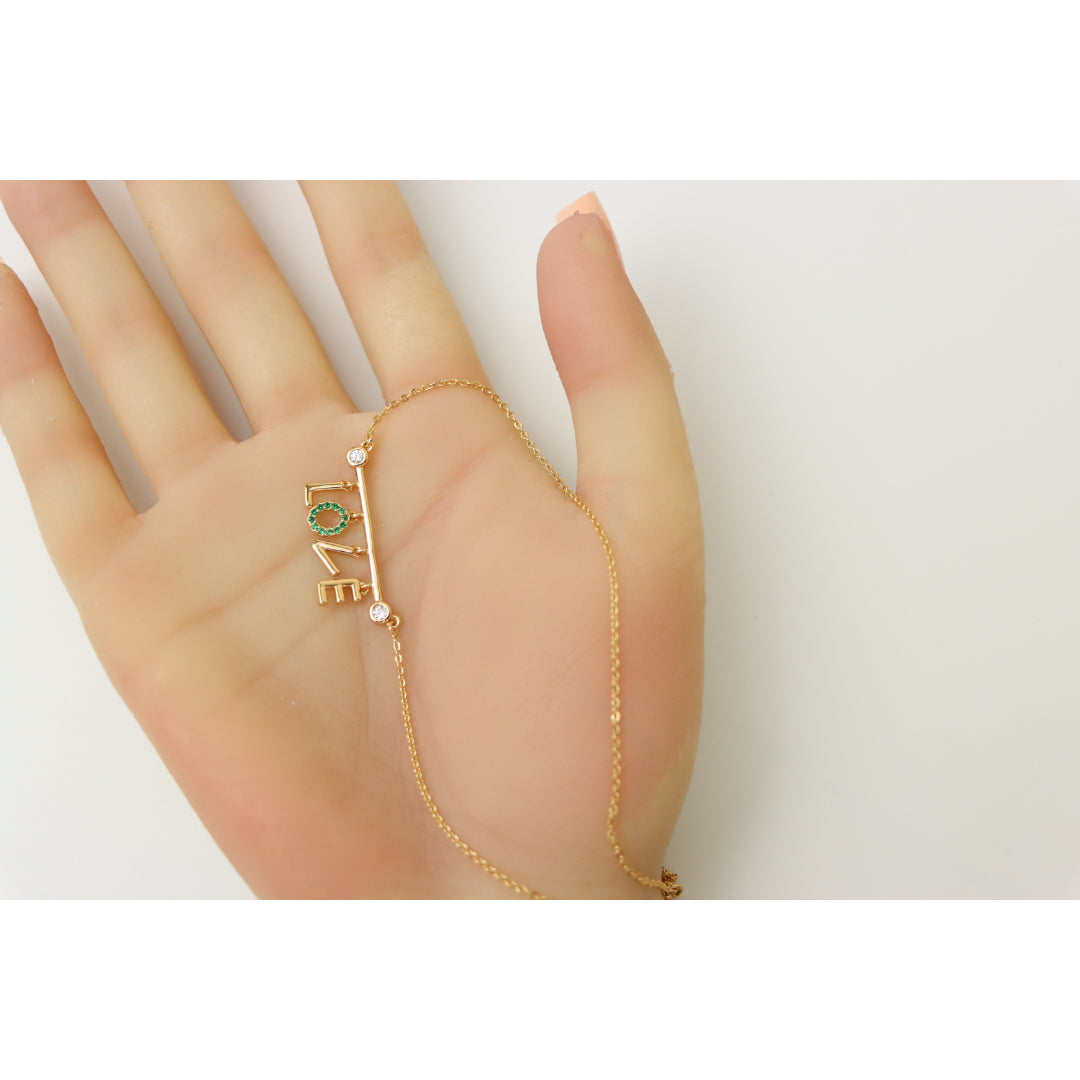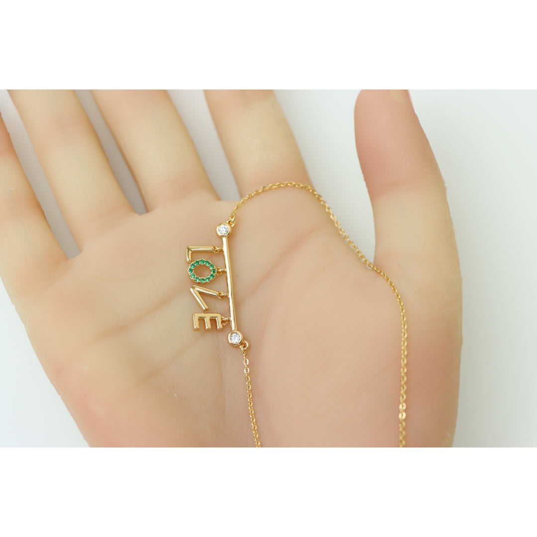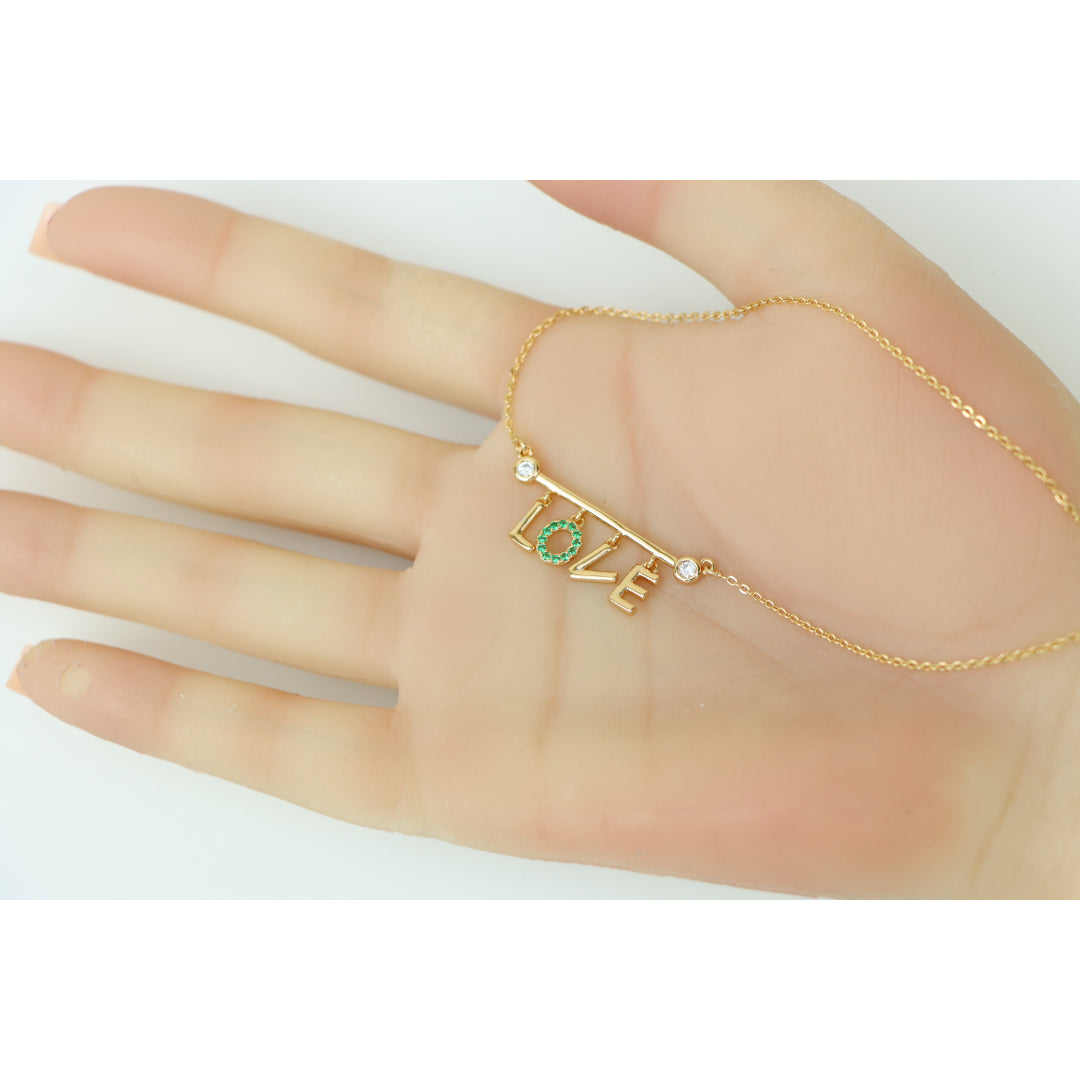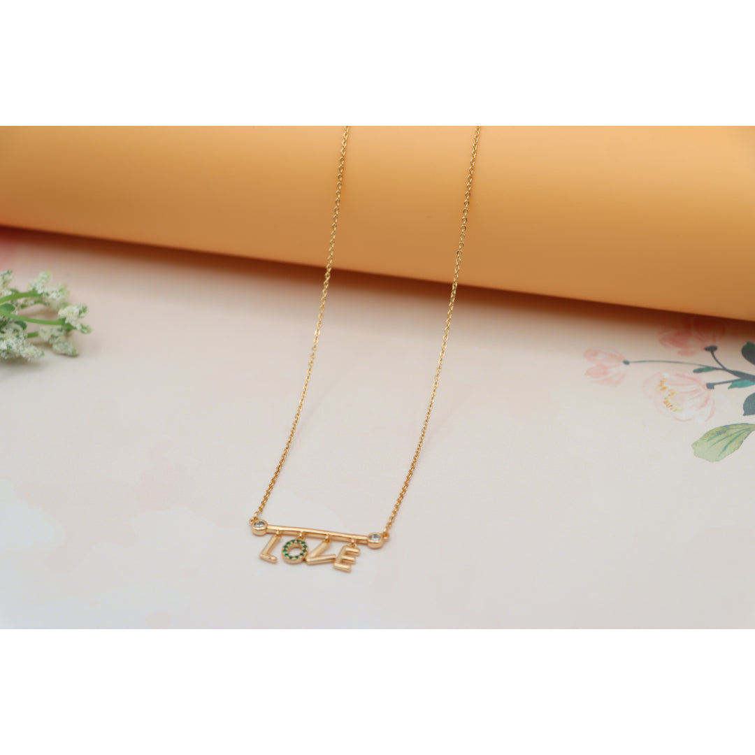 A delicate rose gold necklace featuring a playful “LOVE” pendant, with the "O" encrusted in vibrant green stones. Made with gold-plated high-quality brass, it’s elegant, lightweight, and adjustable for the perfect fit.