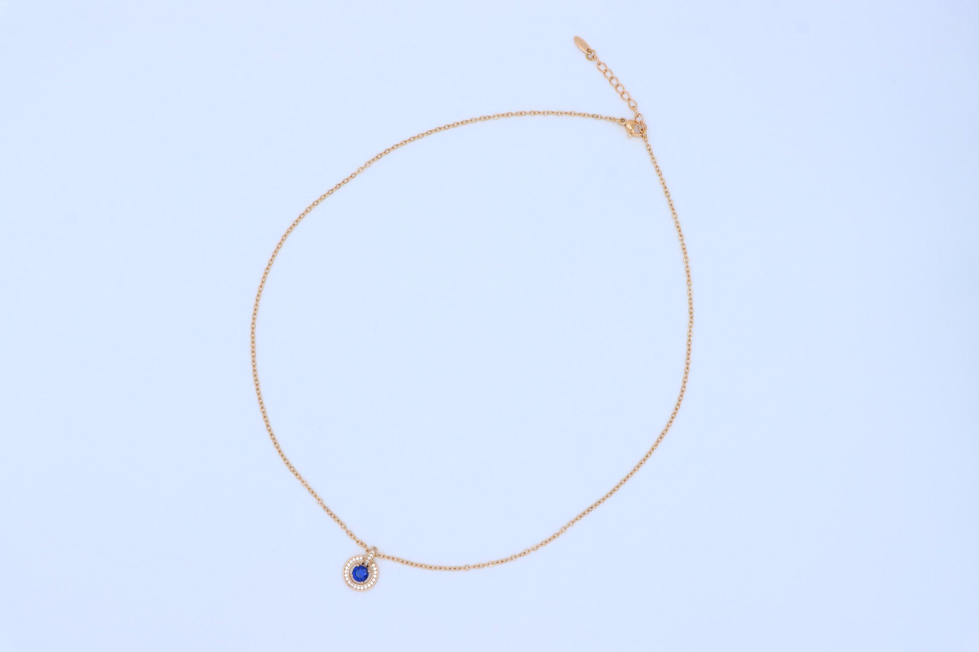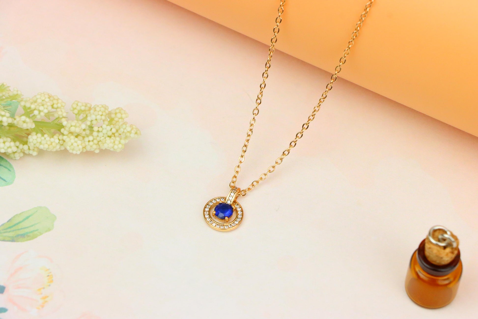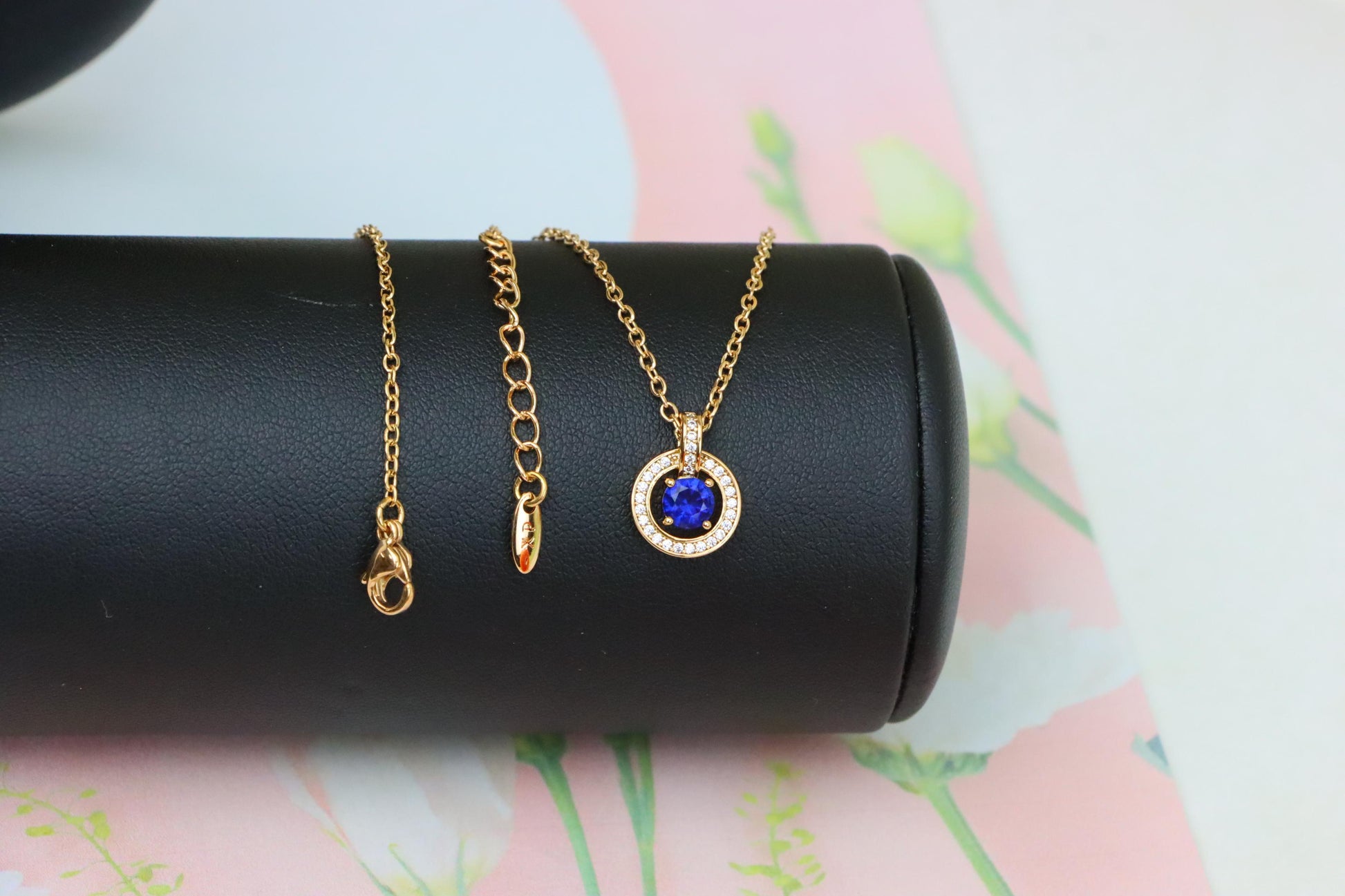 Elegant rose gold necklace featuring a deep blue center stone framed by shimmering crystals in a classic circular pendant.