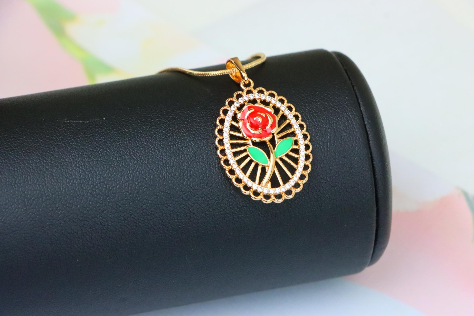 Rose Gold Oval Pendant with Red Rose and Green Leaf Enamel Design, XPPT1379