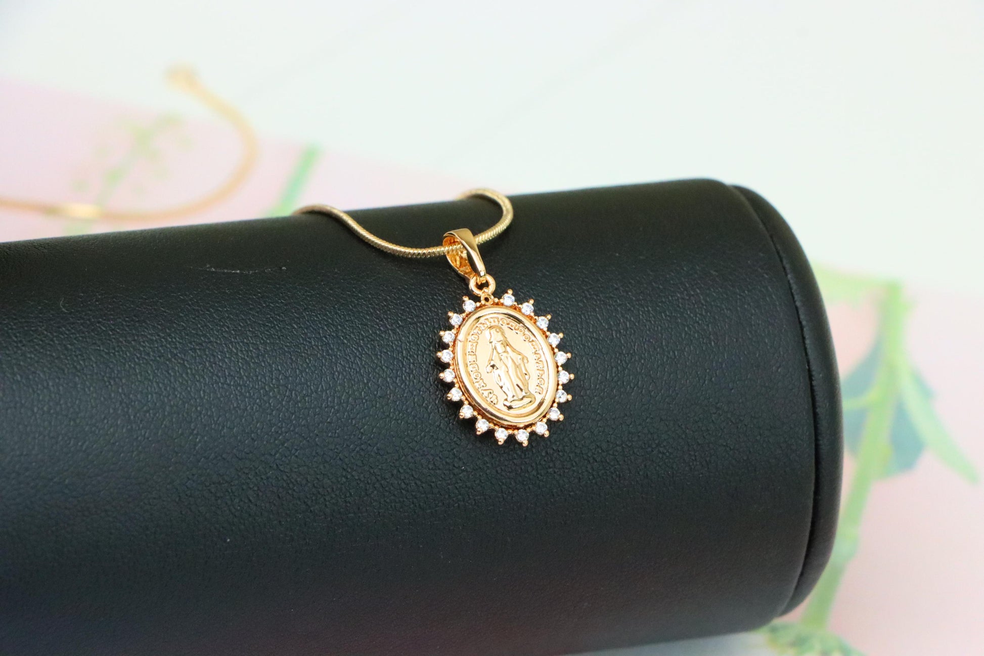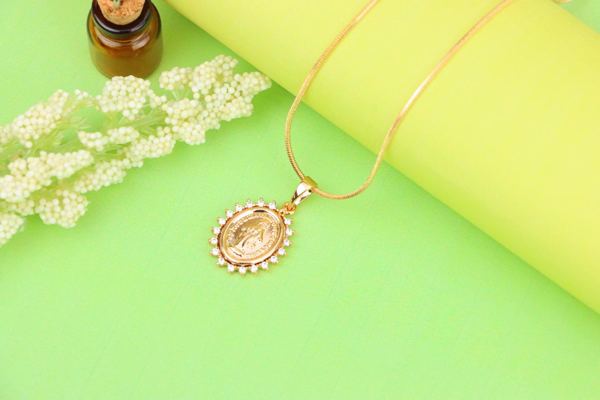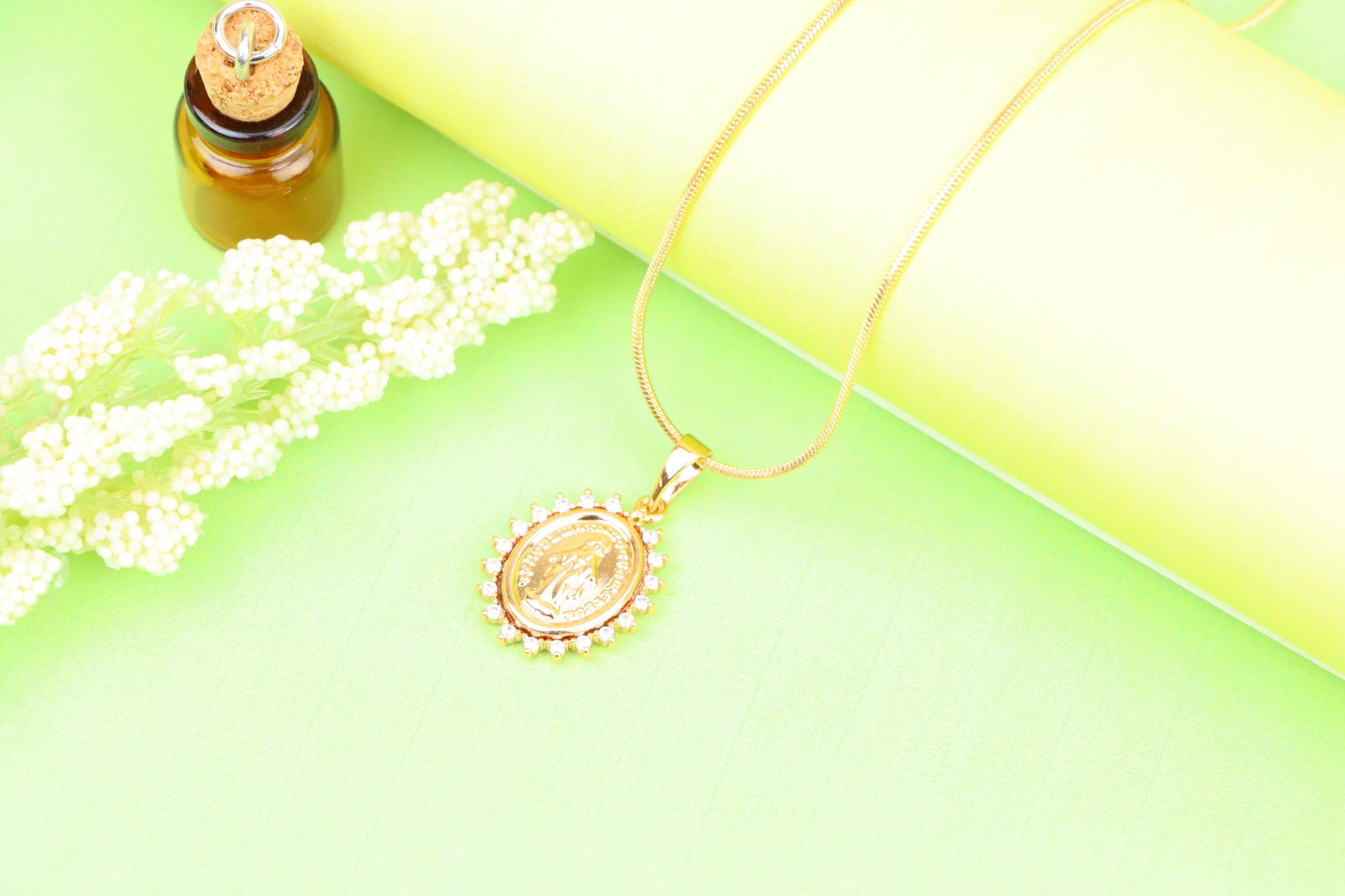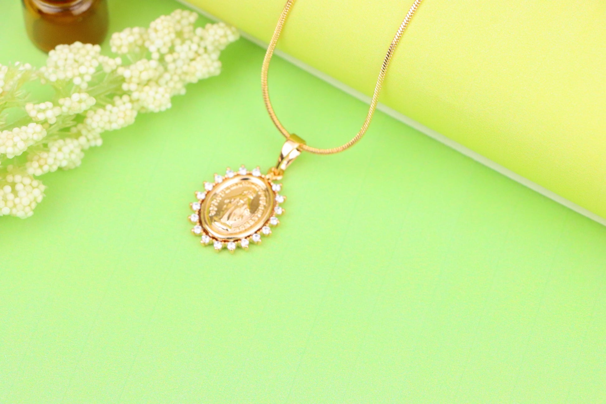 Gracefully designed oval pendant with a religious motif and elegant stone accents.