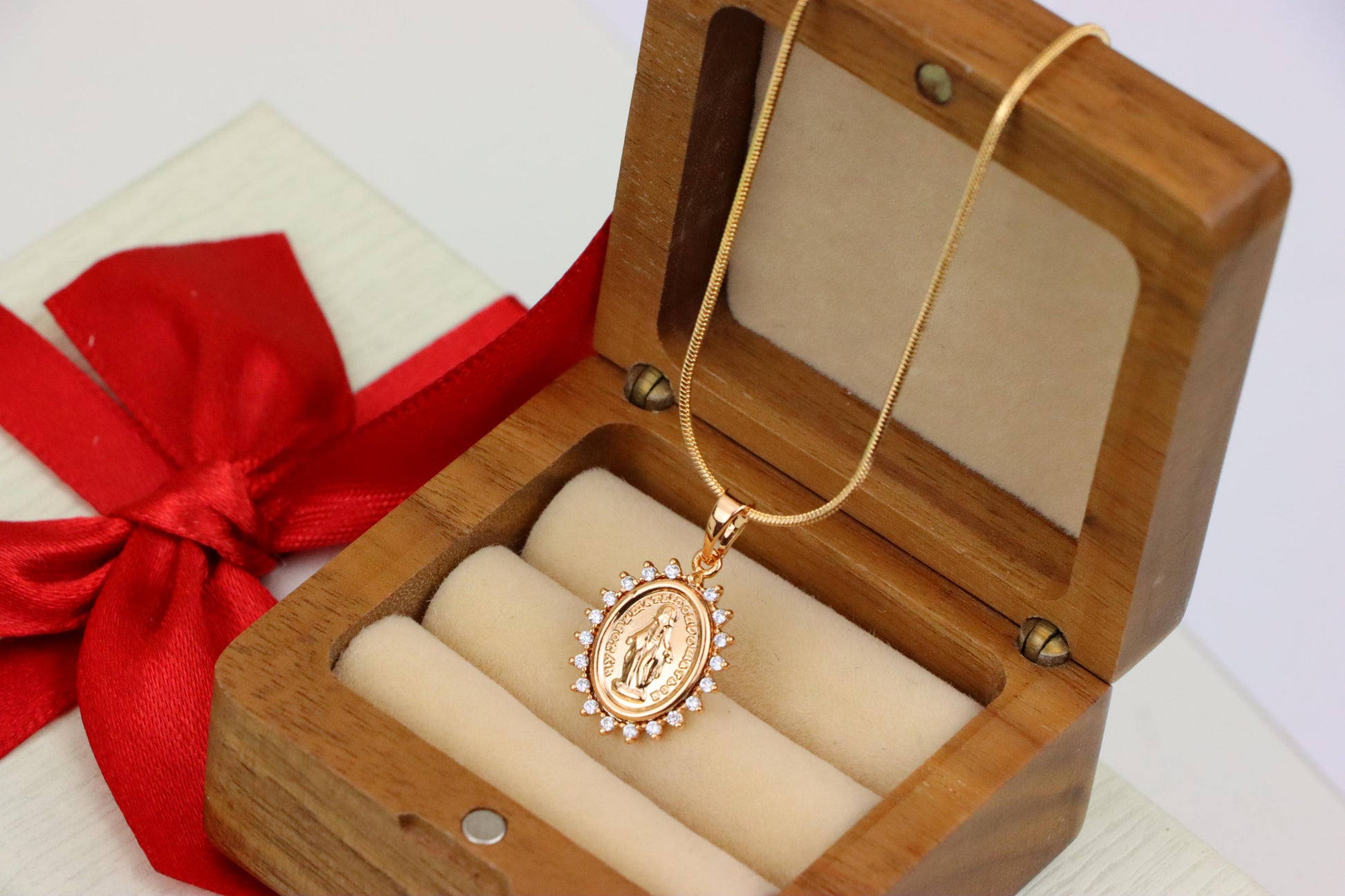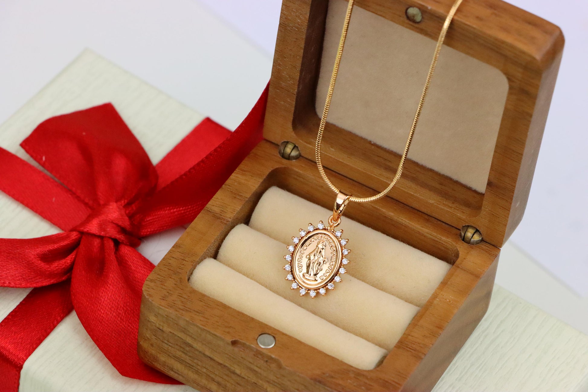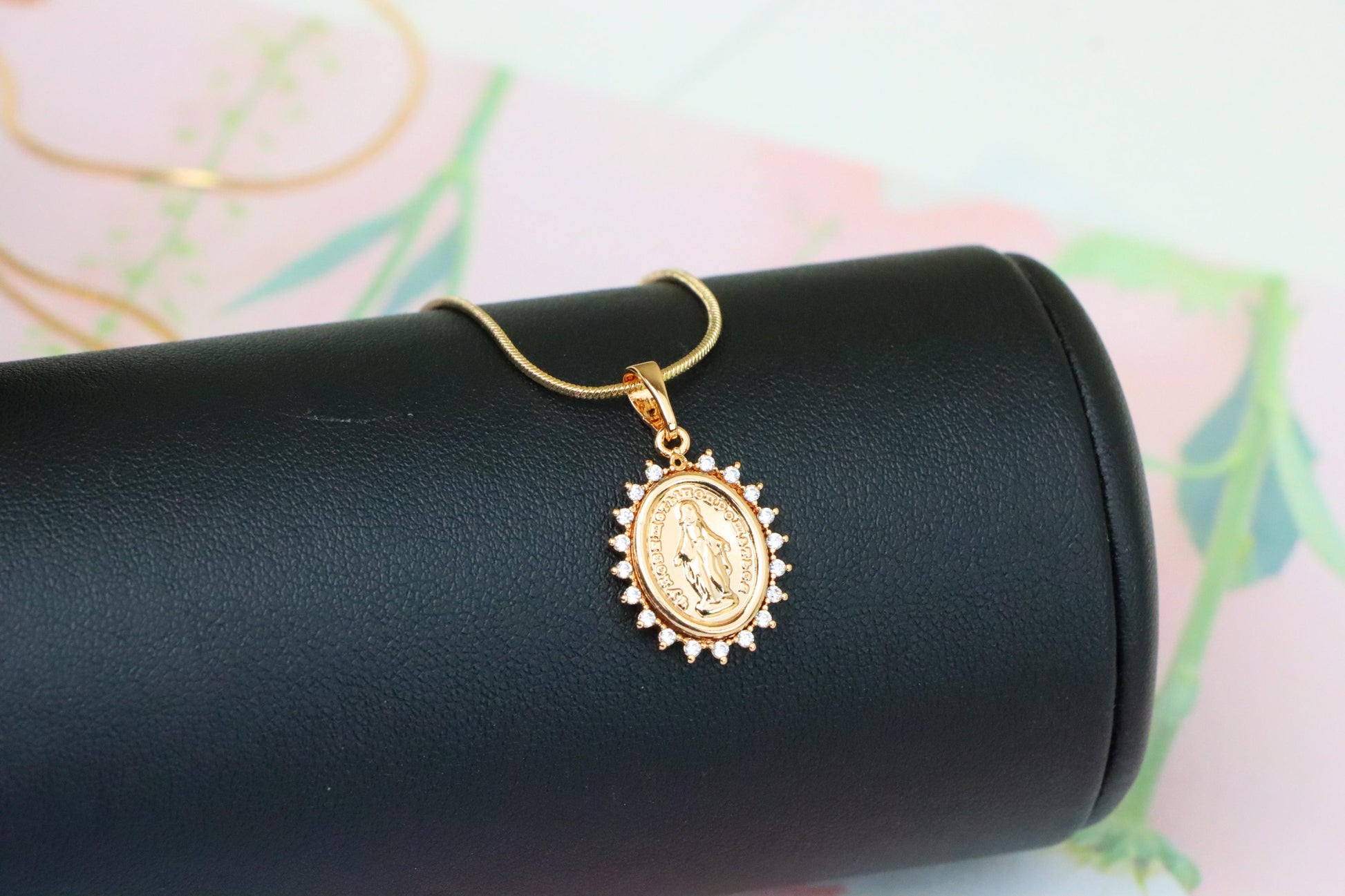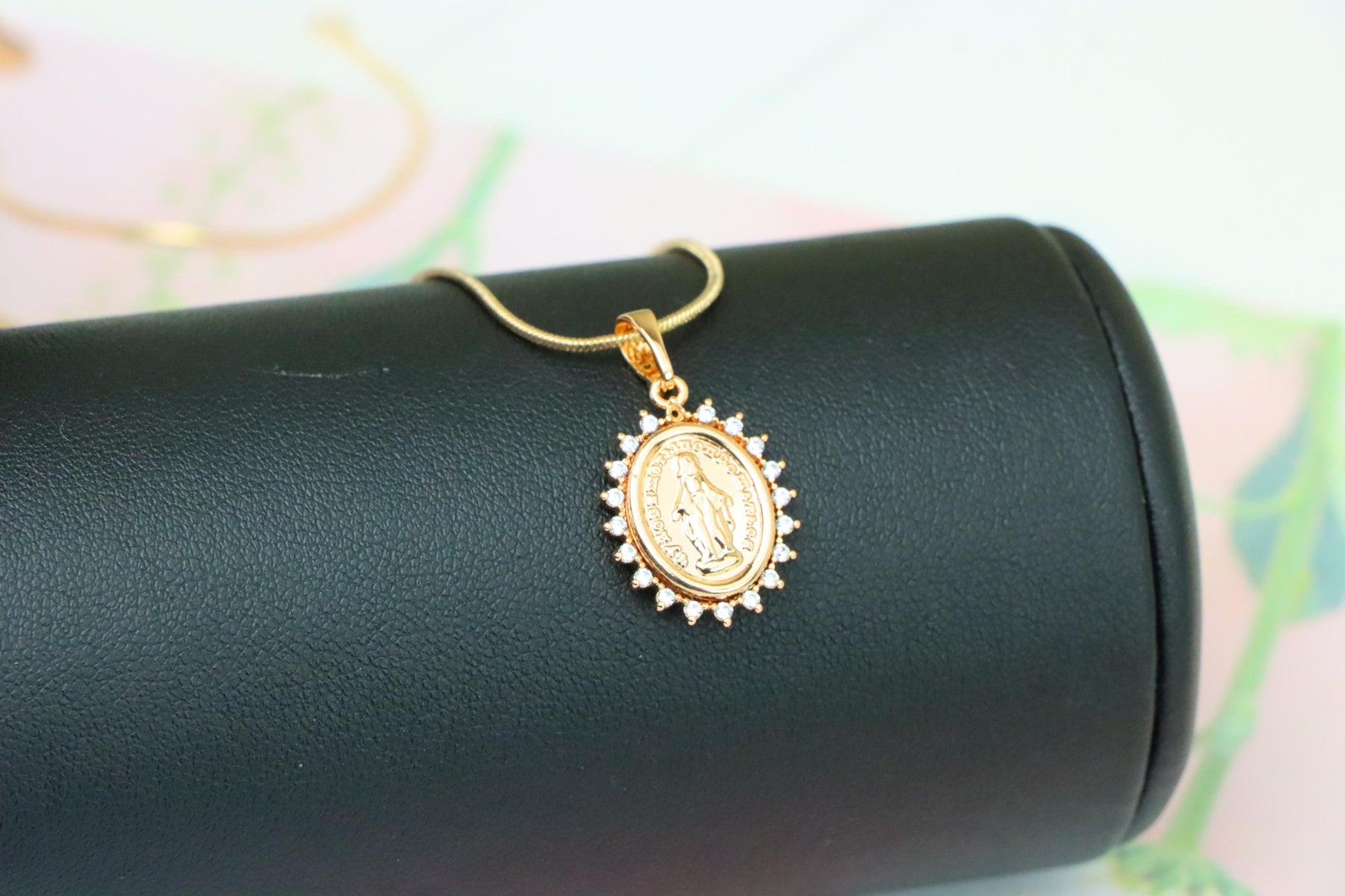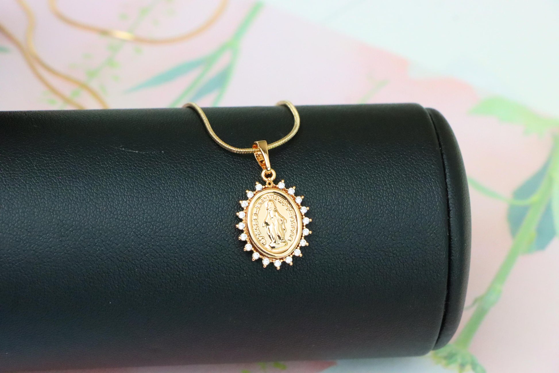 Gracefully designed oval pendant with a religious motif and elegant stone accents.