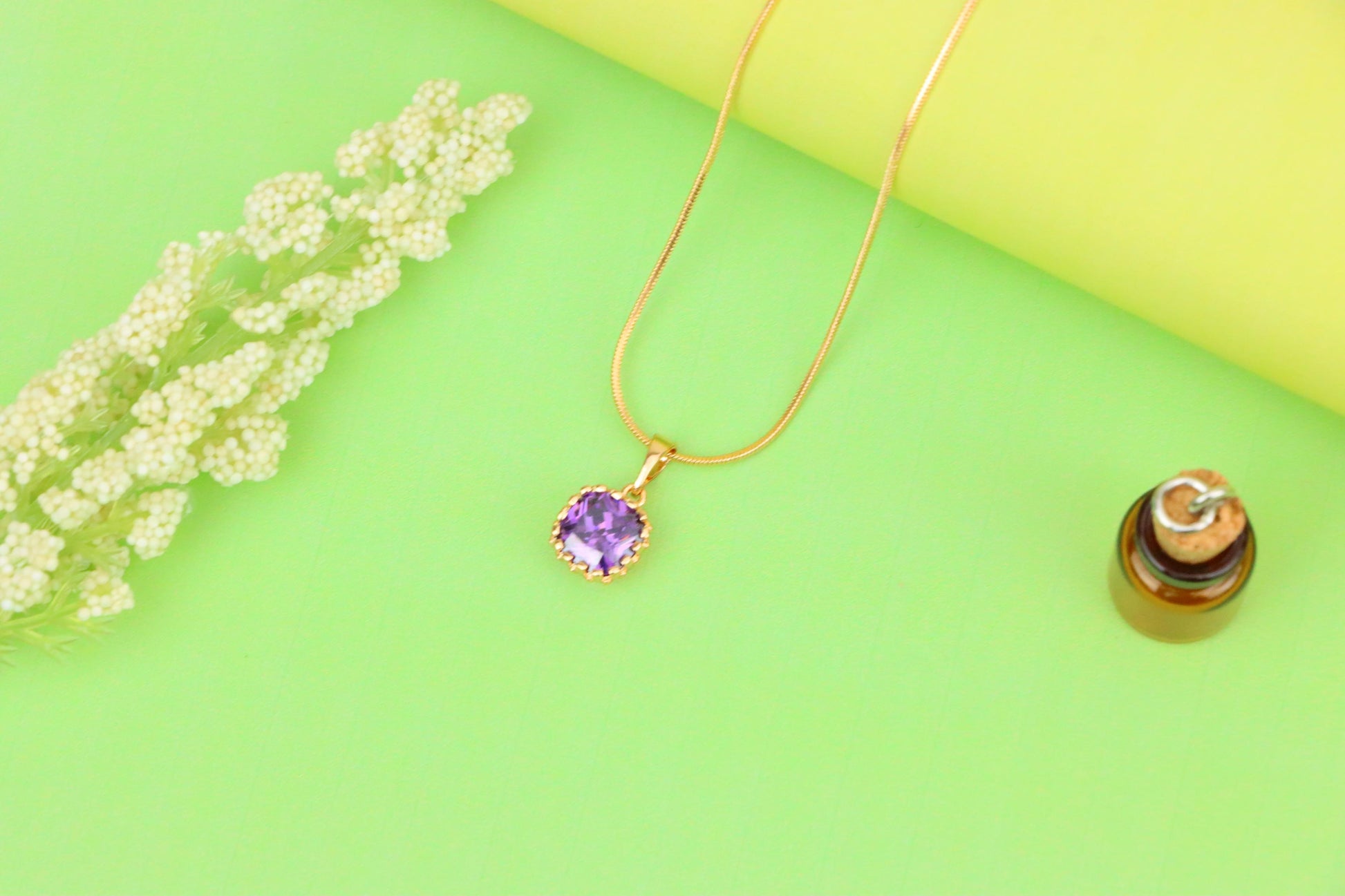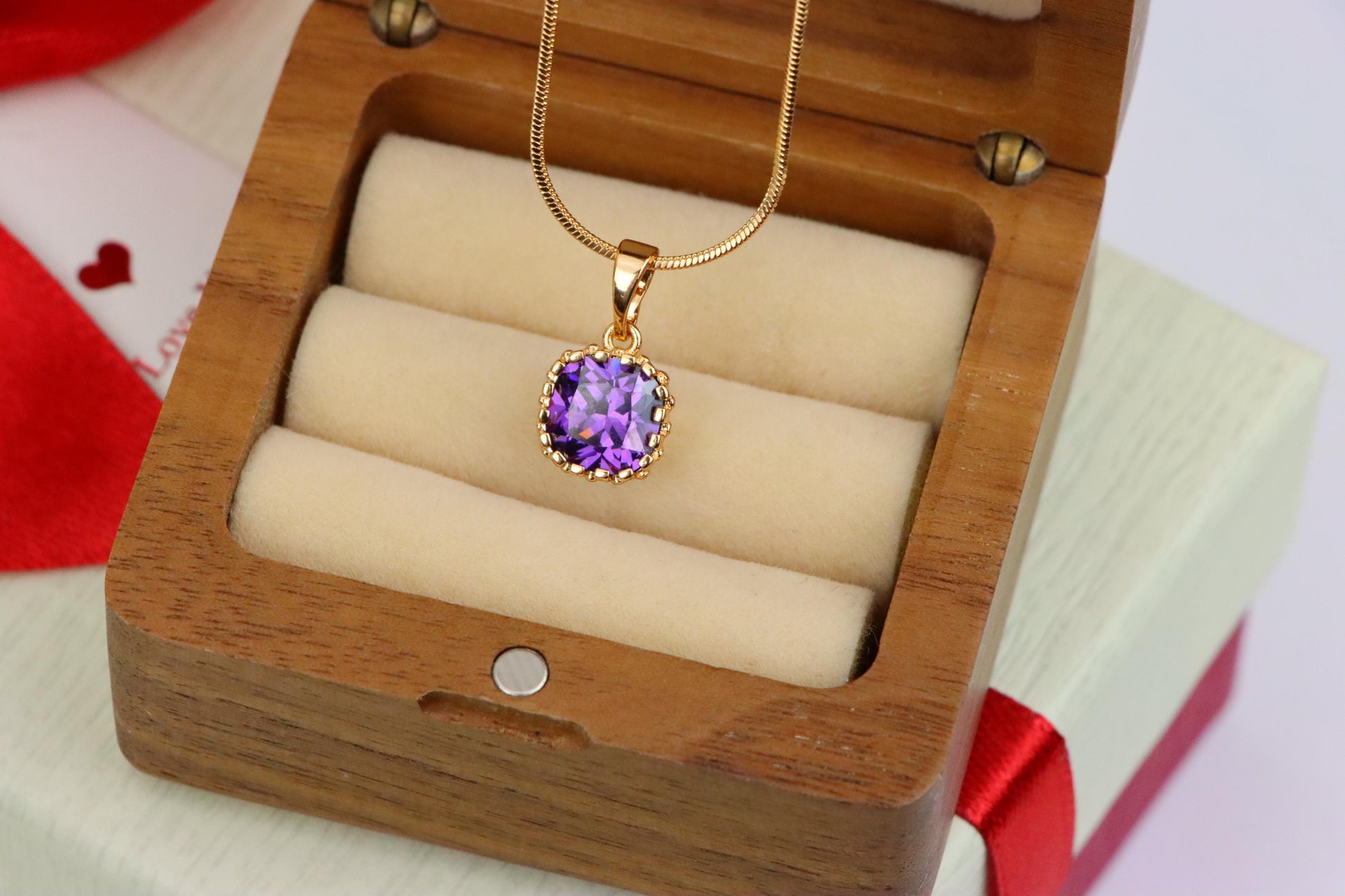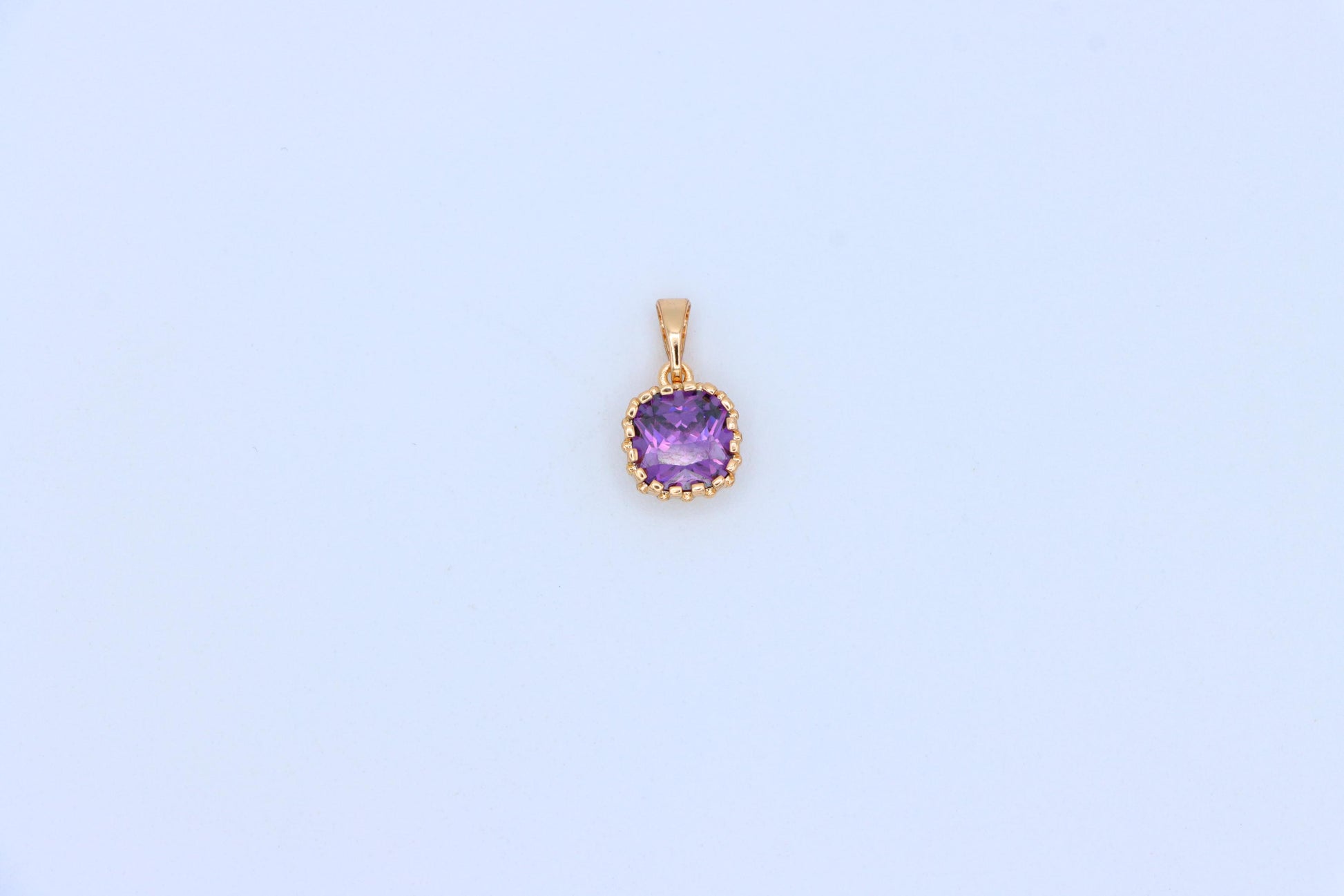 This charming rose gold pendant showcases a radiant purple cushion-cut stone framed with delicate beaded detailing for a graceful, feminine touch.