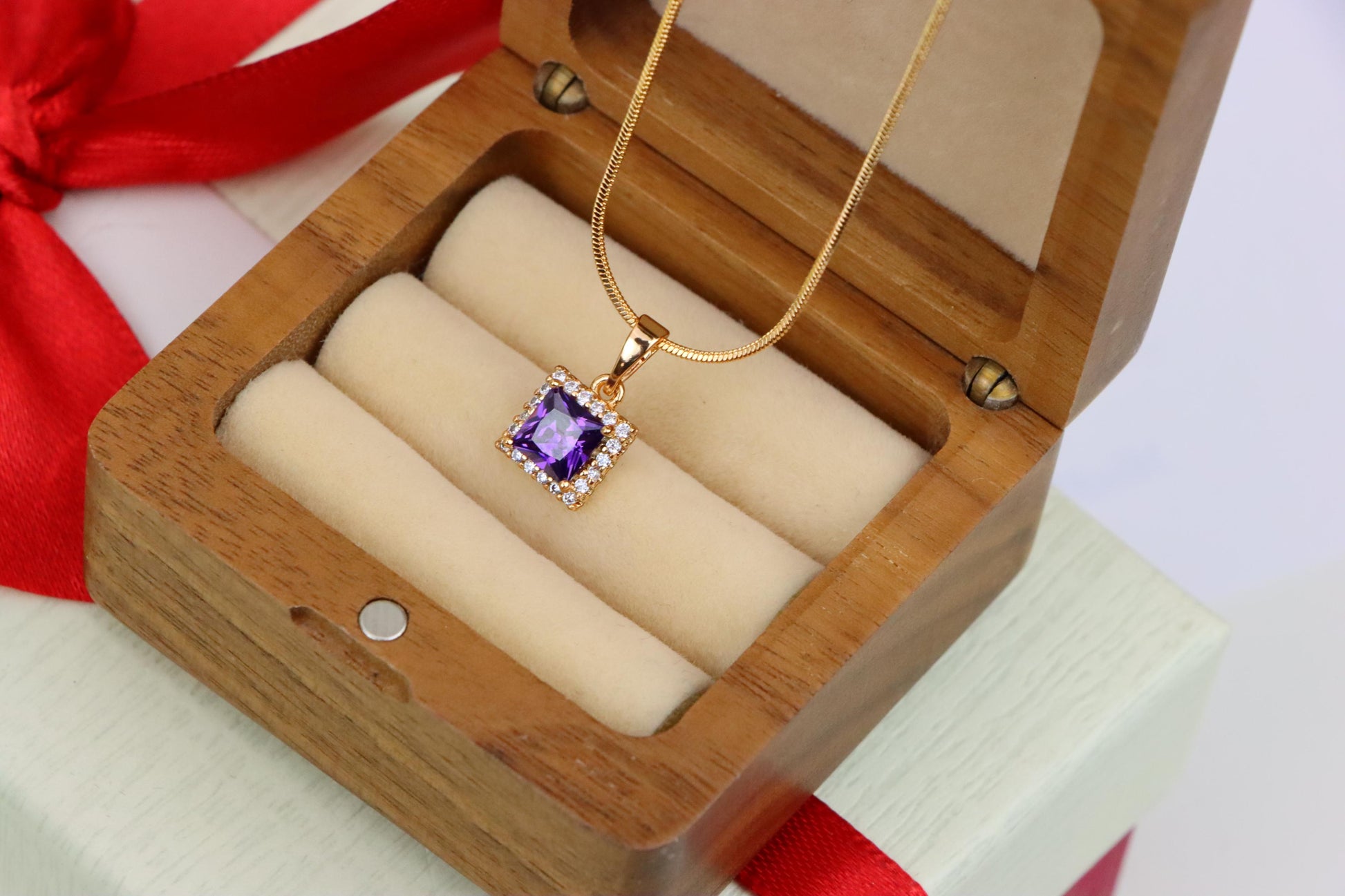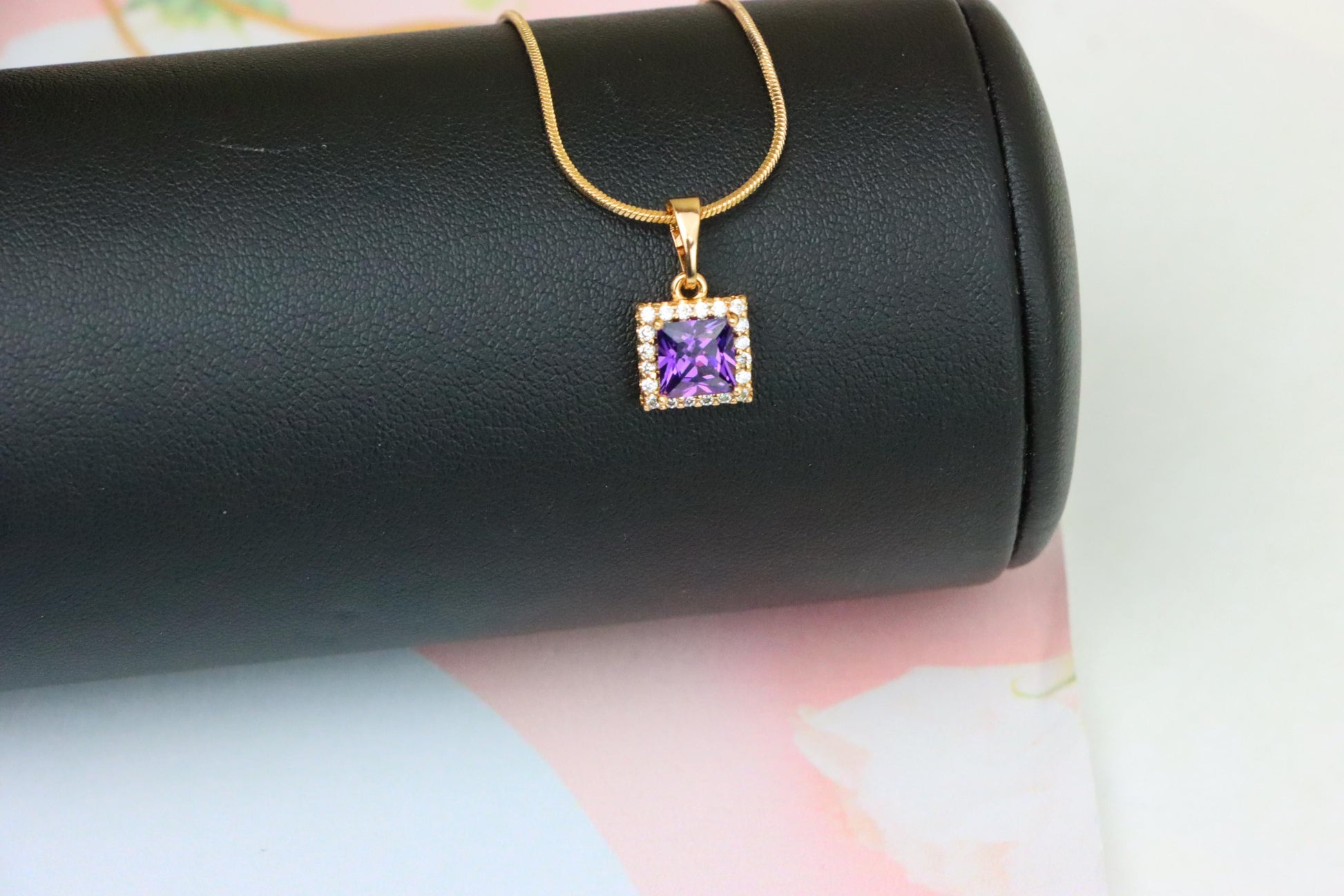 A petite and glamorous pendant featuring a square-cut purple stone bordered by sparkling crystals, perfect for adding charm to any look.